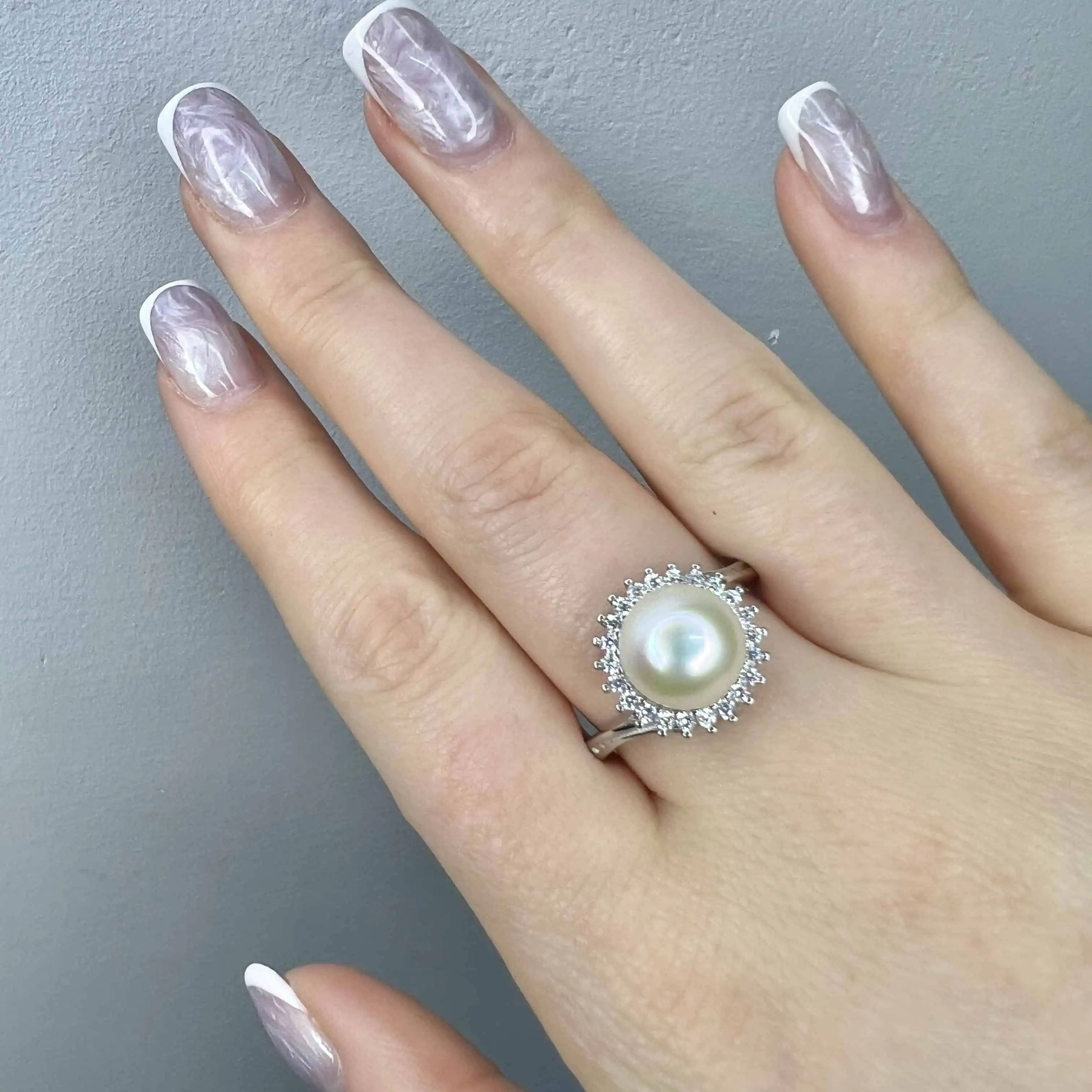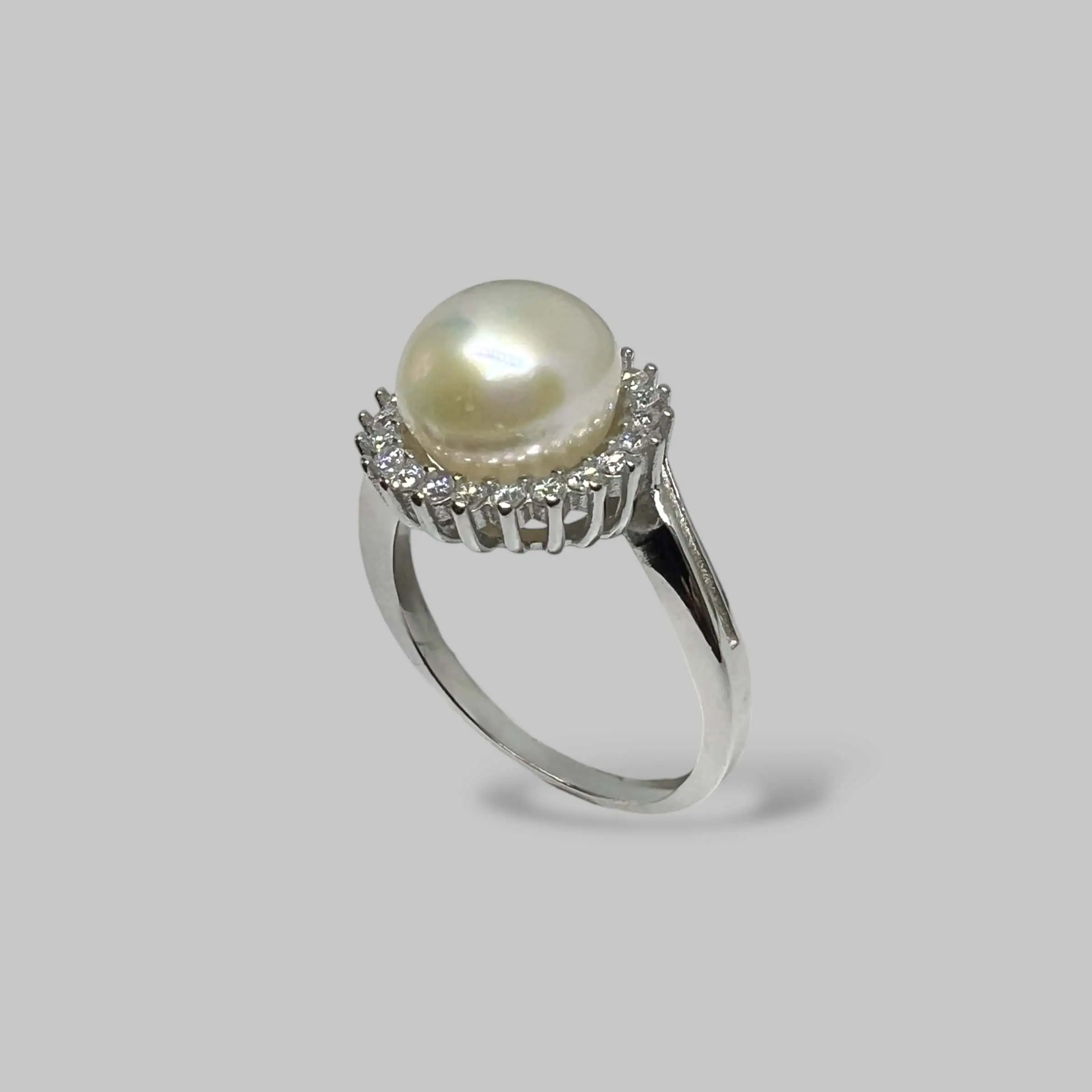 Вишукана срібна каблучка з великою білою перлиною, що оточена вінком із яскравих прозорих цирконів. Класичний дизайн у поєднанні з м'яким перламутровим блиском створює атмосферу справжньої розкоші та елегантності.