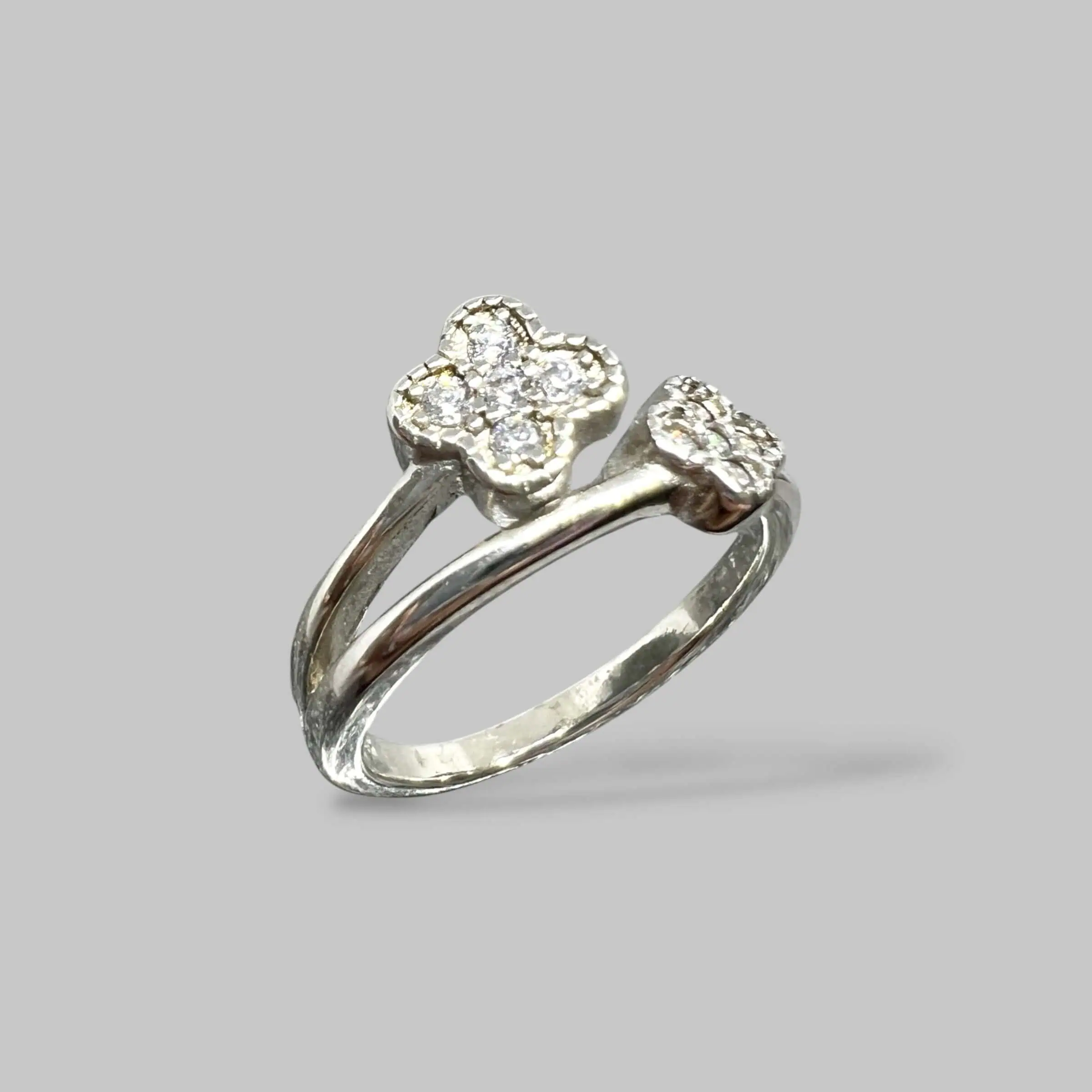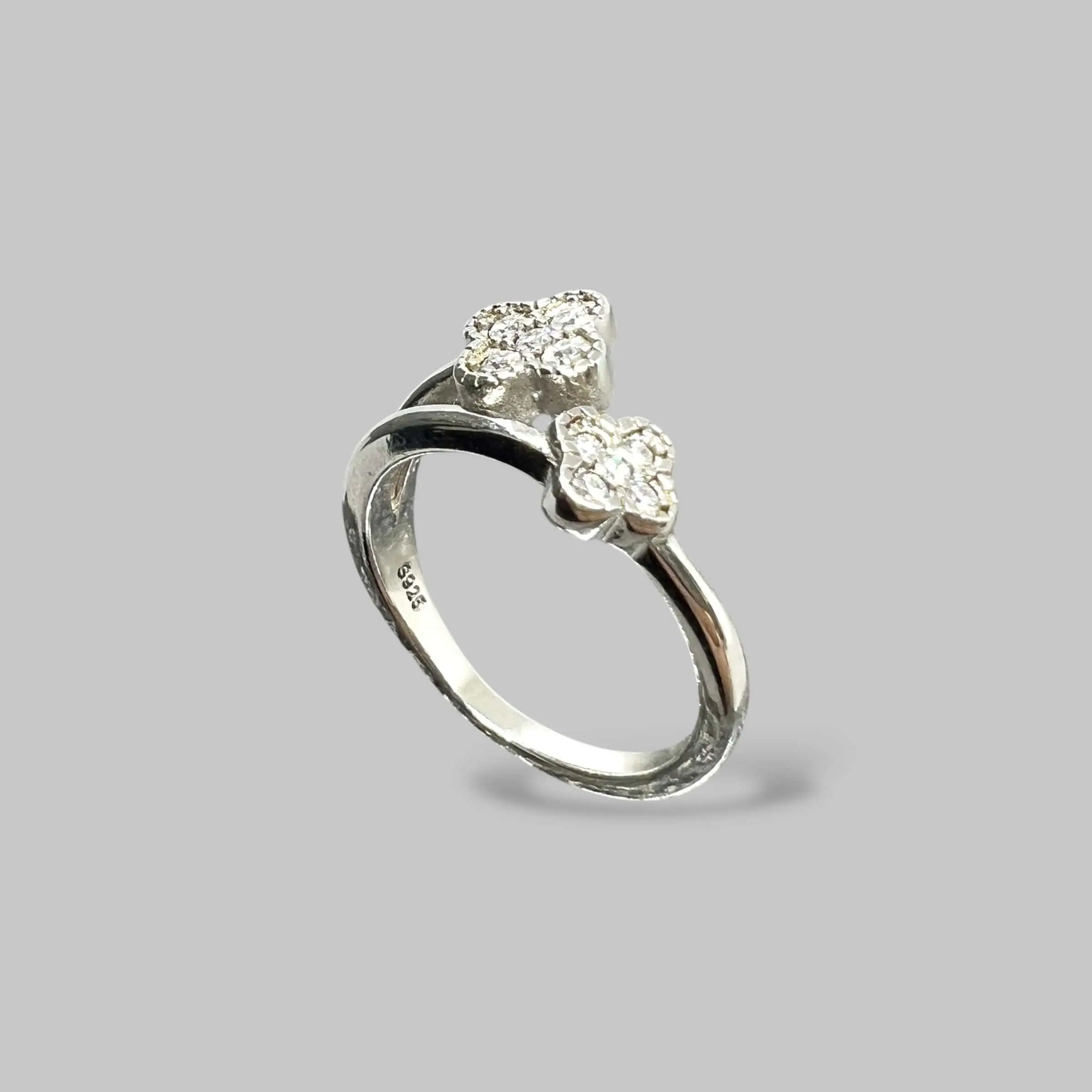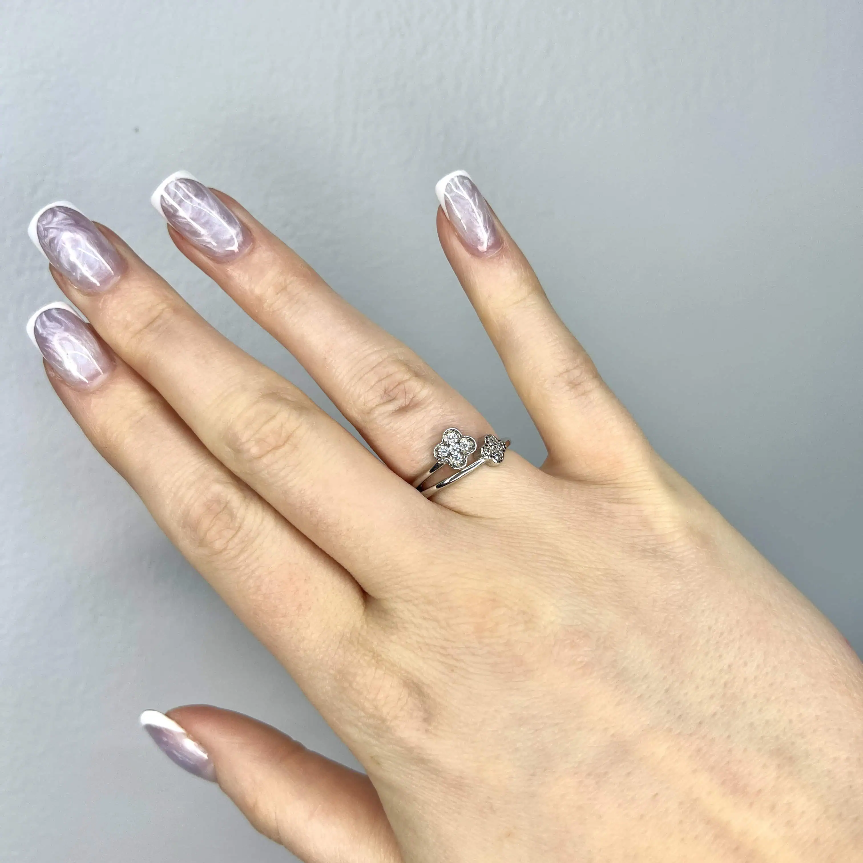 Елегантна срібна каблука 925 проби з розімкненою шинкою та двома різнорозмірними елементами у формі конюшини. Кожна квітка щедро інкрустована прозорими цирконами, що надає виробу об'ємного сяйва та ніжного вигляду.