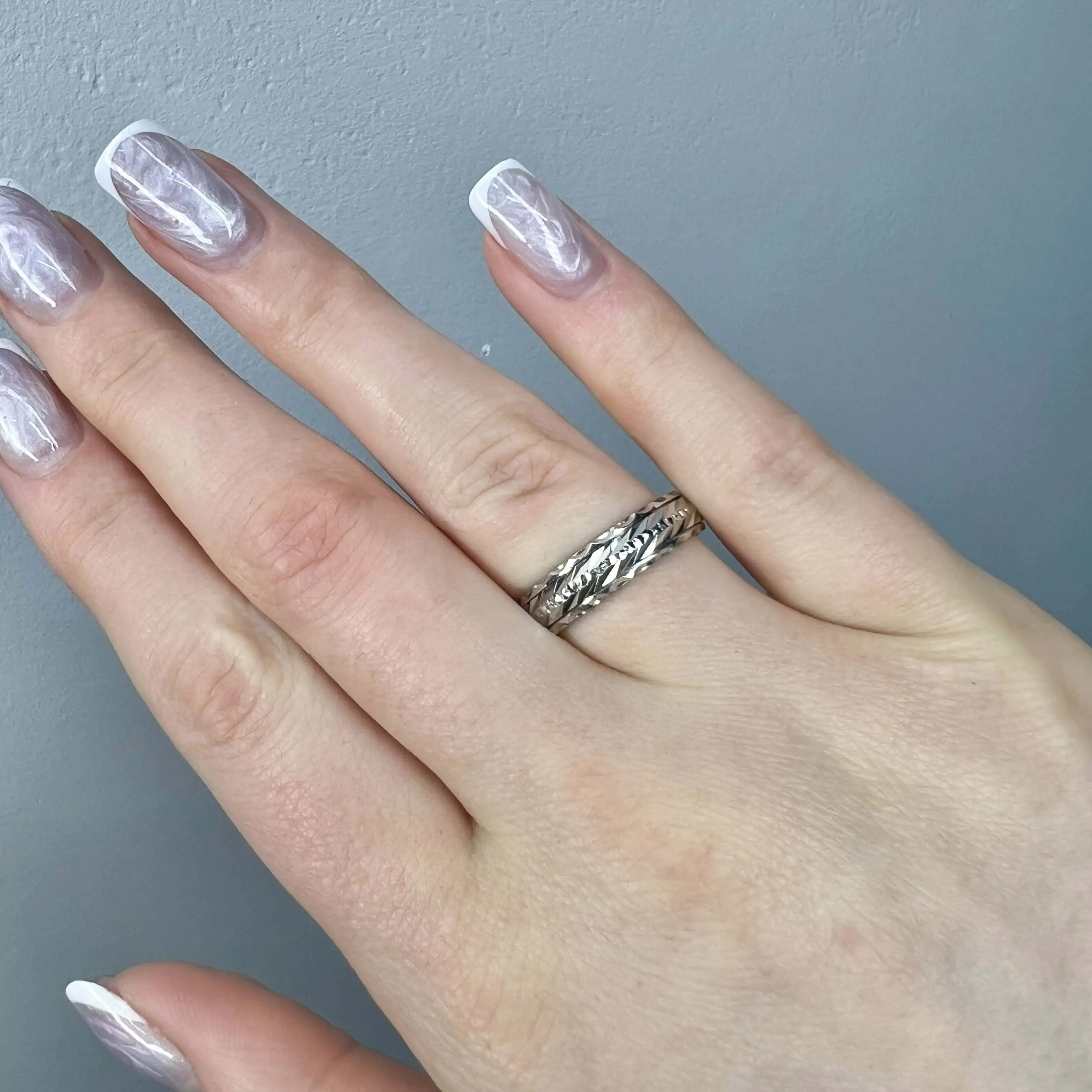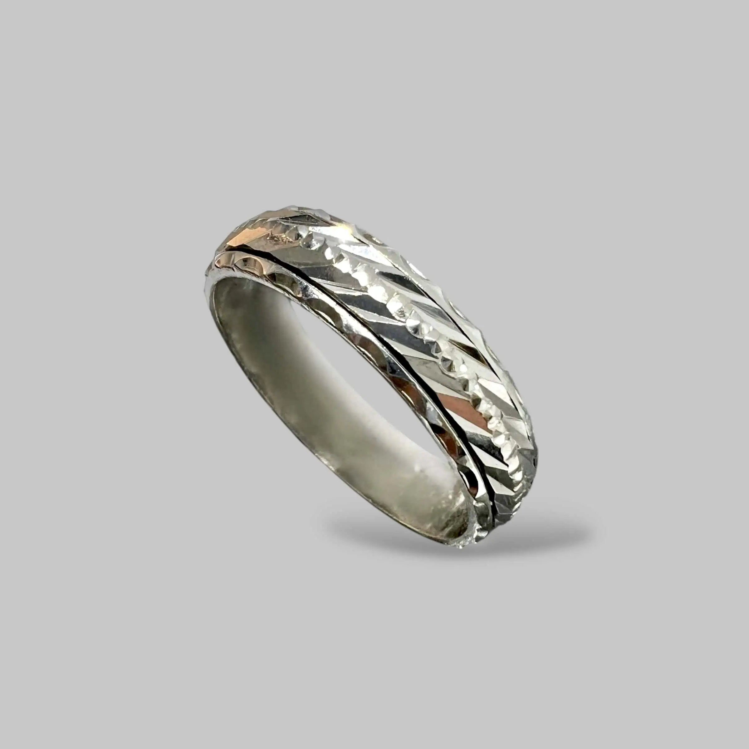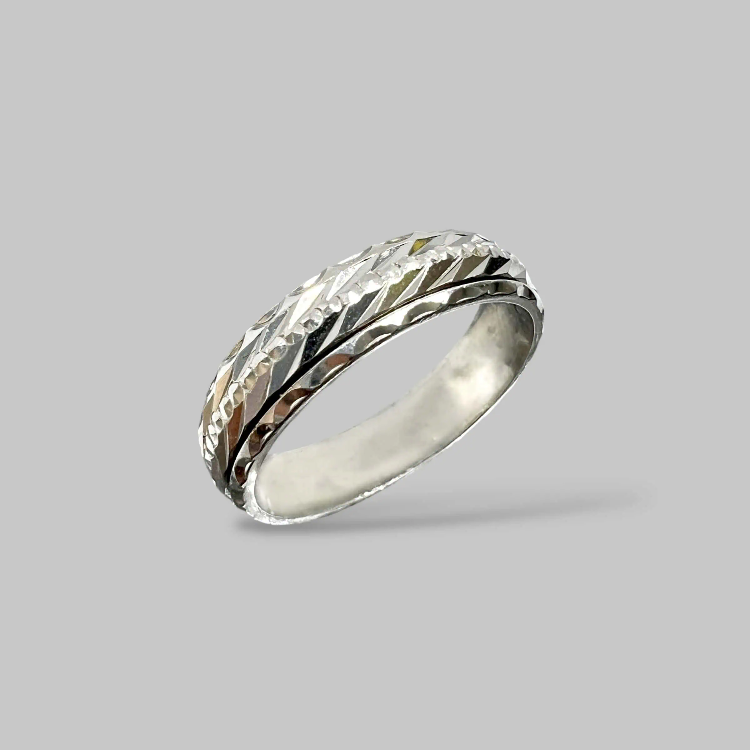Класична срібна каблучка з ефектним алмазним грануванням по всій поверхні. Спеціальні косі насічки створюють яскраве мерехтіння, що імітує блиск дорогоцінного каміння, роблячи цей лаконічний виріб універсальним та стильним аксесуаром на кожен день.