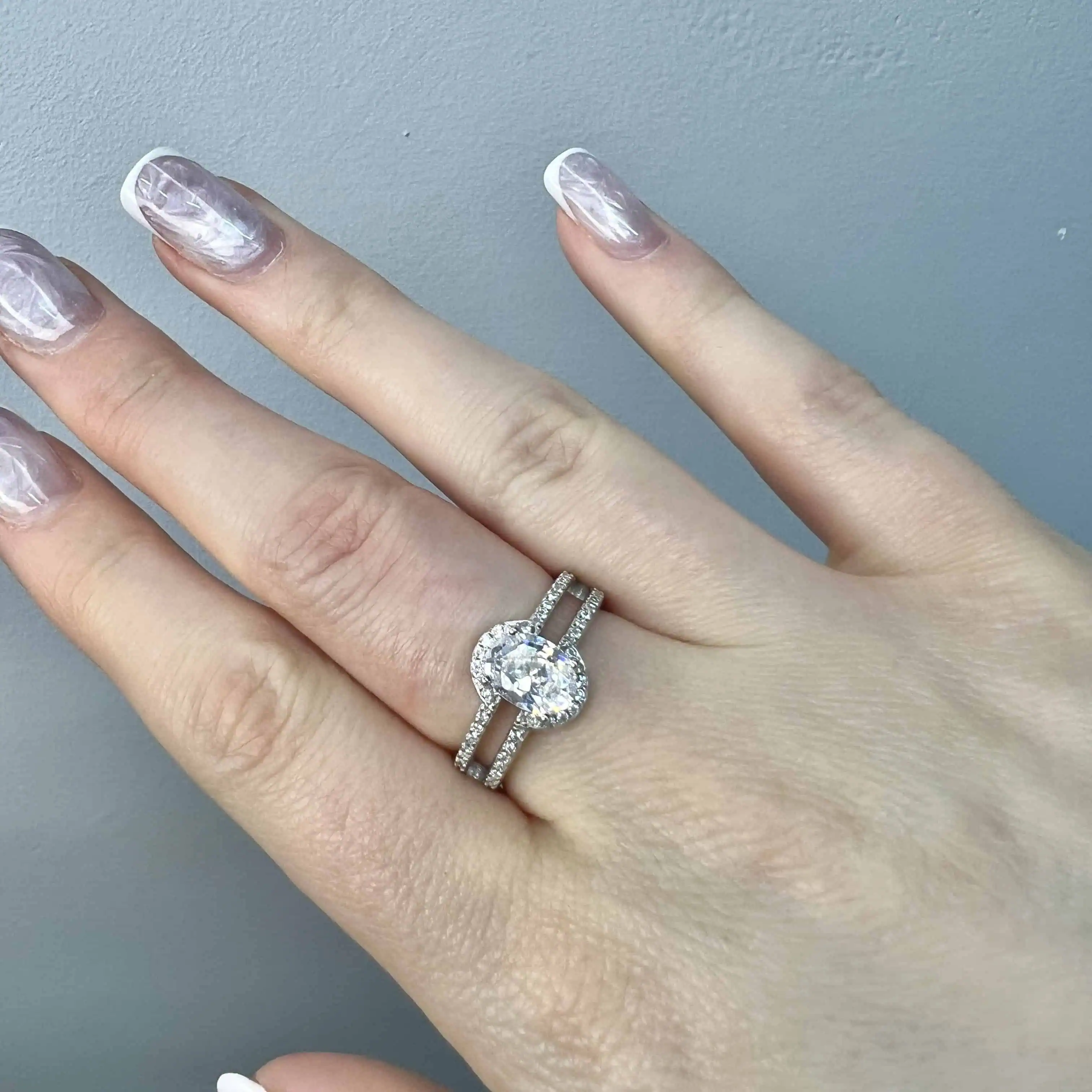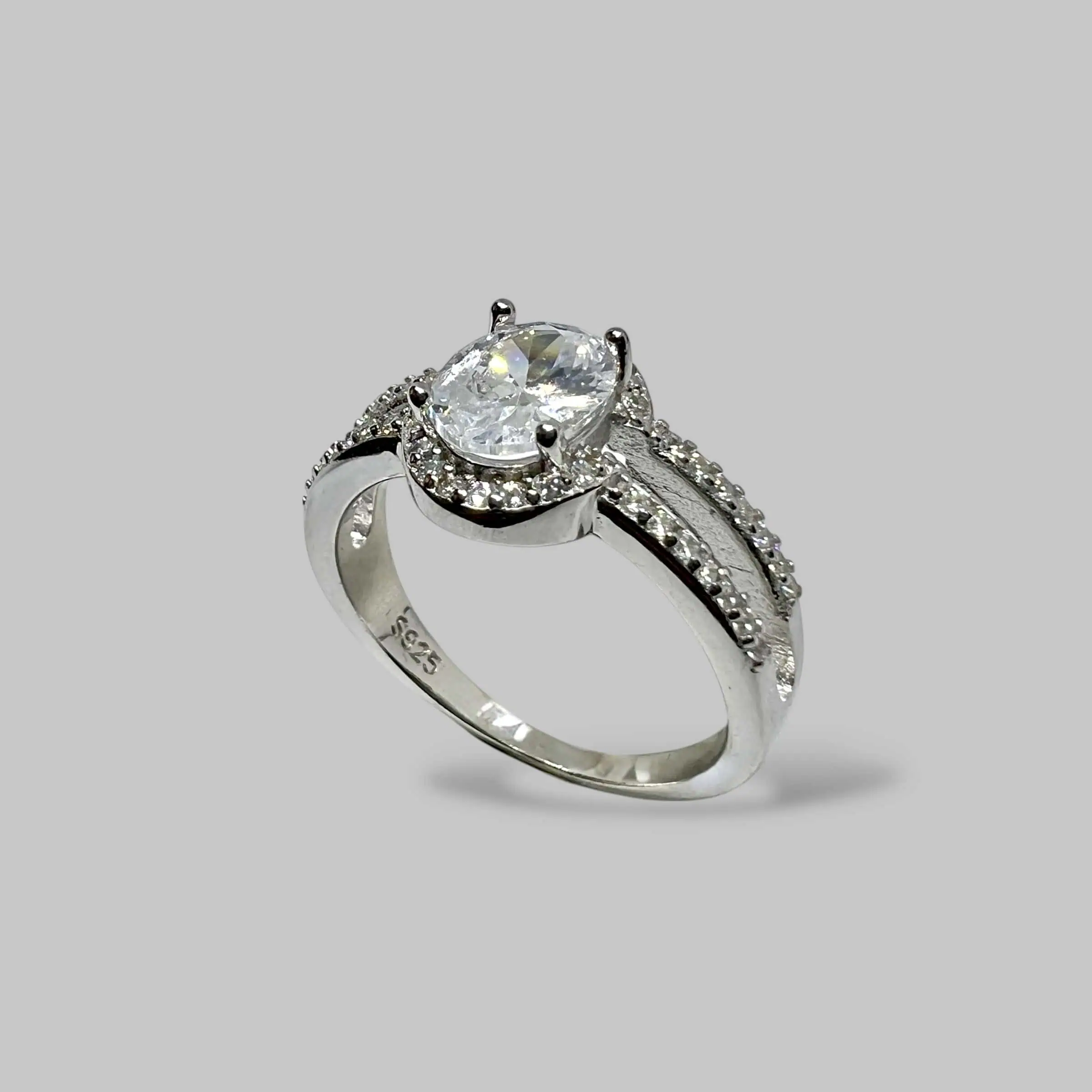 Незвичайна розімкнена каблучка зі срібла, прикрашена двома круглими елементами з розсипом сяючих цирконів.