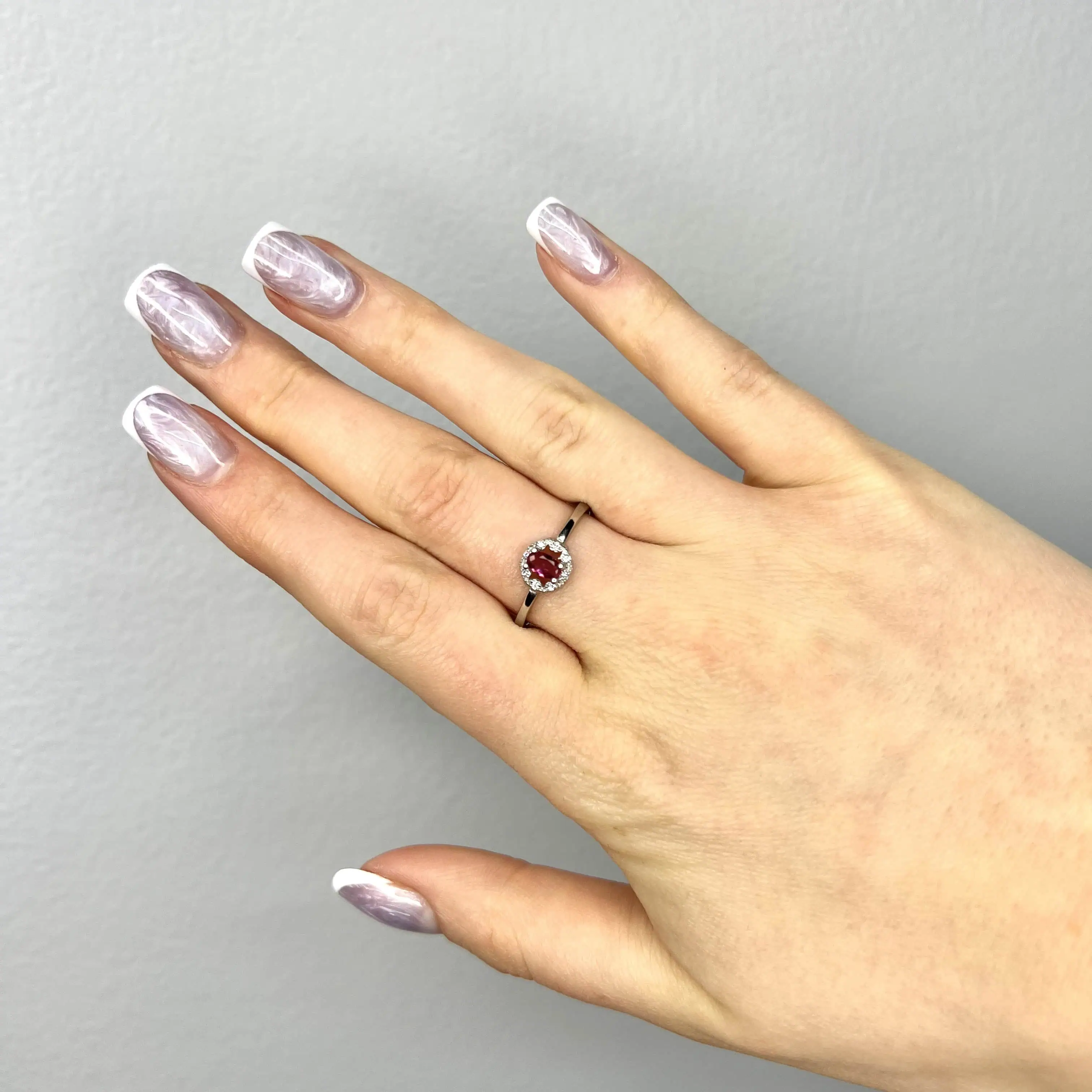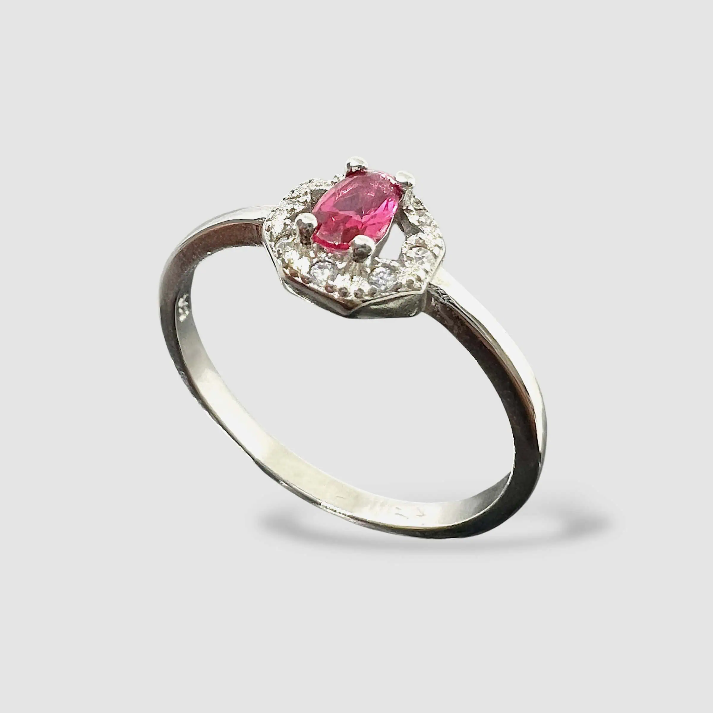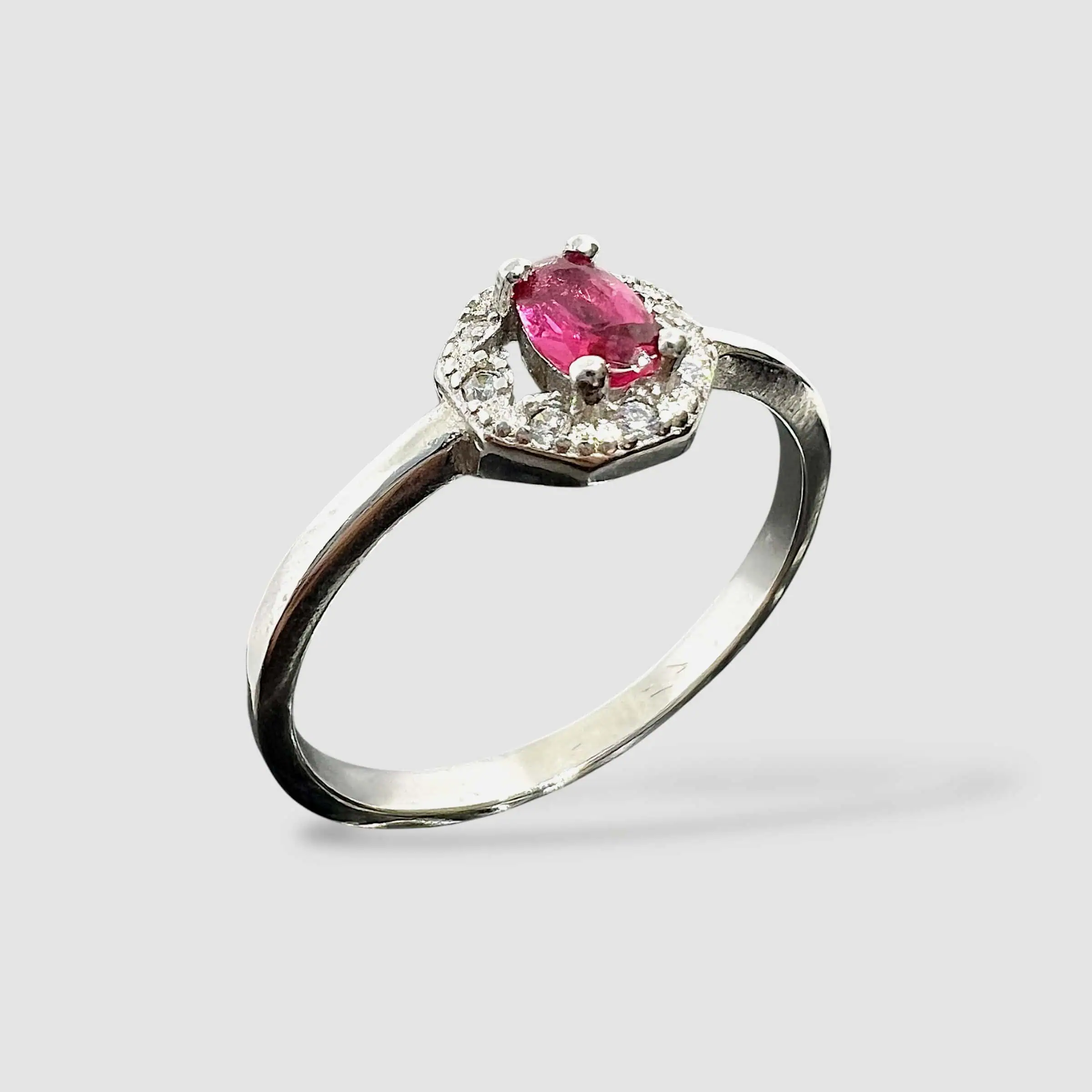 Ніжна срібна каблучка з овальним малиново-рожевим каменем у центрі. Тонкий обідок та делікатний німб із циркону білого кольору підкреслюють елегантність прикраси.
