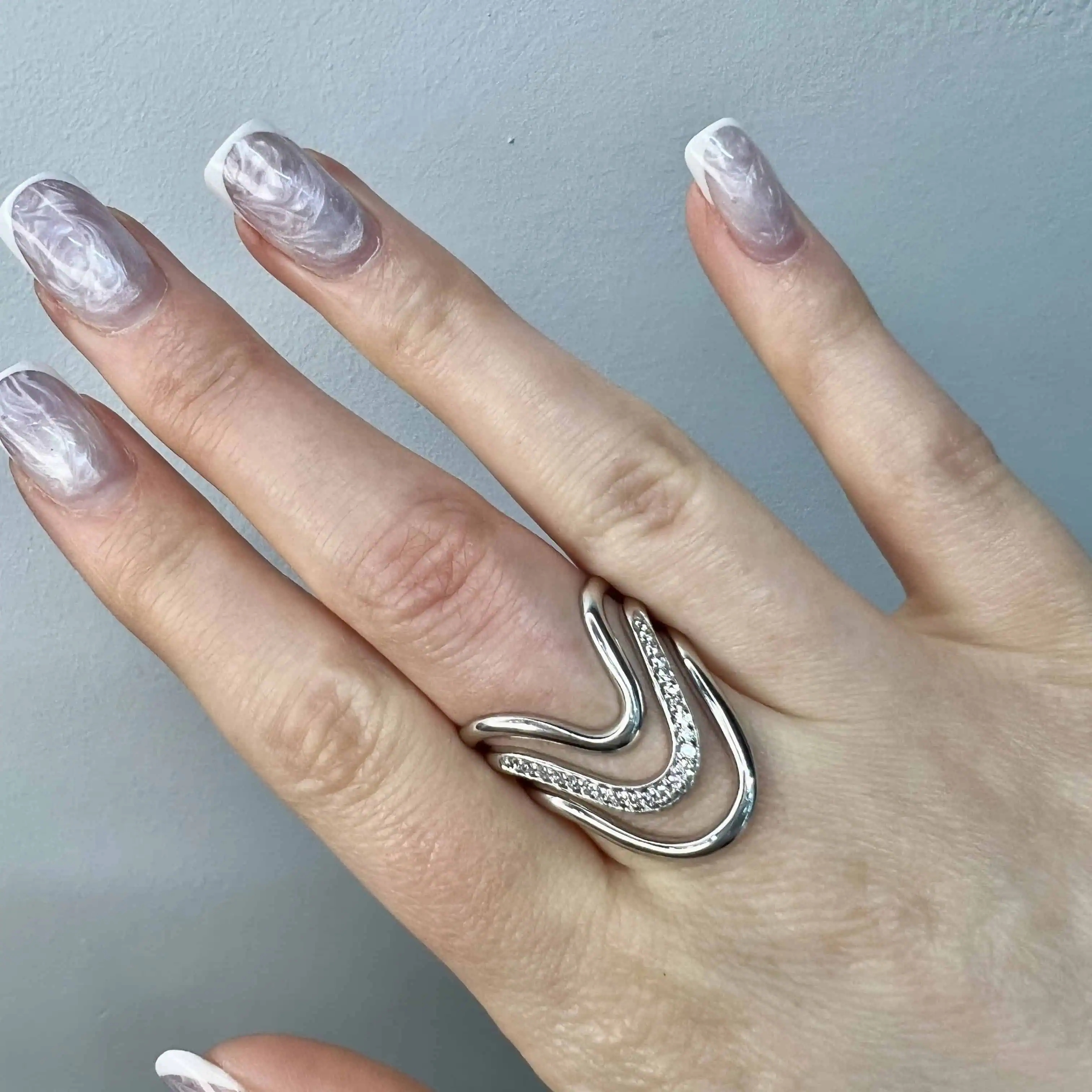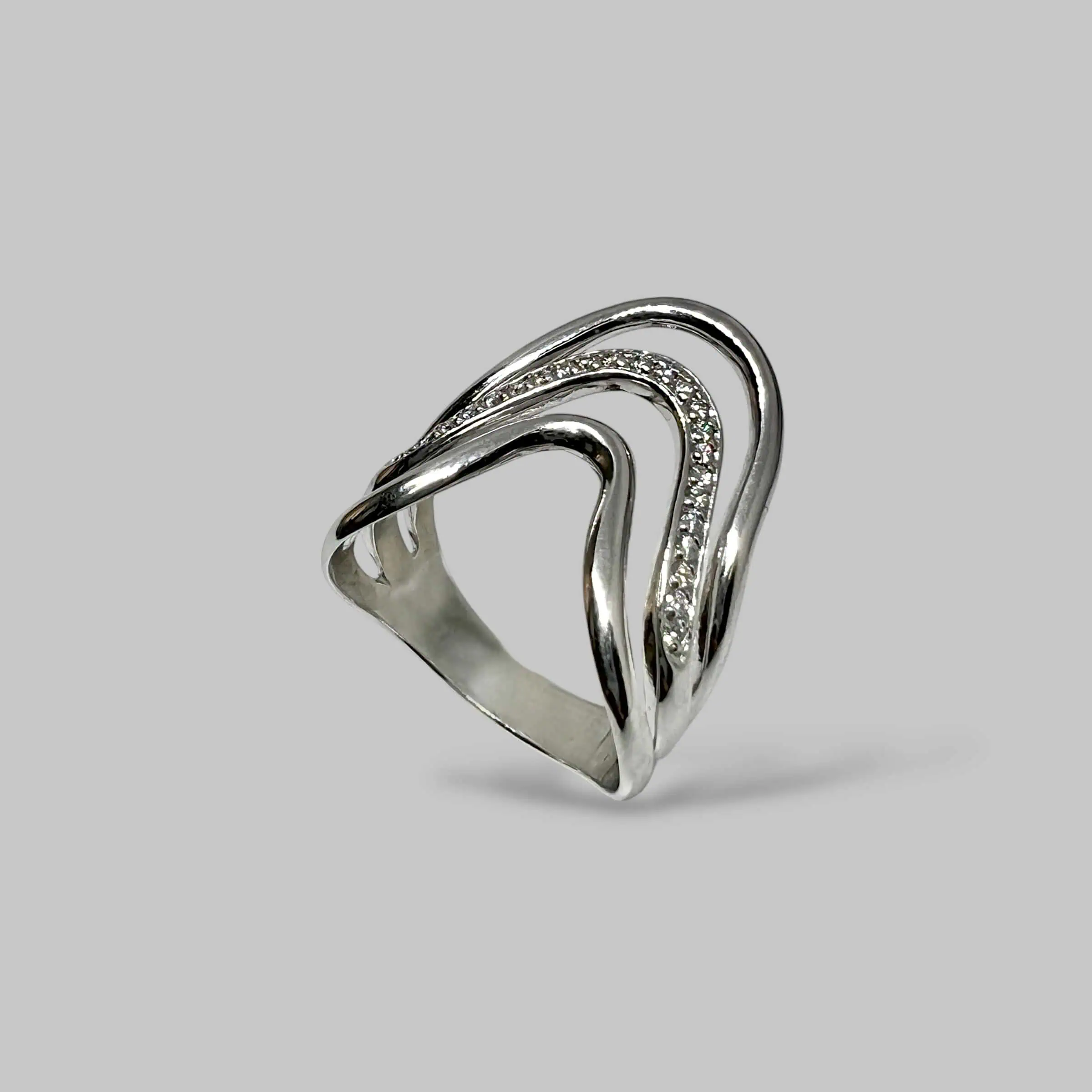 Незвичайна срібна каблука, дизайн якої натхненний плавними природними лініями. Три тонкі яруси з V-подібним вигином, один з яких прикрашений доріжкою дрібних цирконів, створюють легкий та водночас виразний образ, що візуально видовжує пальці.