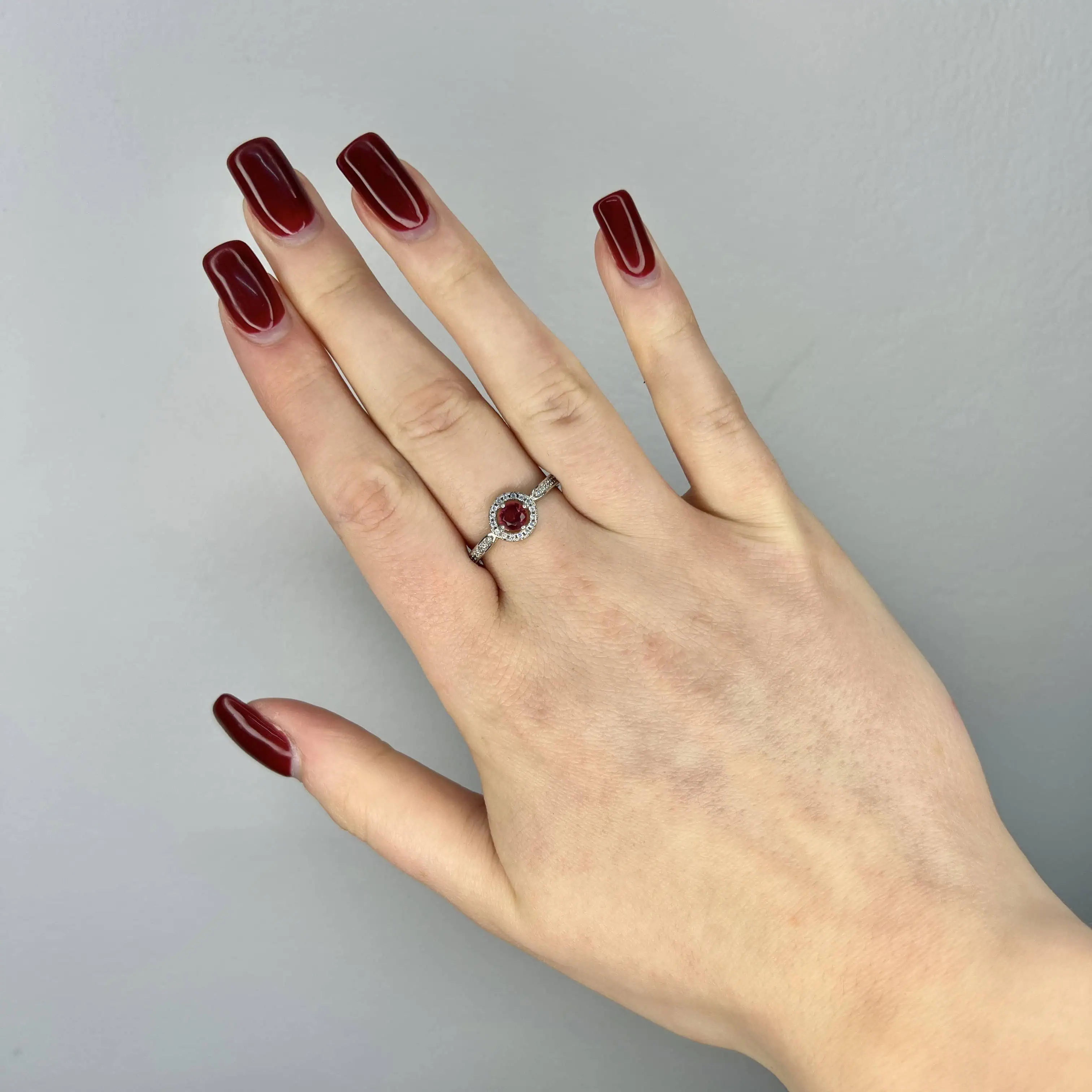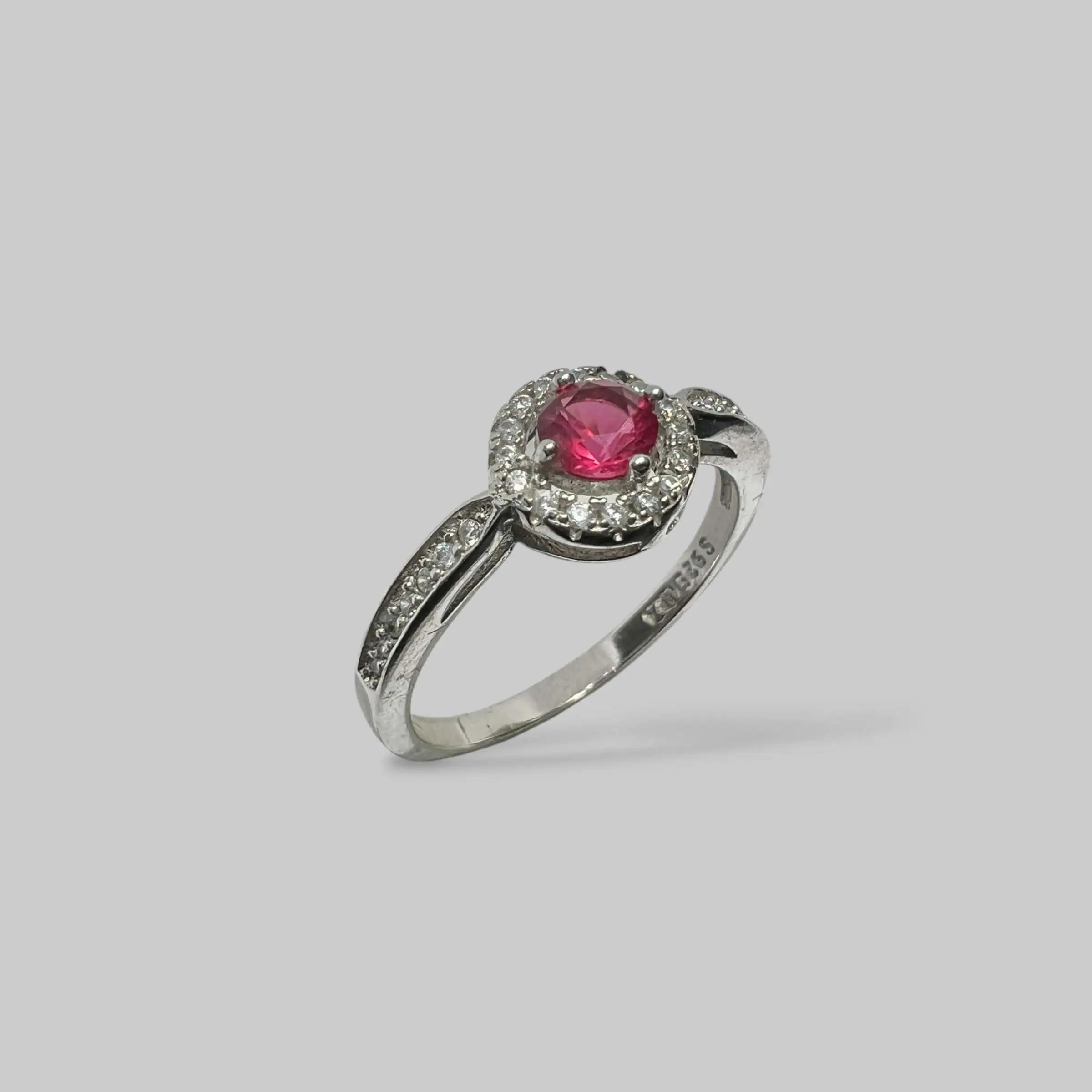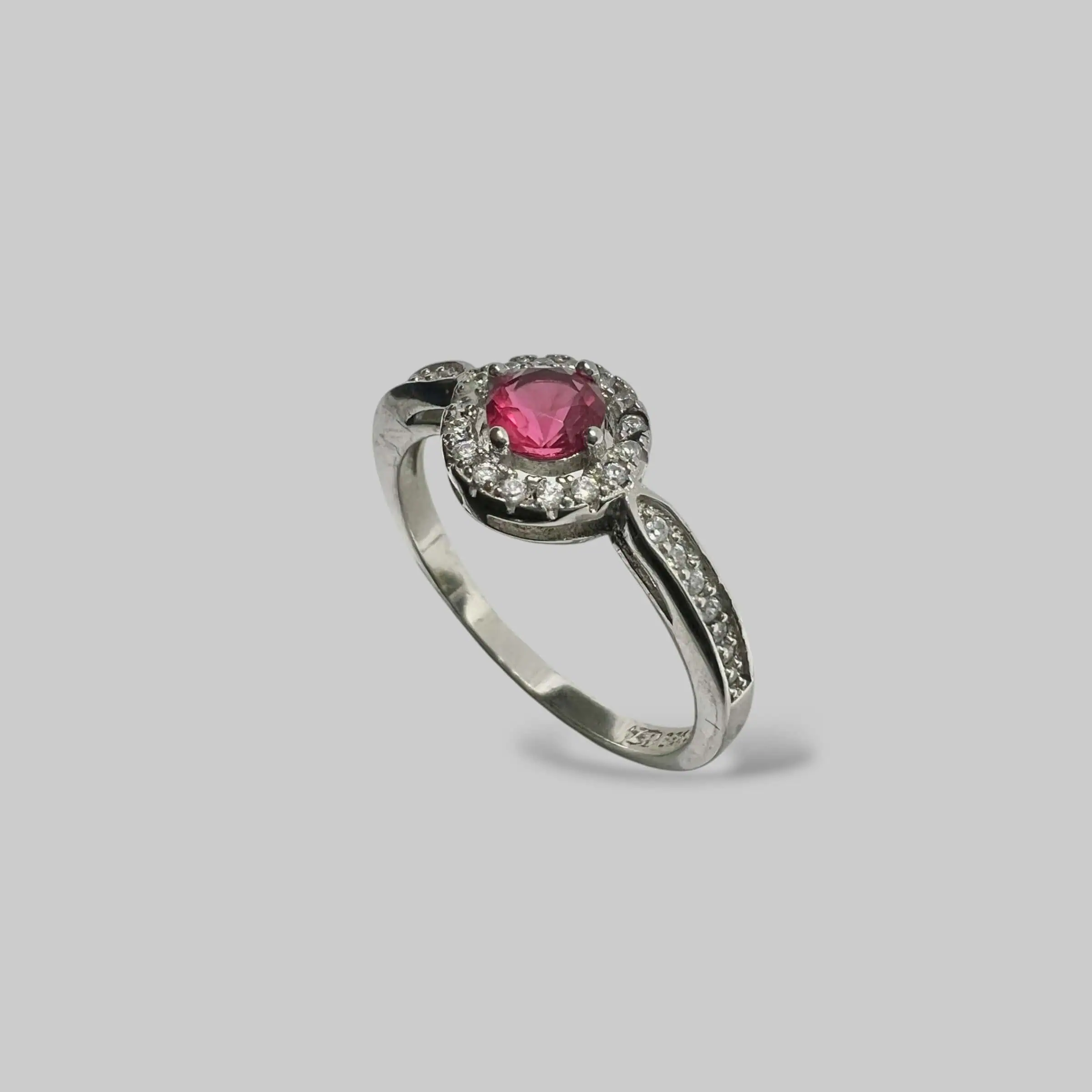 Елегантна модель із круглим кристалом кольору стиглої малини. Вишукана оправа, оздоблена дрібними прозорими каменями, підкреслює глибину кольору центральної вставки.