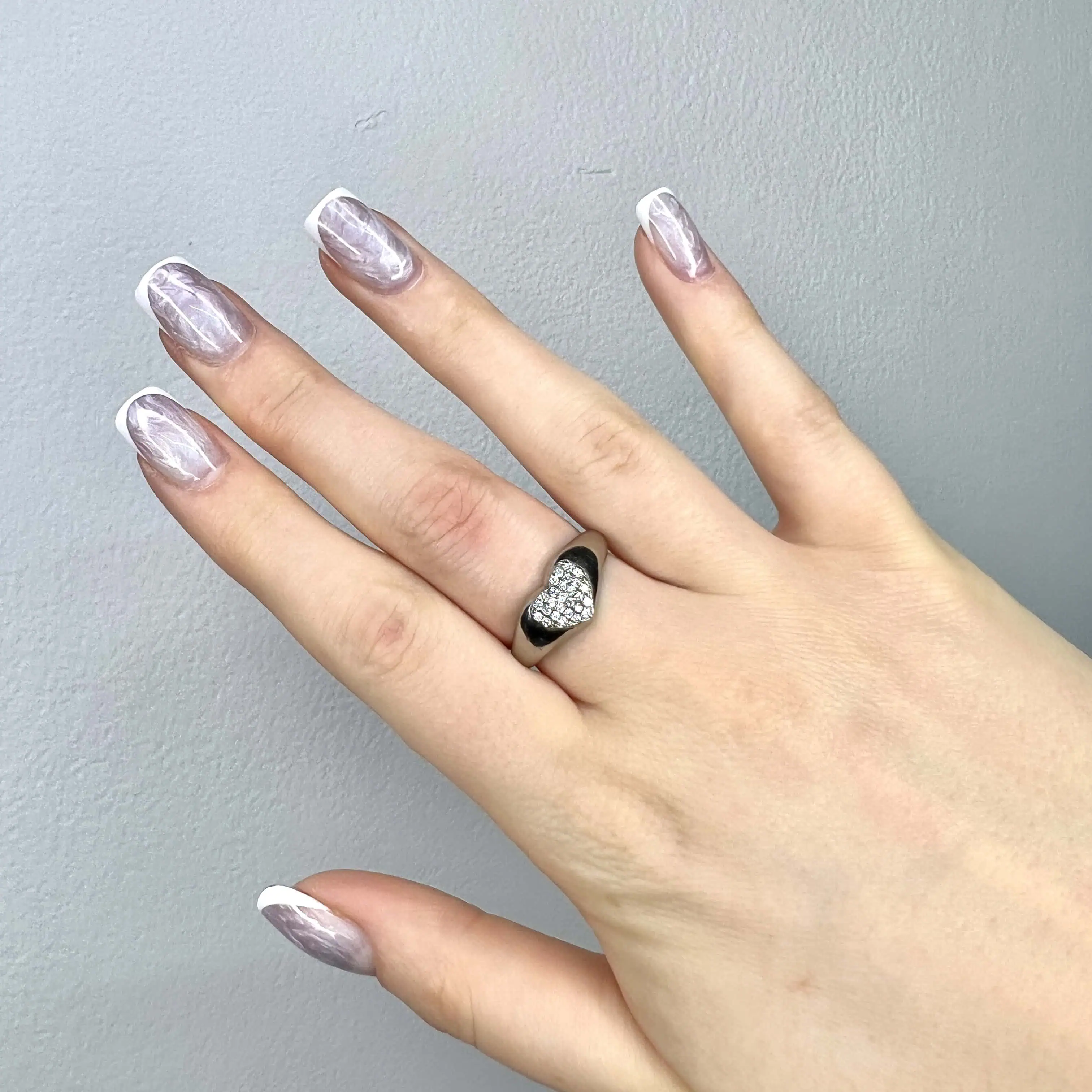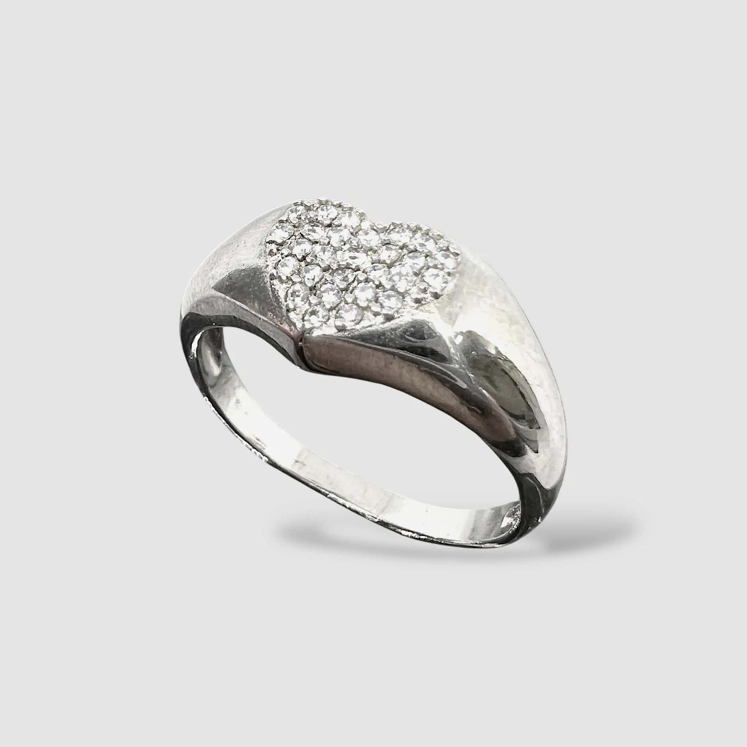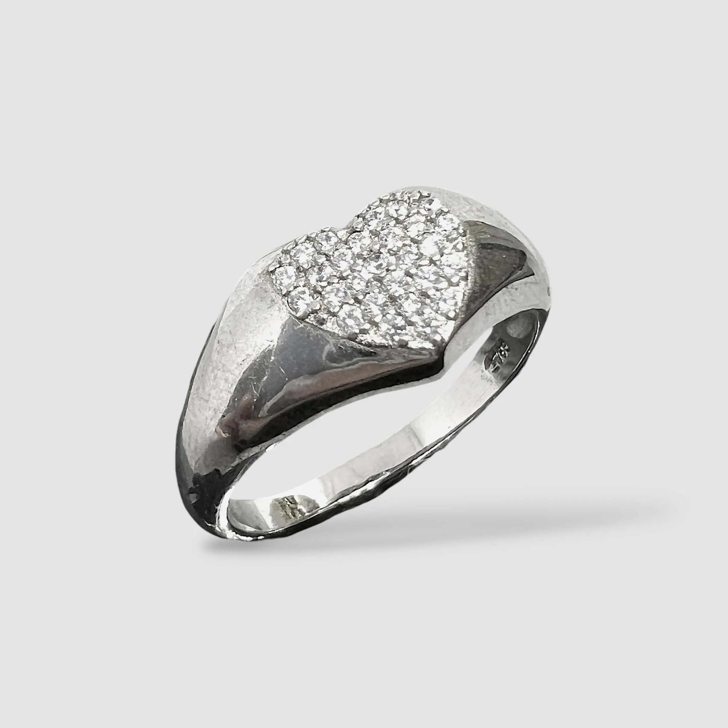 Витончена срібна каблучка 925 проби, виконана у формі печатки з романтичним акцентом. Гладка, полірована шинка плавно розширюється до центру, де розташоване серце, повністю інкрустоване дрібними каменями.