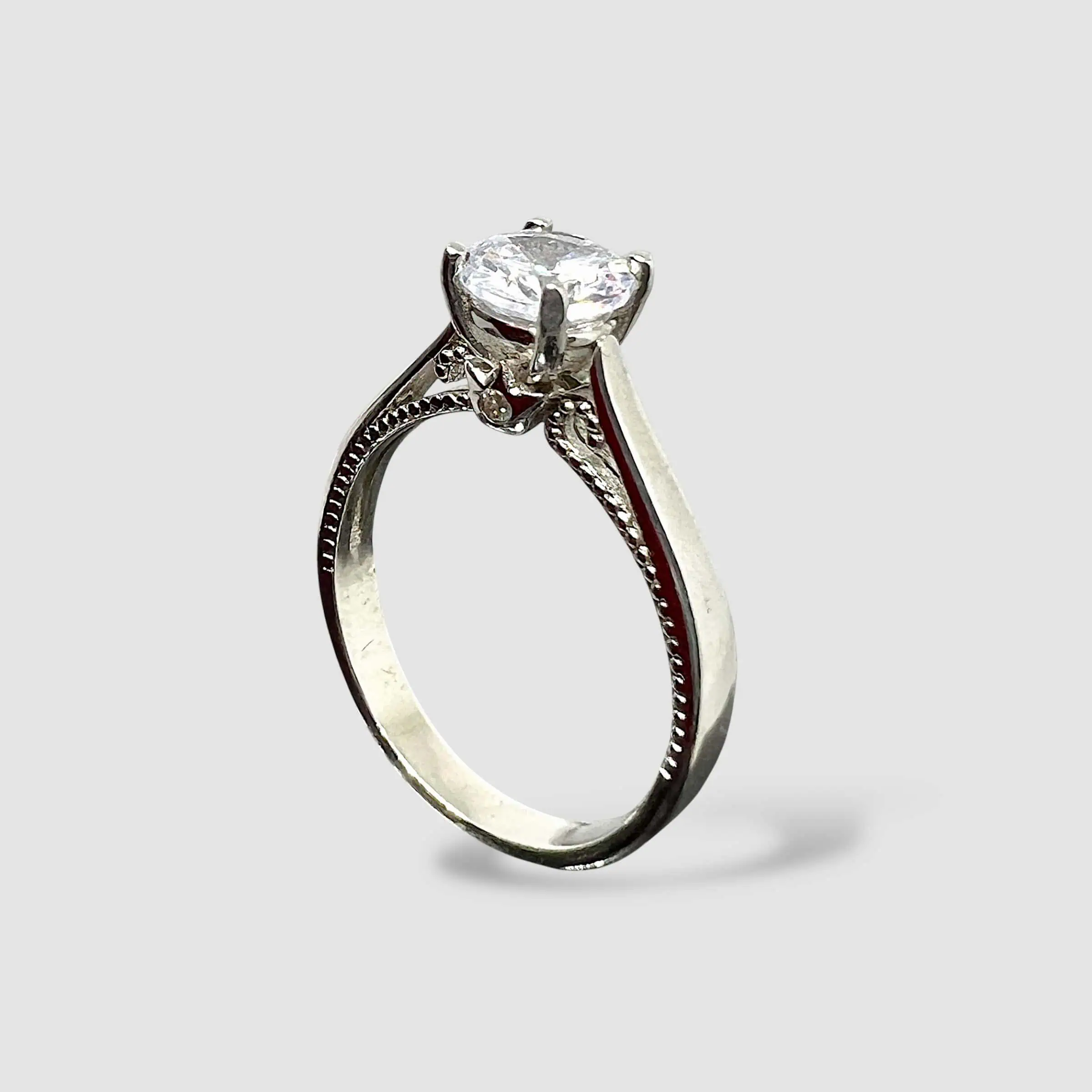 Класична каблучка зі срібла, що втілює в собі бездоганну елегантність та витонченість. Центральним елементом прикраси є великий цирконій діамантового гравіювання, закріплений чотирма надійними крапанами, що дозволяє каменю максимально ловити світло.