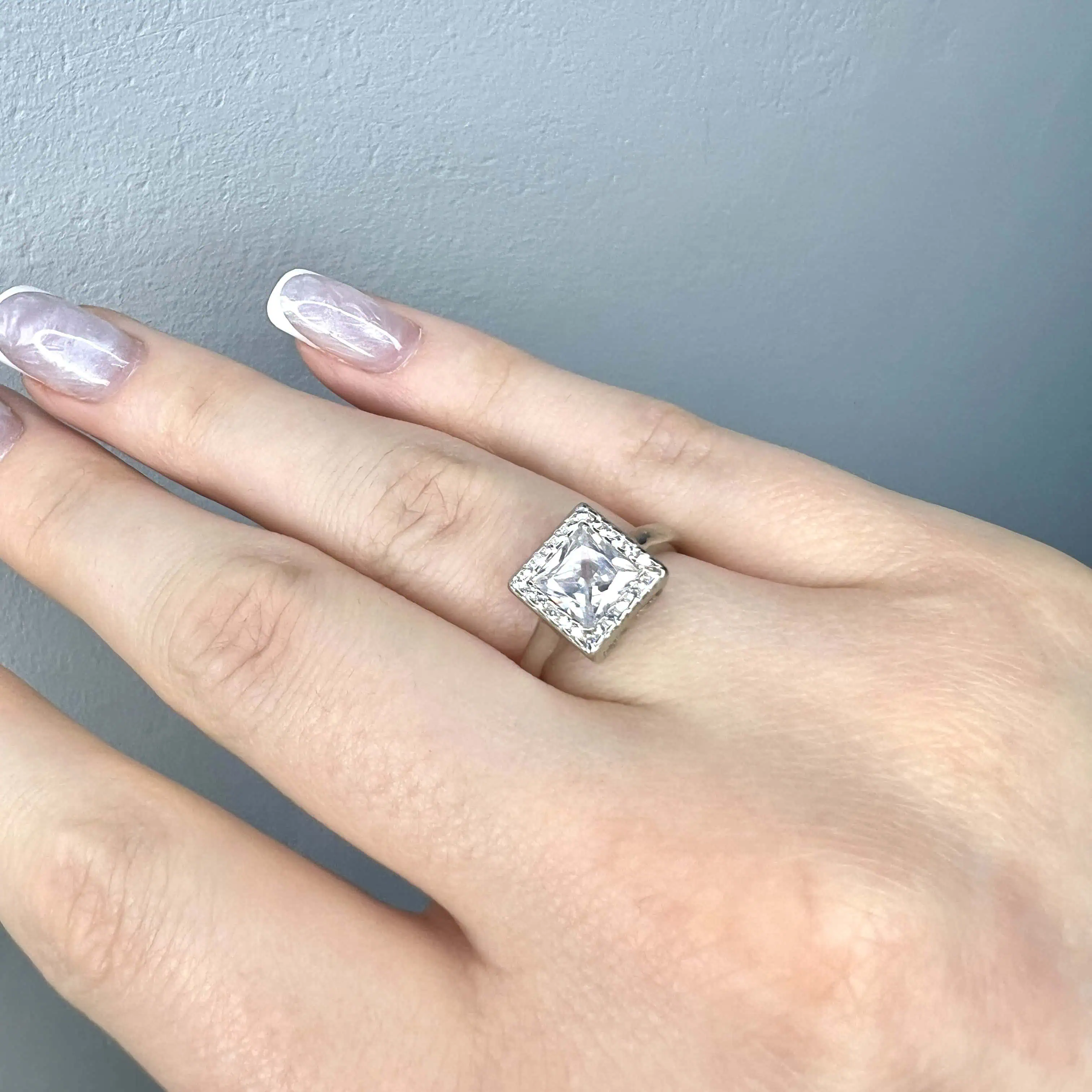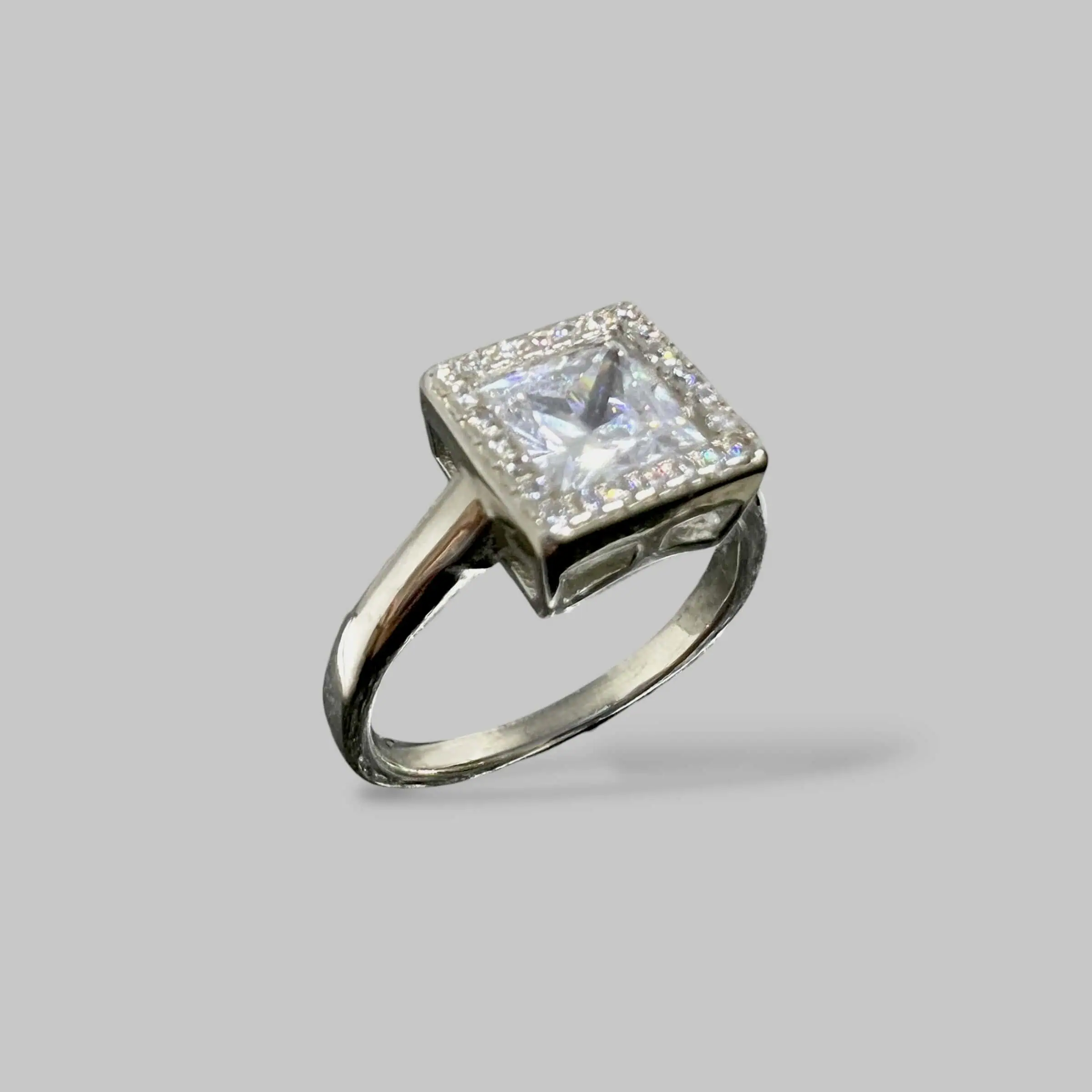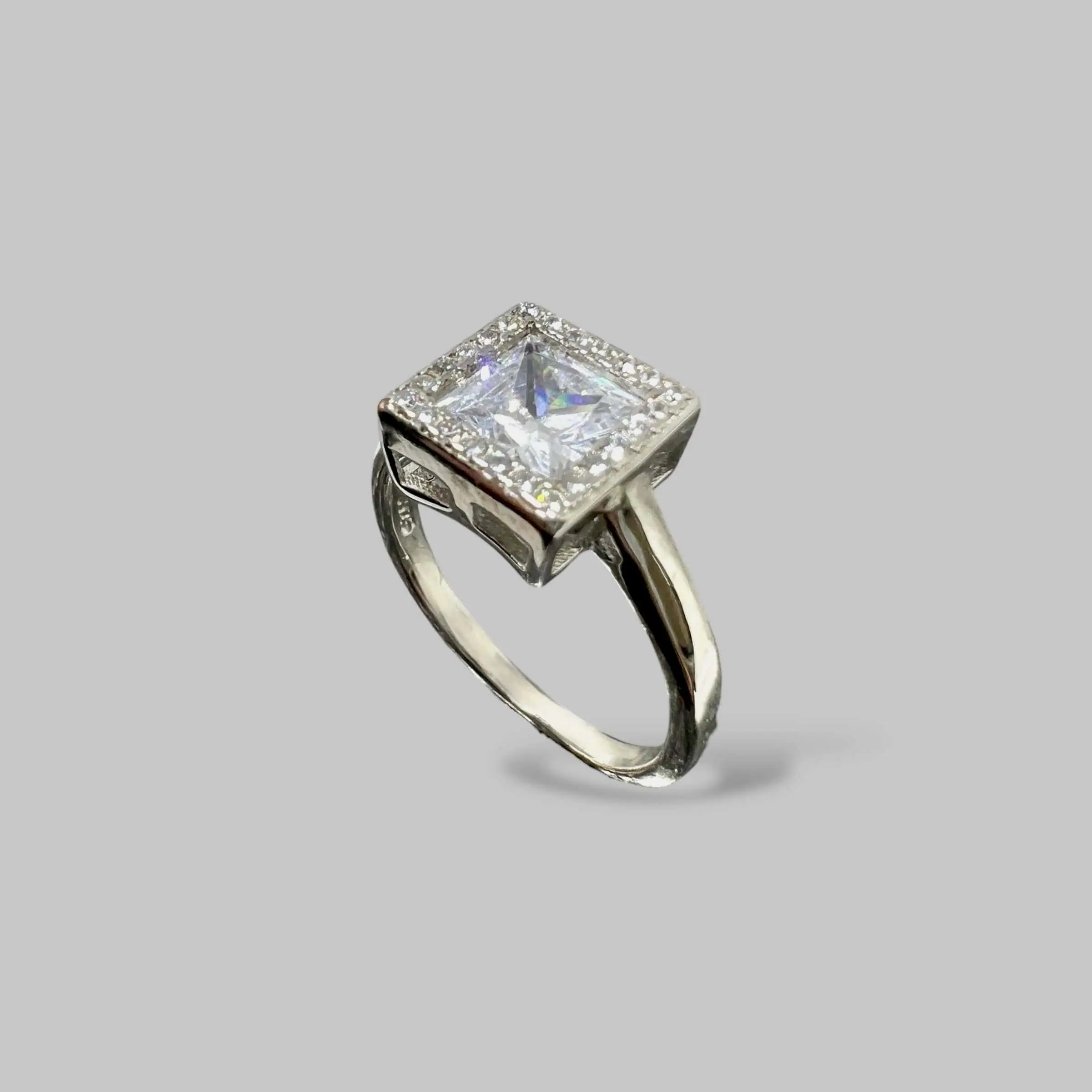 Акцентна срібна каблучка з великим круглим цирконом у центрі, що виграє всіма гранями. Масивна основа, оздоблена трьома паралельними доріжками дрібних каменів, створює враження розкоші та підкреслює статусність прикраси.