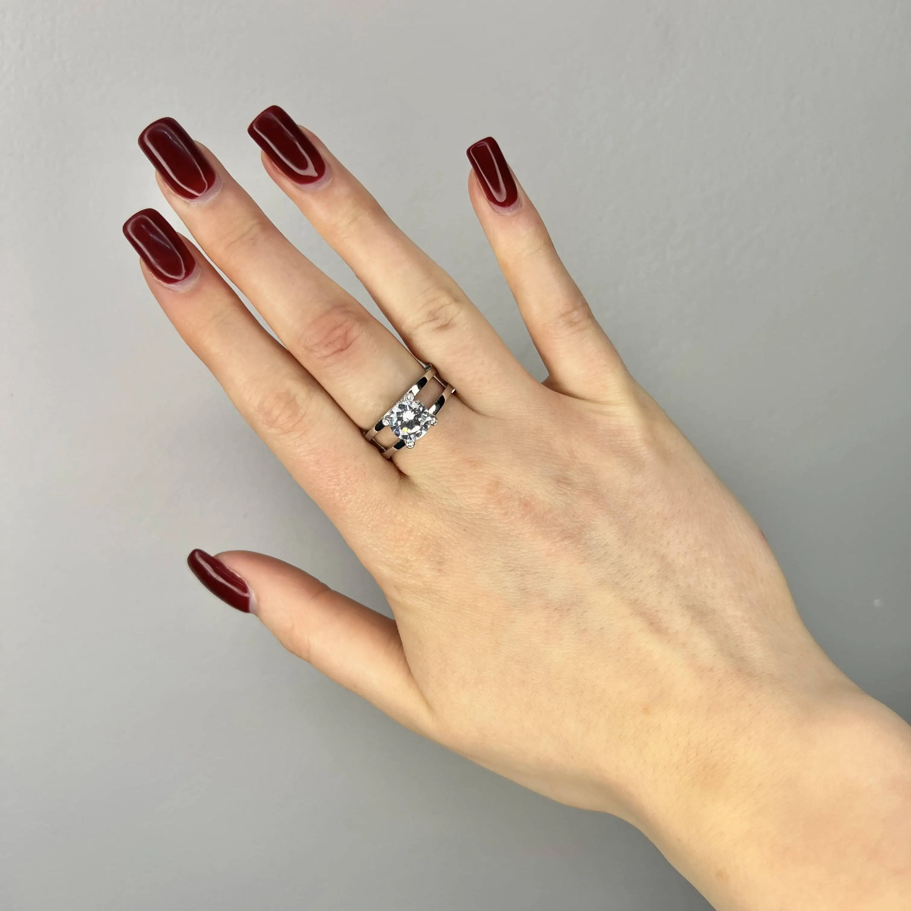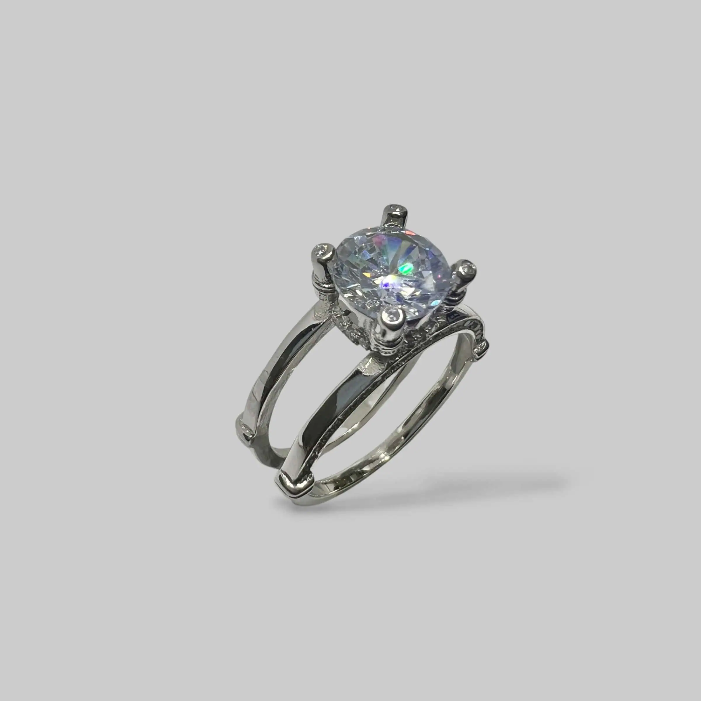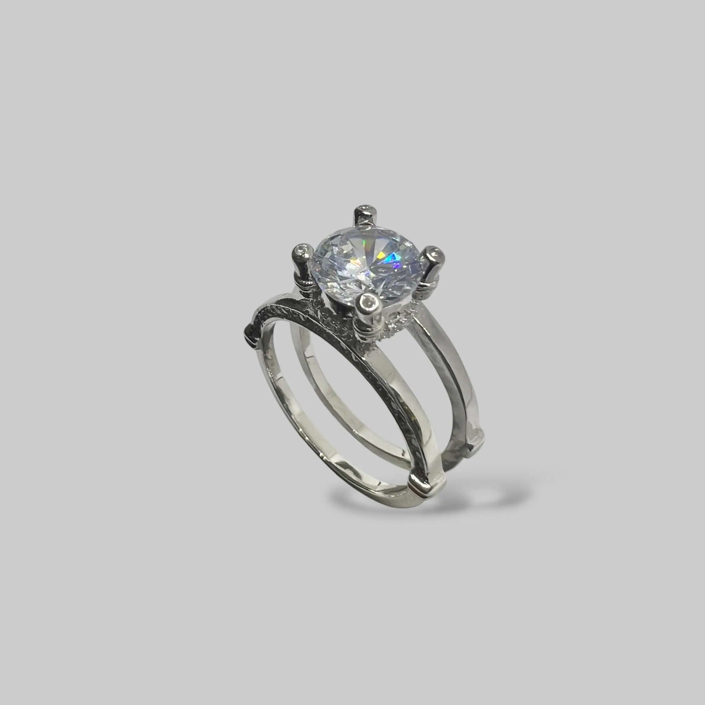 Класичний солітер у незвичному виконанні. Подвійна срібна стрічка підкреслює велич центрального каменя, а дрібна інкрустація на основі додає виробу додаткового мерехтіння та розкоші.