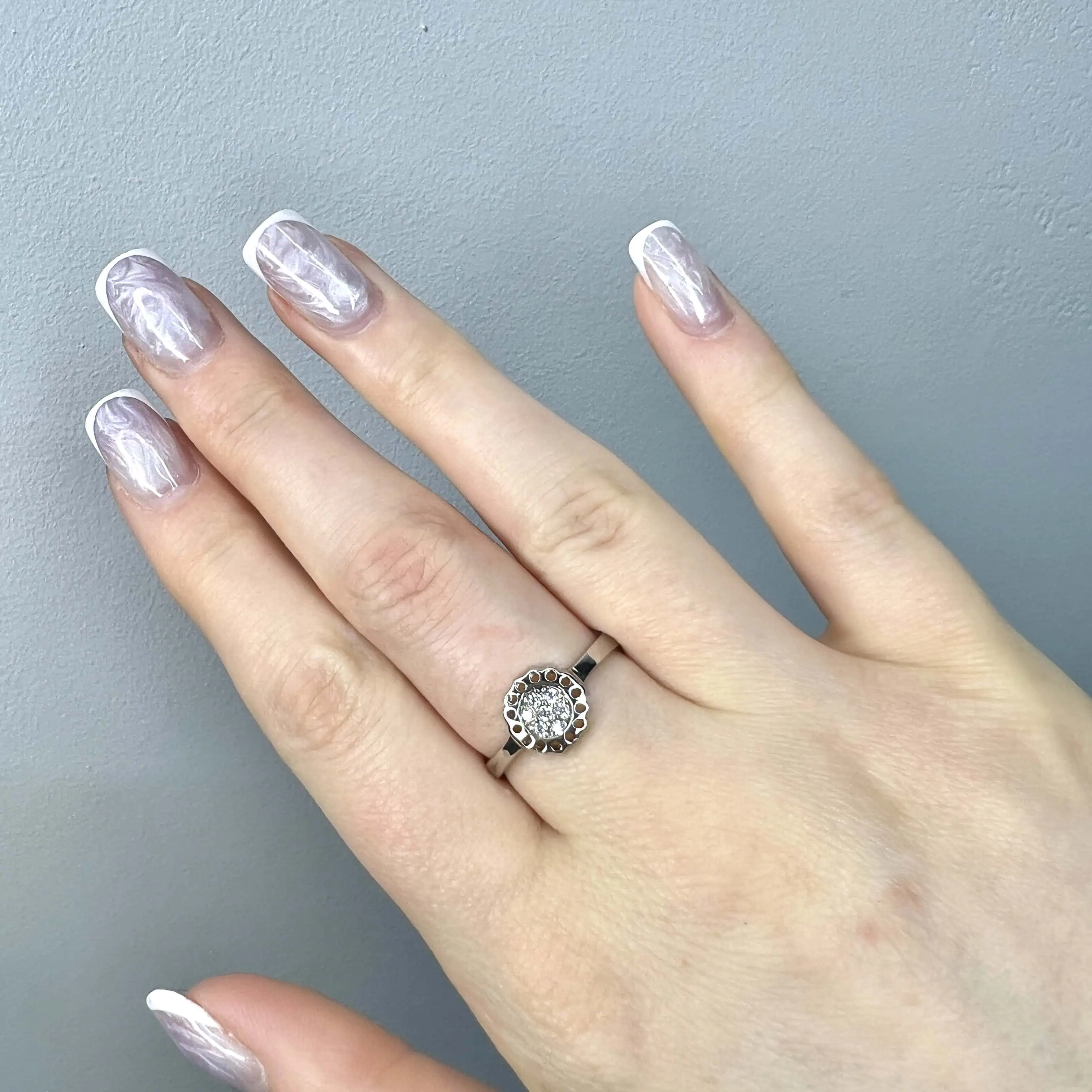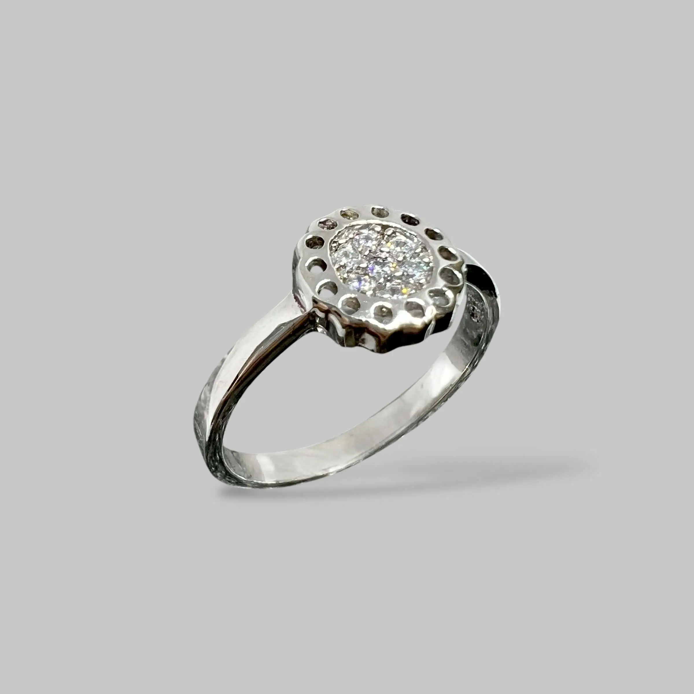 Ніжна срібна каблучка з центральним квітковим елементом, прикрашеним прозорими цирконами. Делікатний дизайн та сяйво каменів надають виробу витонченого та елегантного вигляду, ідеально доповнюючи будь-який образ.