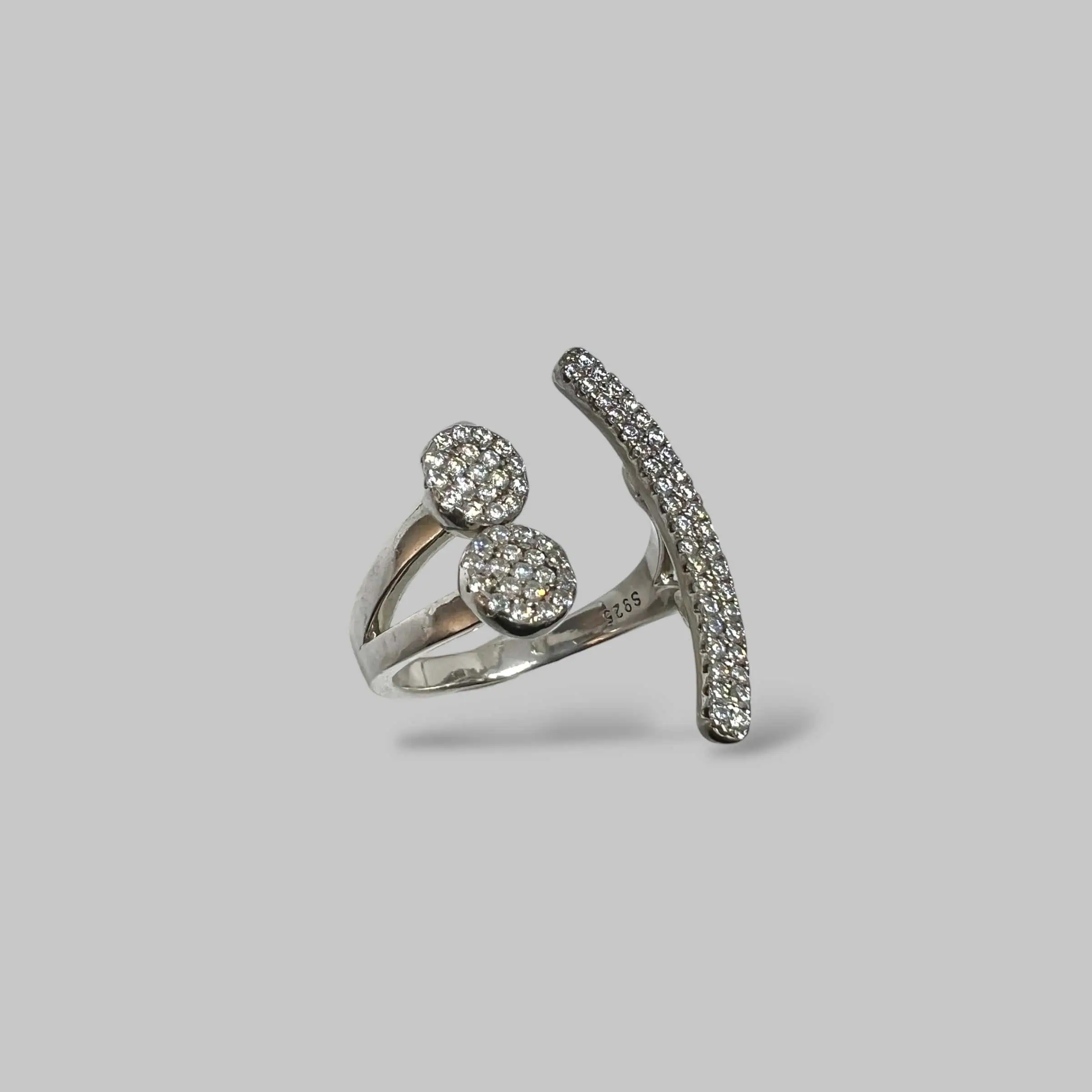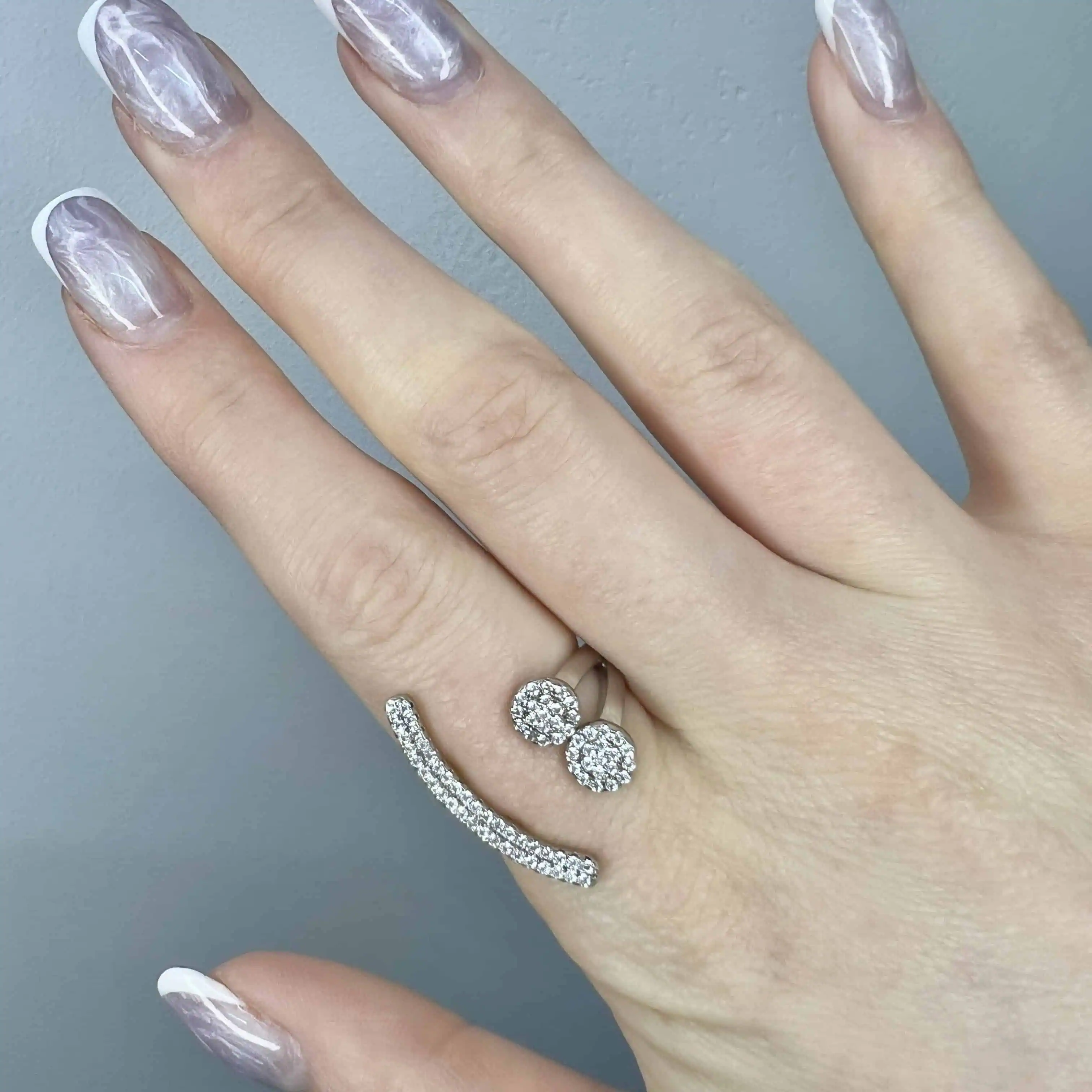 Дизайн виробу побудований на цікавому контрасті: з одного боку тонку шинку вінчають два невеликих круглих елементи, повністю інкрустовані цирконом, а з іншого — витончена вигнута лінія, що також сяє доріжкою дрібних каменів.