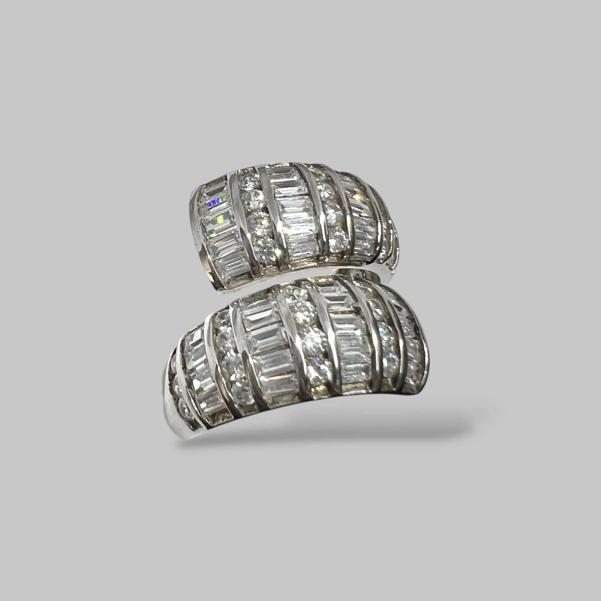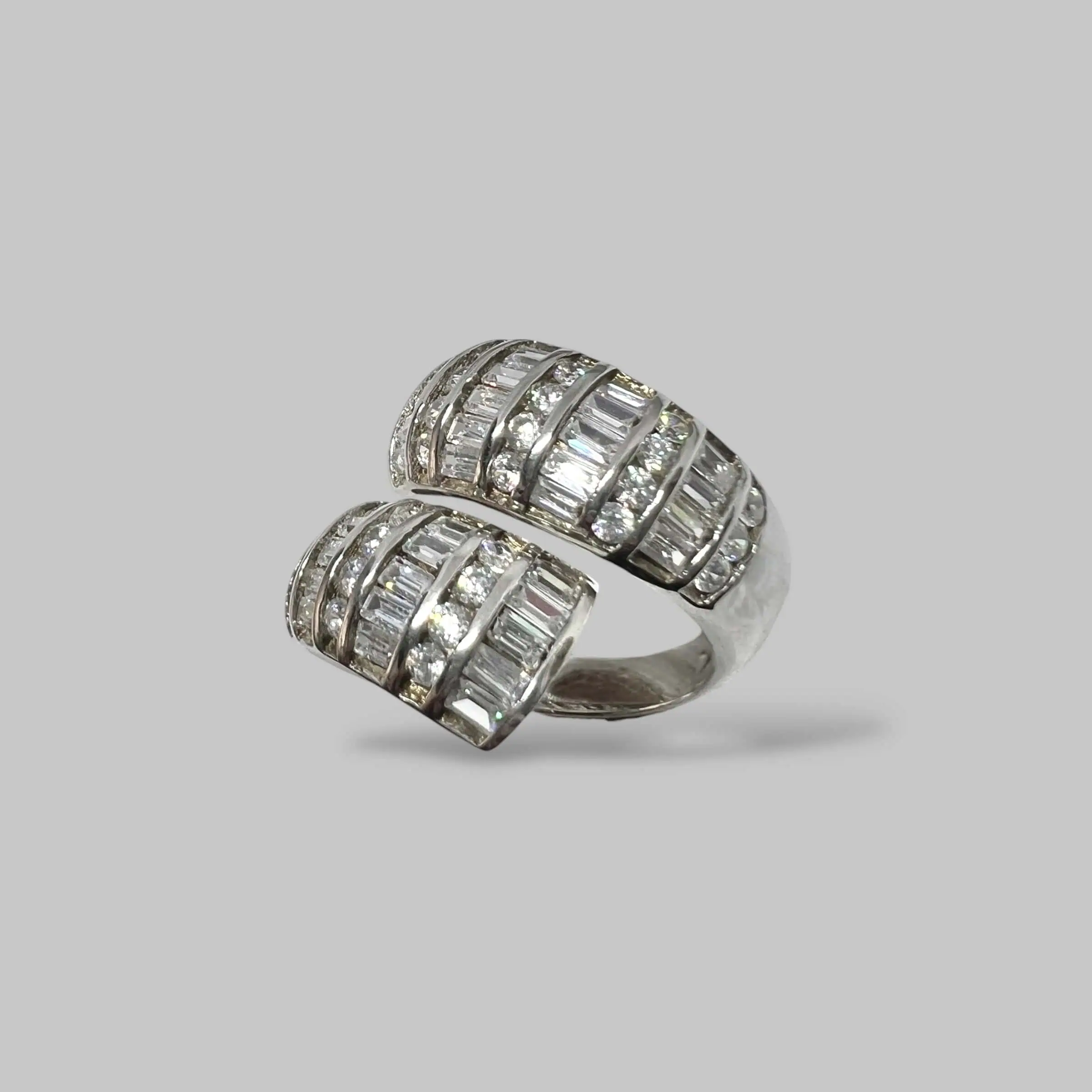 Ексклюзивна срібна каблучка розімкненої форми, що вражає багатством та різноманітністю ювелірного декору. Конструкція складається з двох широких паралельних панелей, кожна з яких прикрашена вертикальними рядами каміння з різним типом огранювання.