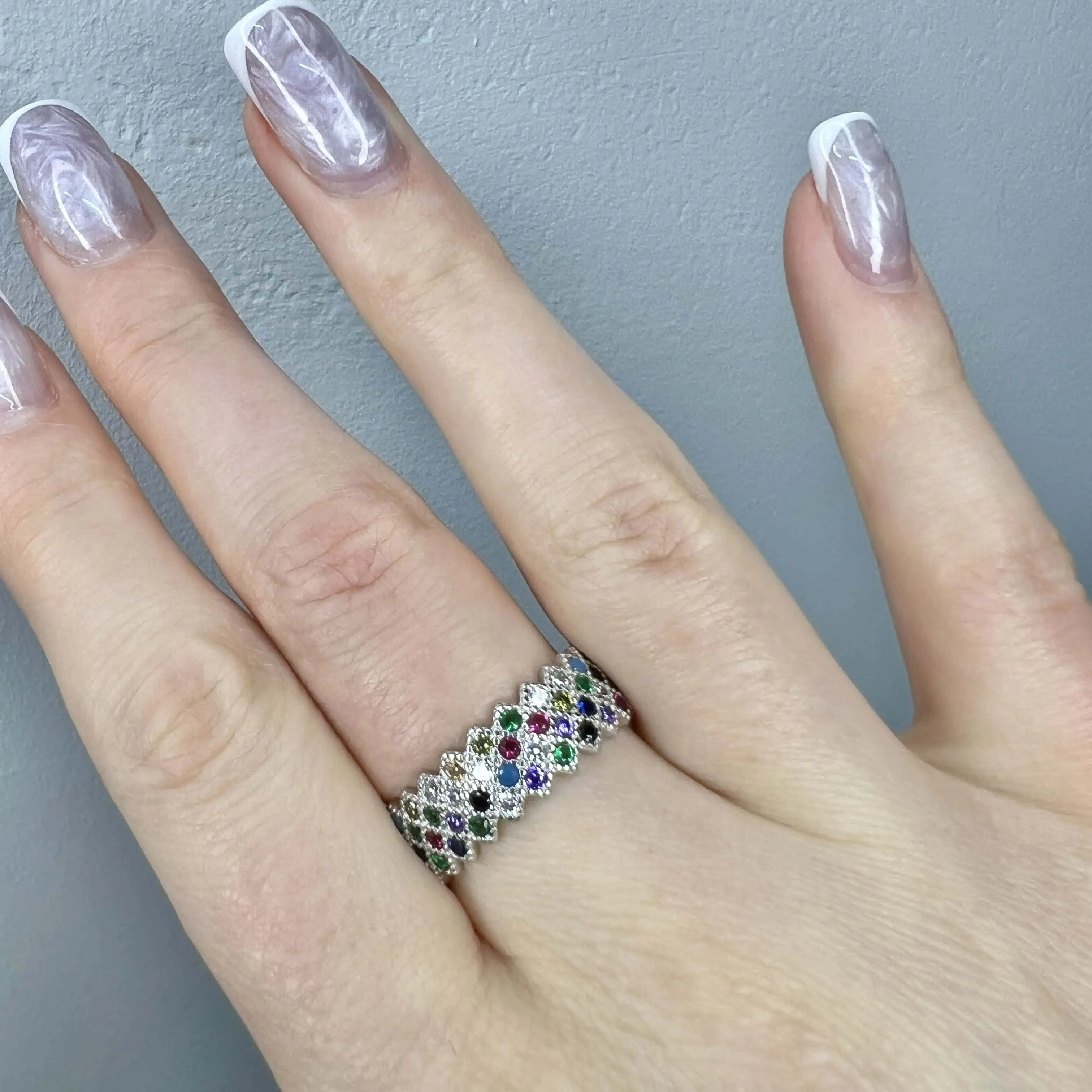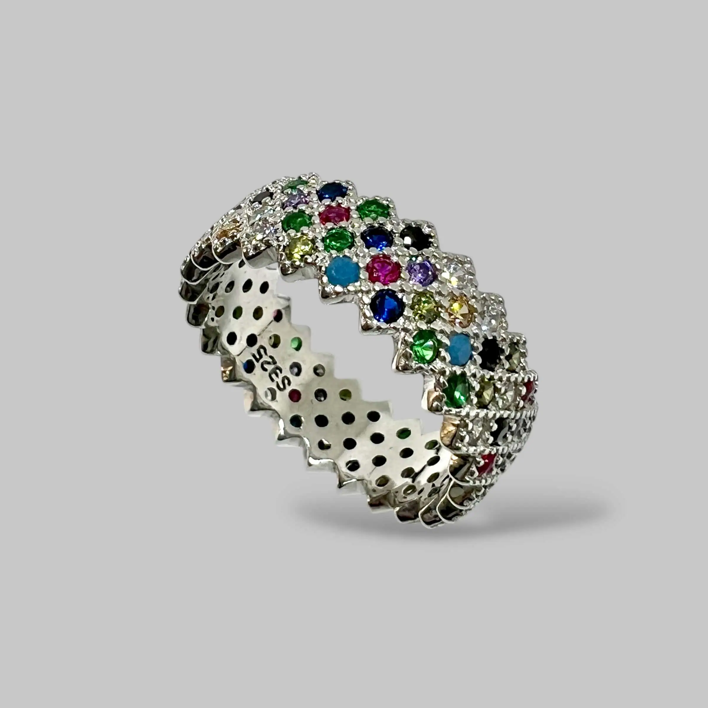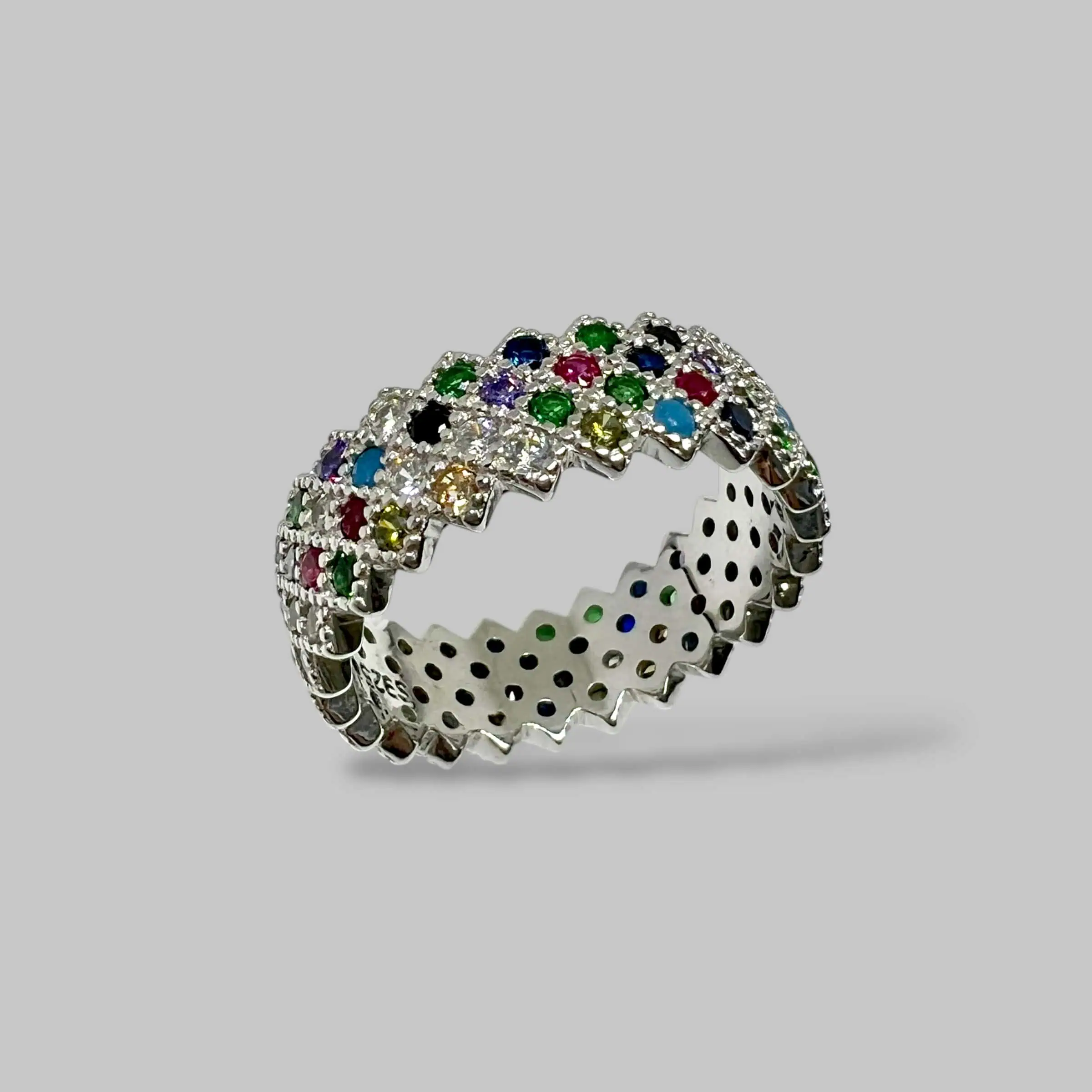 Поєднання яскраво-синіх, червоних, зелених, жовтих та прозорих цирконів створює неповторний, життєрадісний візерунок у стилі мультиколор.
