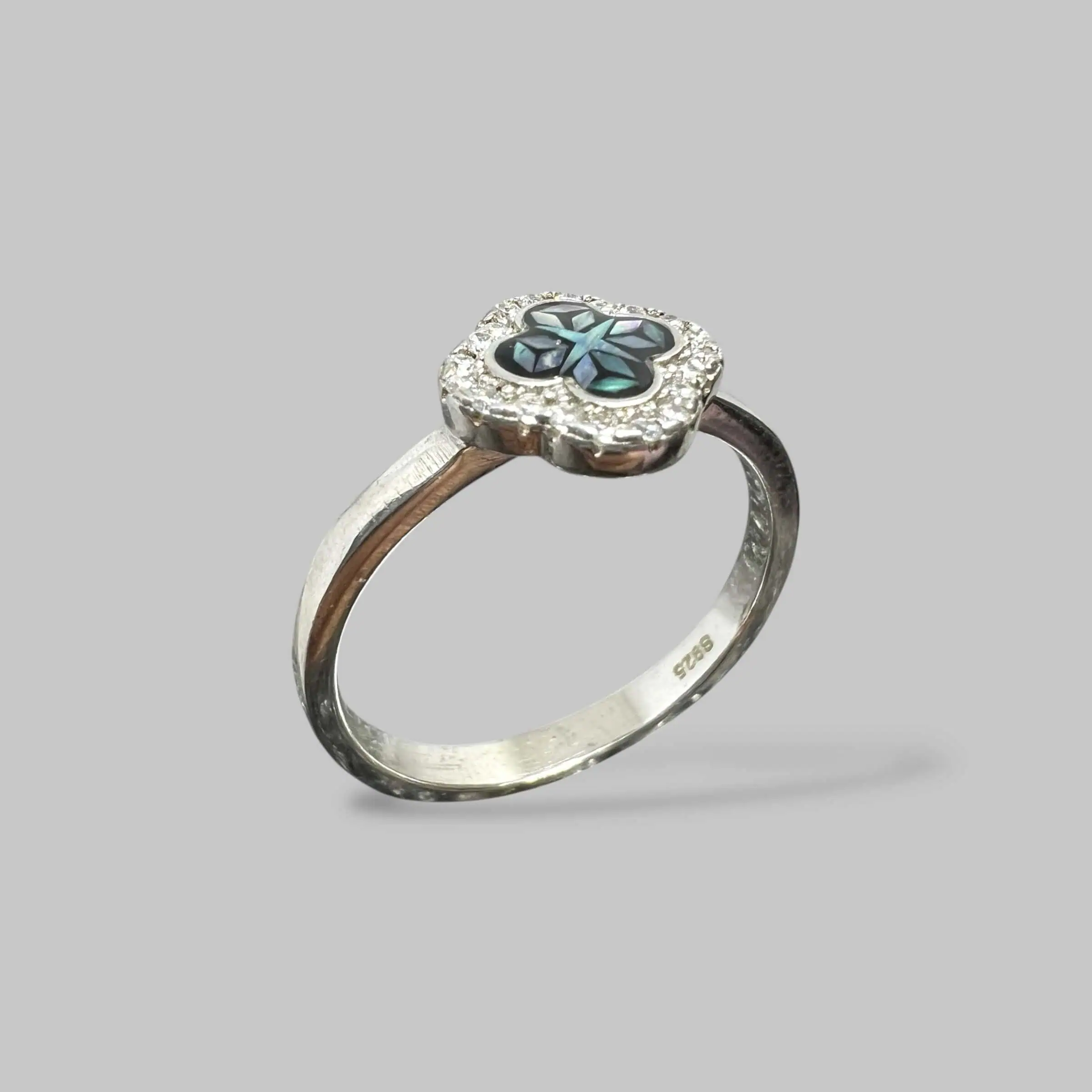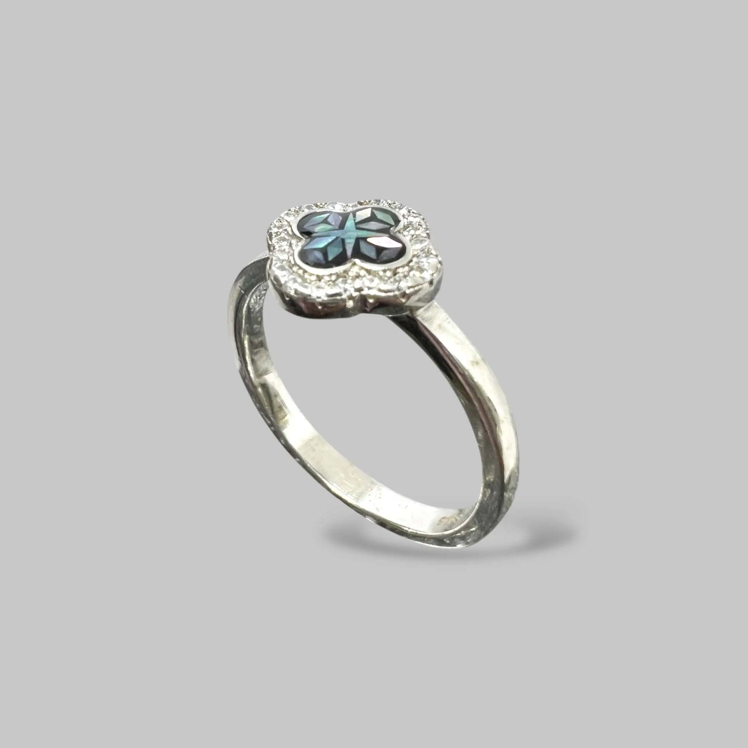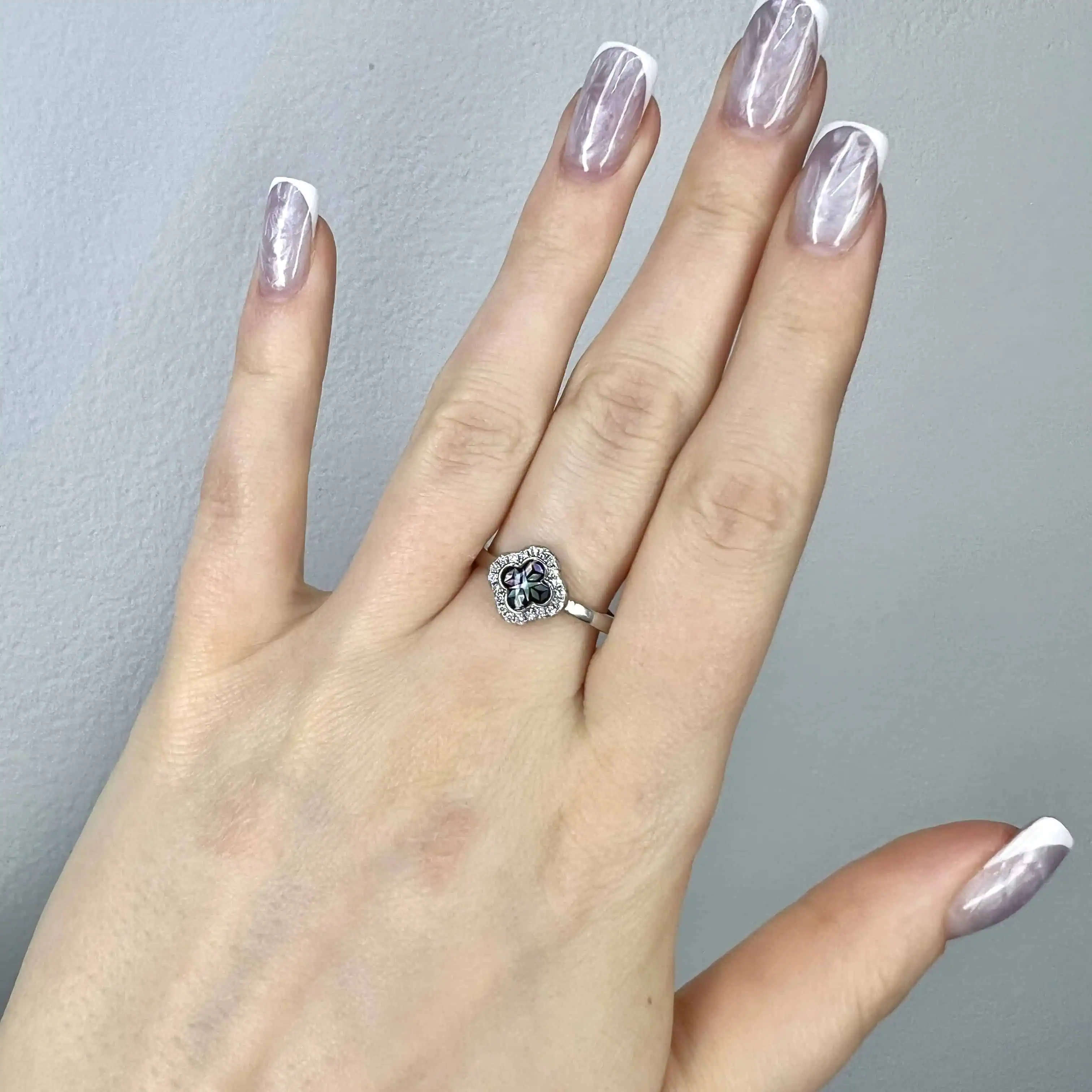 Елегантна срібна каблучка 925 проби з центральним елементом у формі чотирилистої конюшини. Пелюстки оздоблені темним перламутром з райдужним відливом та оточені мерехтливим німбом із цирконів.