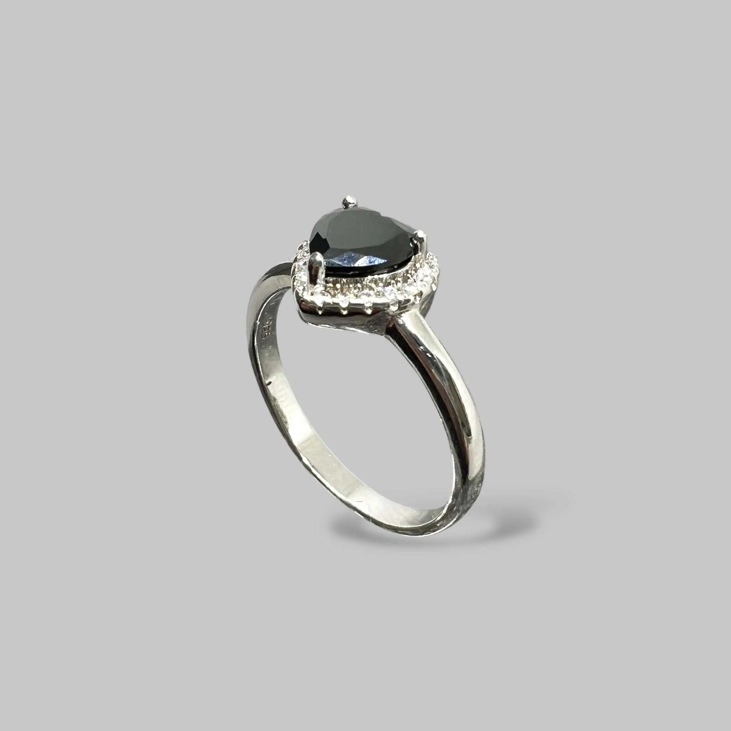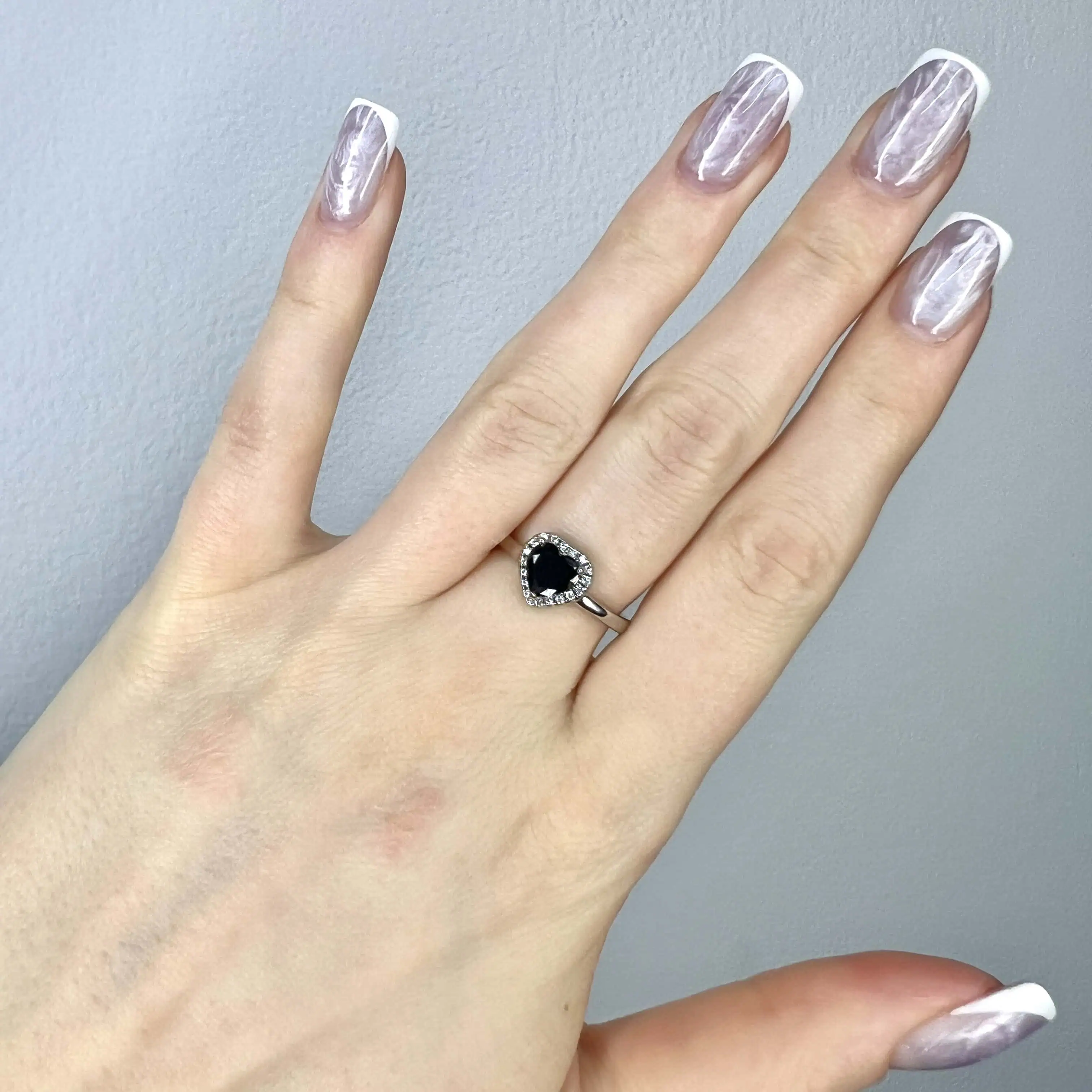 Ефектна срібна каблучка 925 проби з центральним каменем у формі чорного серця. Оправа, інкрустована дрібними прозорими цирконами, створює вишуканий контраст та підкреслює глибину кольору головного елемента.