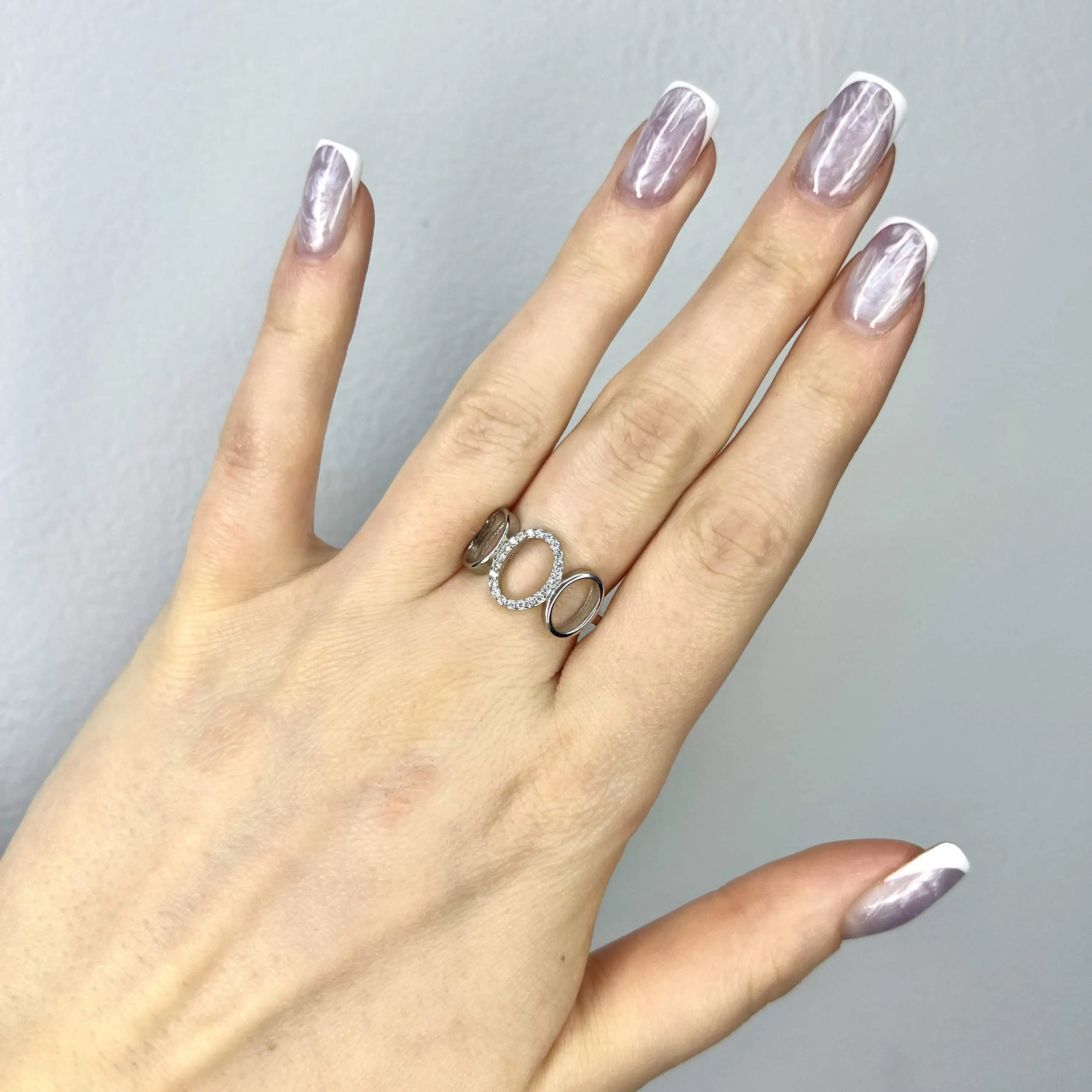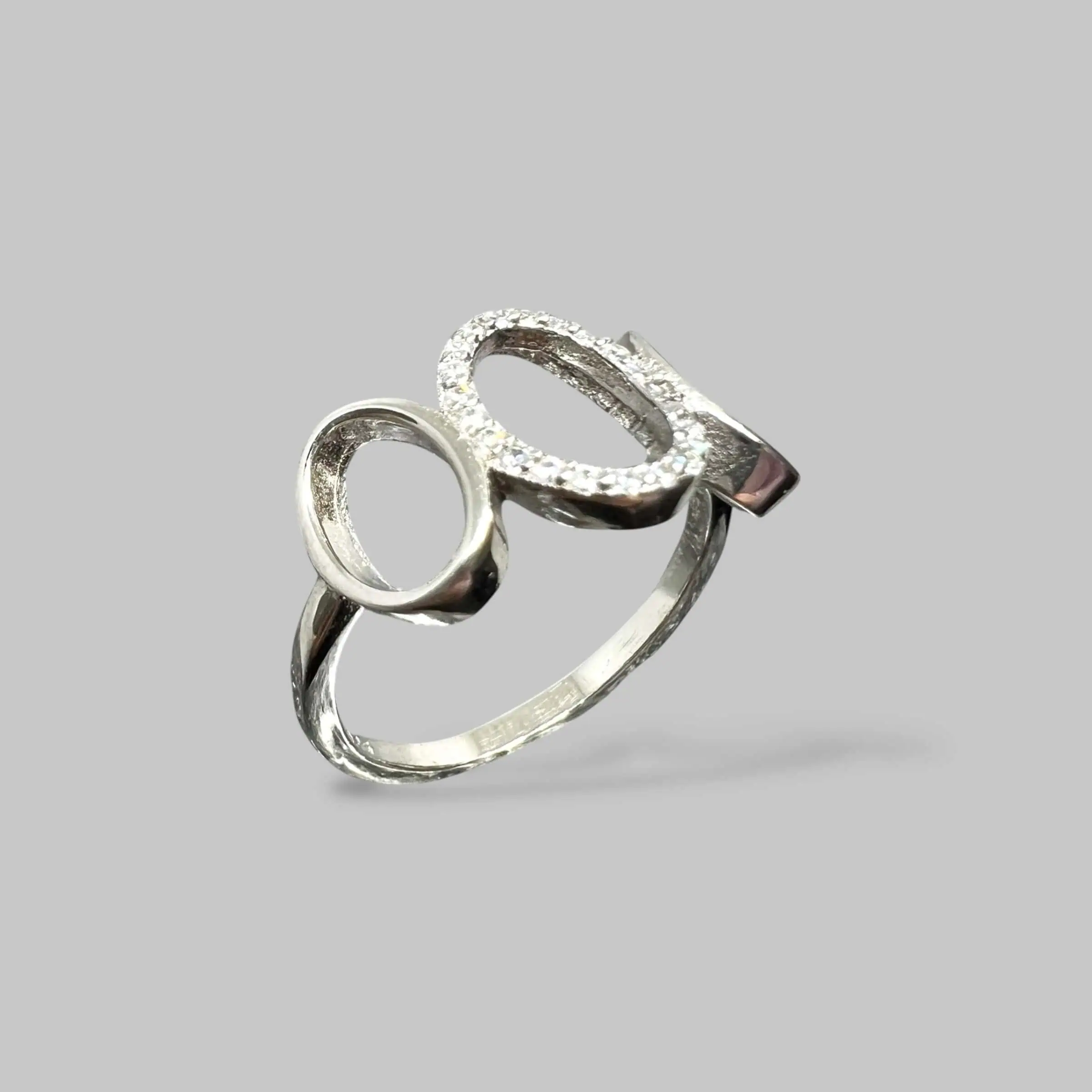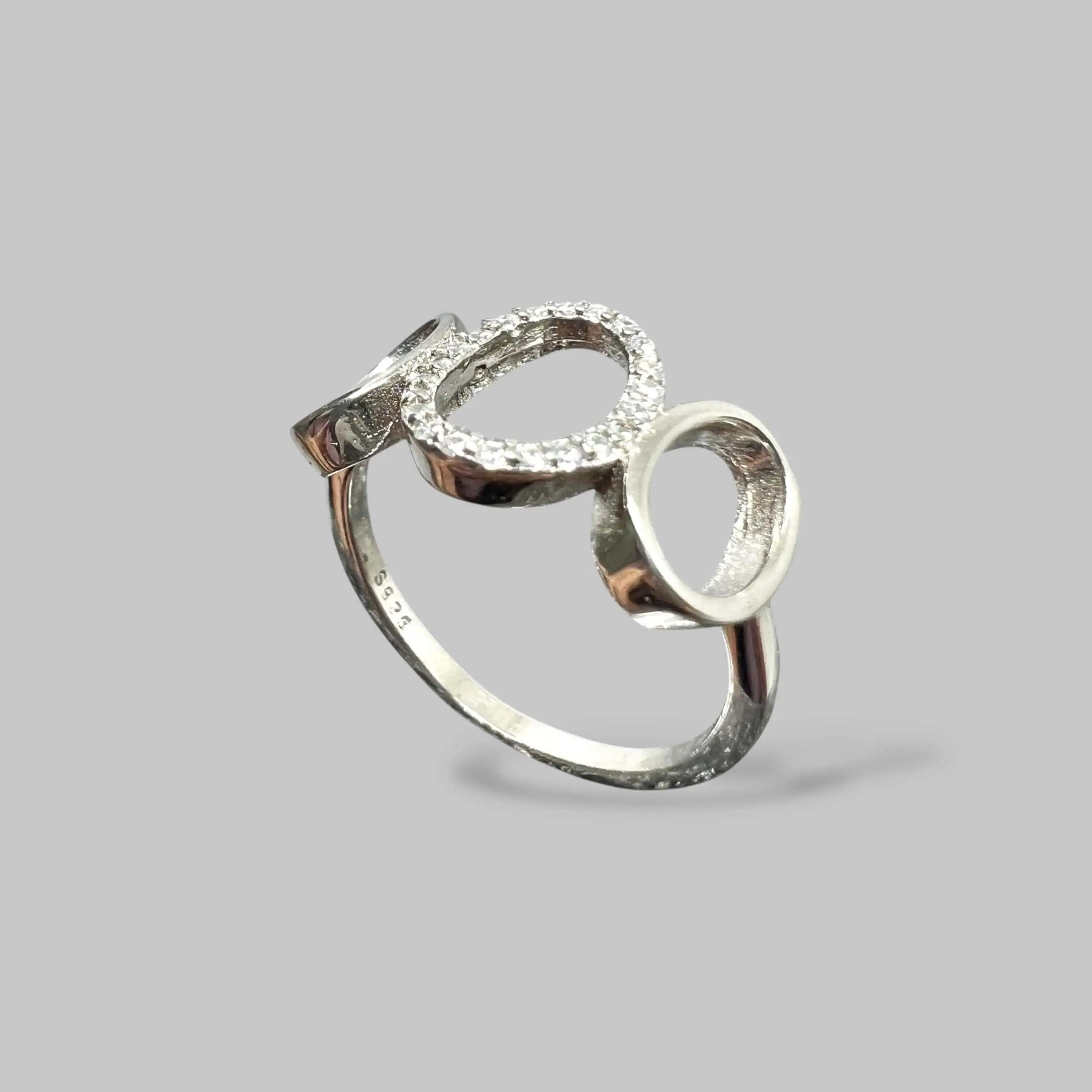 Оригінальна срібна каблучка 925 проби, що складається з трьох переплетених овальних контурів. Один з елементів інкрустований сяючими цирконами, що створює стильний об'єм та сучасний геометричний акцент.