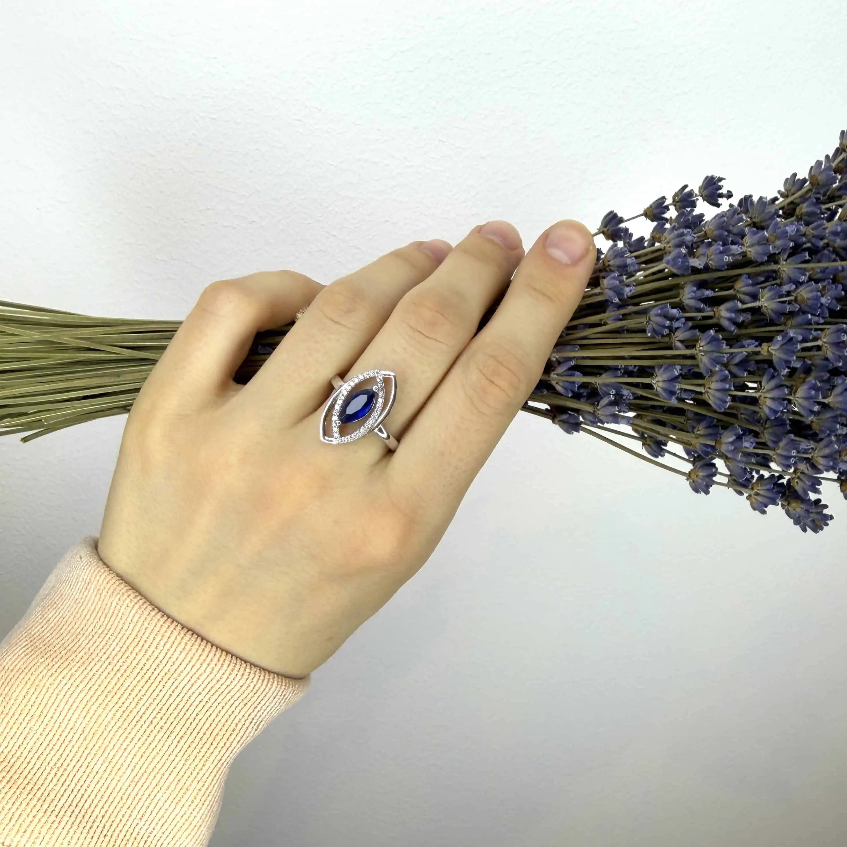 Срібна каблучка "Волошка" - прикраса з яскравим синім цирконом, ніжна та стильна, вона покрита родієм для блиску та стійкості від зносу.