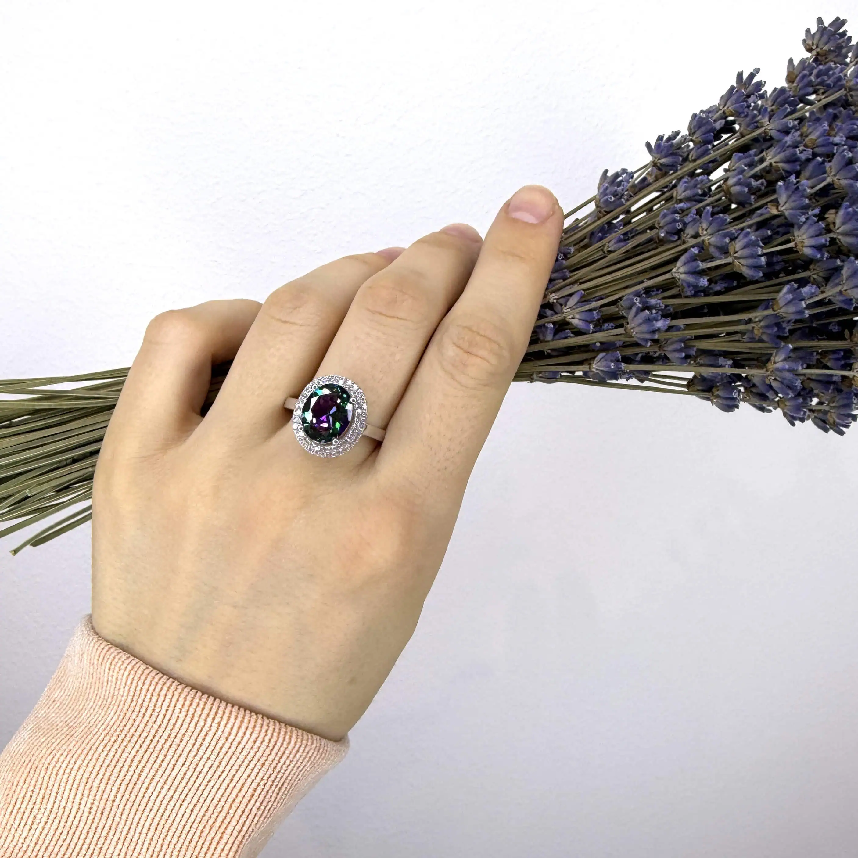 Срібна каблучка "Хіть" - це яскрава прикраса з центральним каменем містик-топазом, покрита родієм для блиску та стійкості від зносу.