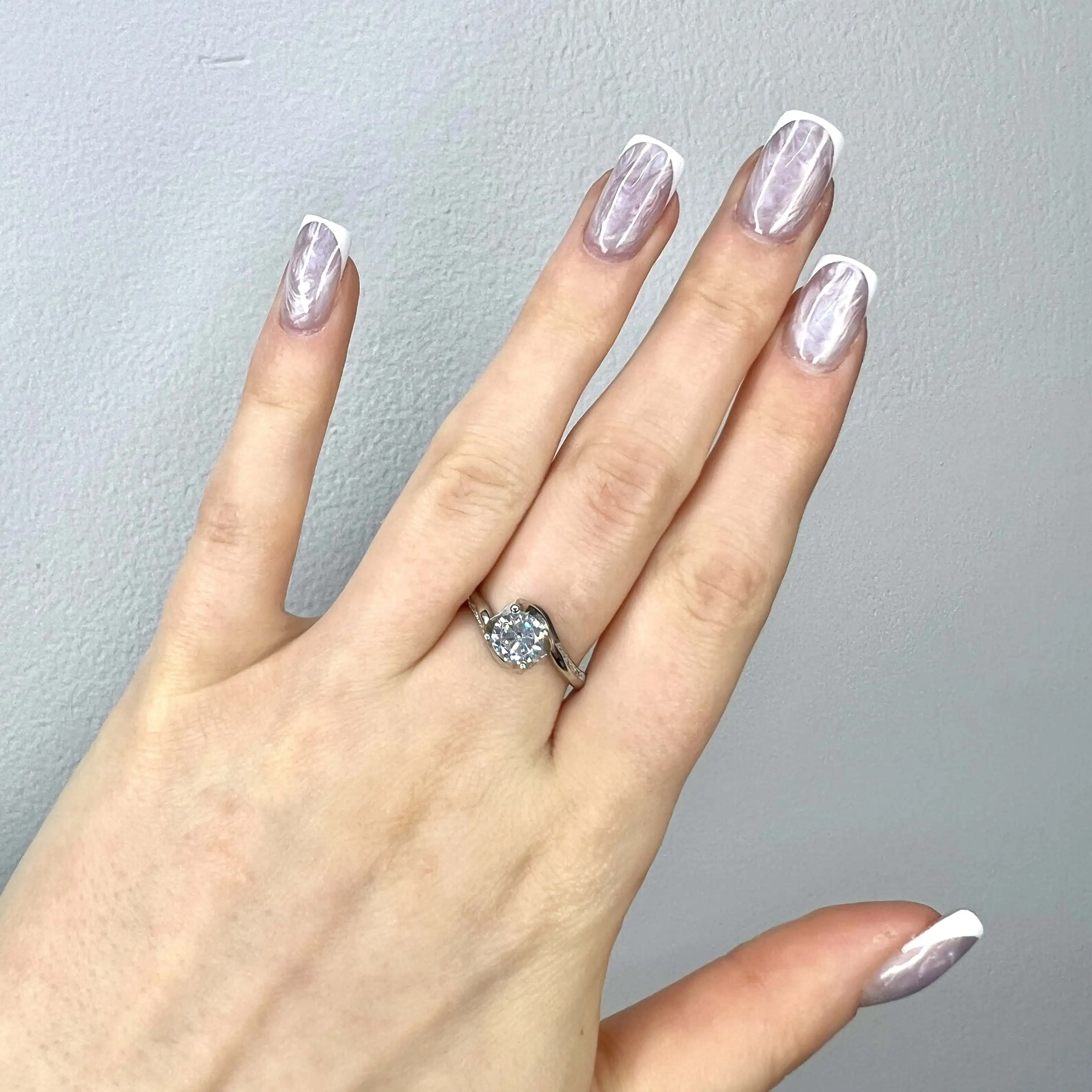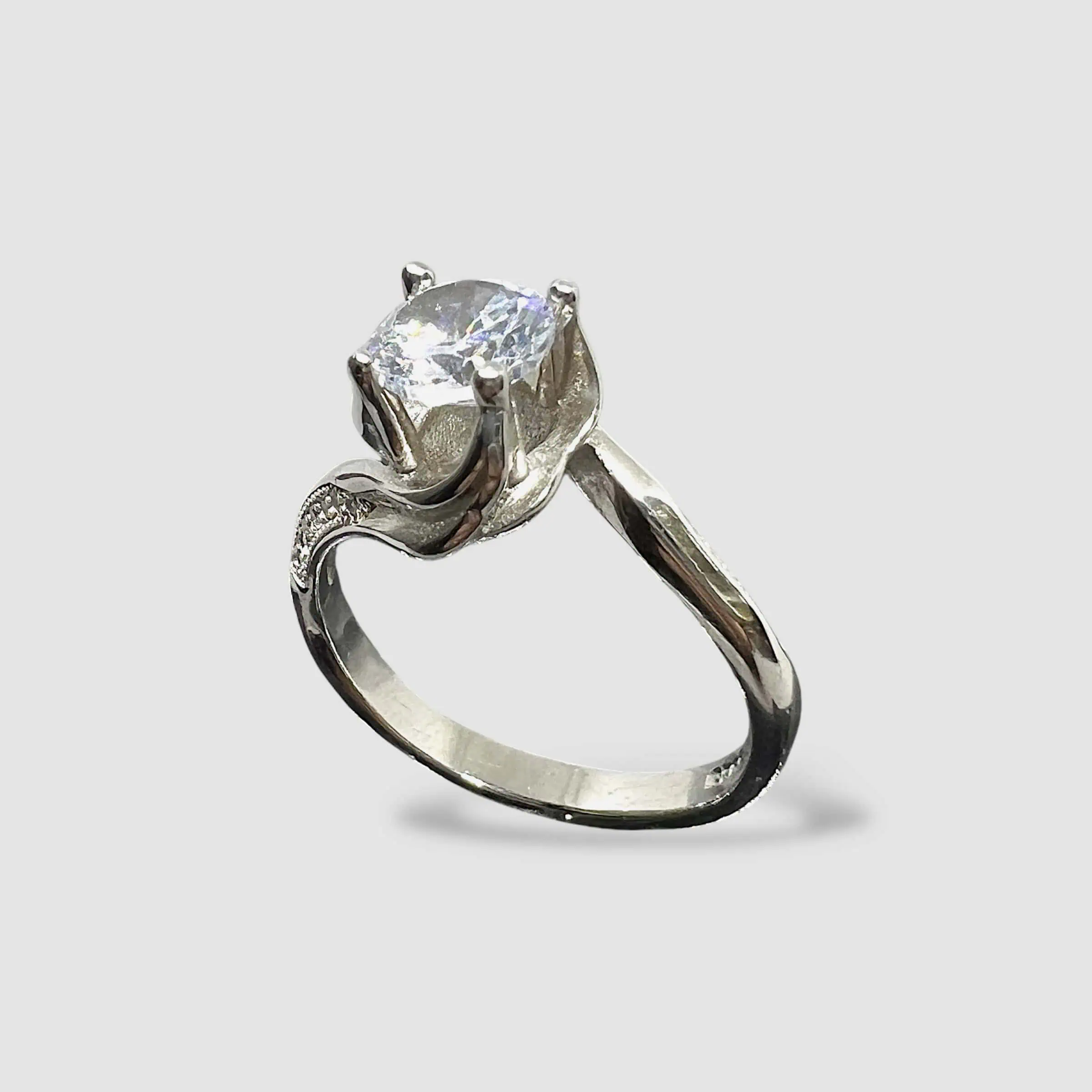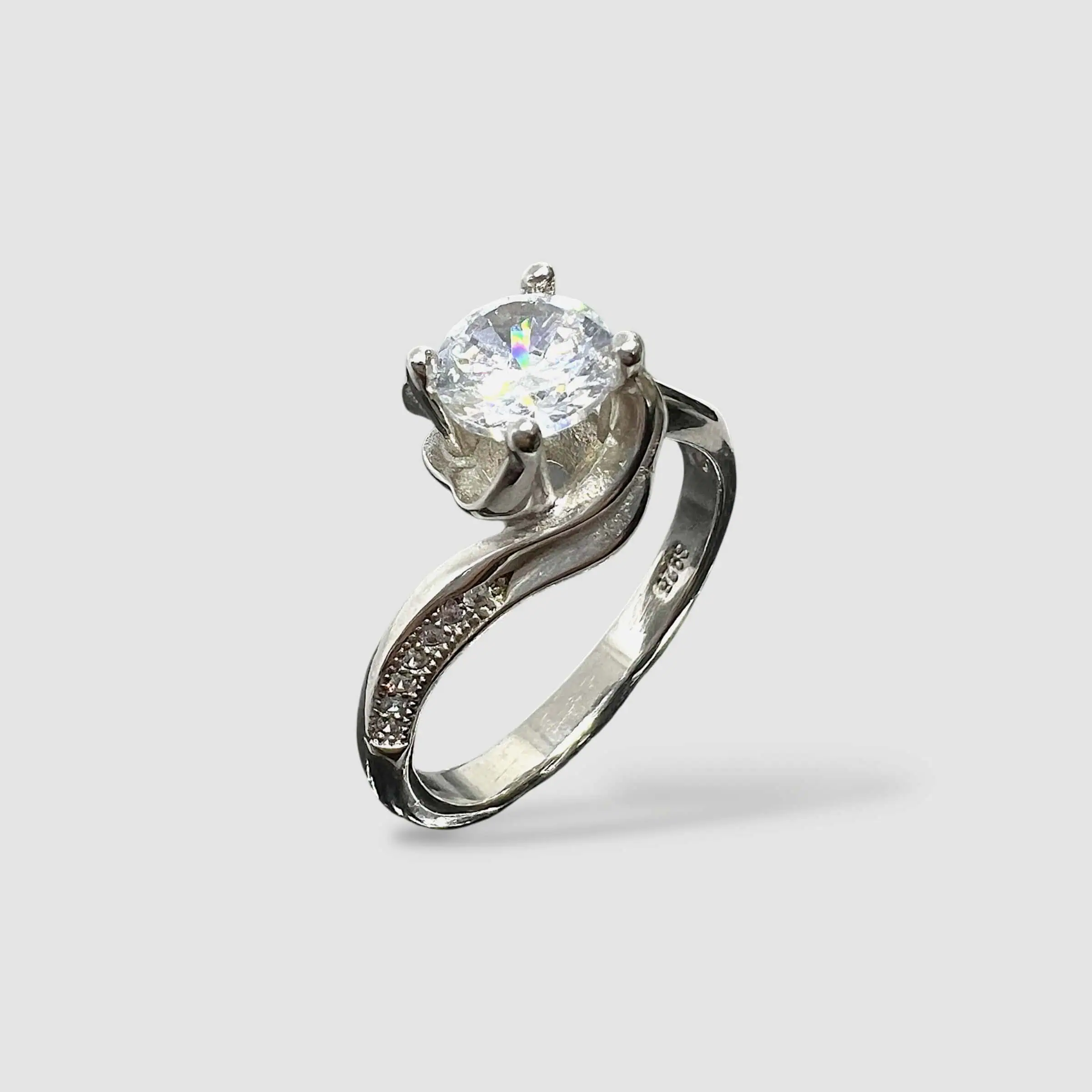 Витончена срібна каблучка 925 проби, що вирізняється своїми плавними, асиметричними лініями. Шинка виробу має оригінальну вигнуту форму, яка м'яко охоплює центральний камінь, створюючи відчуття динаміки та легкості.