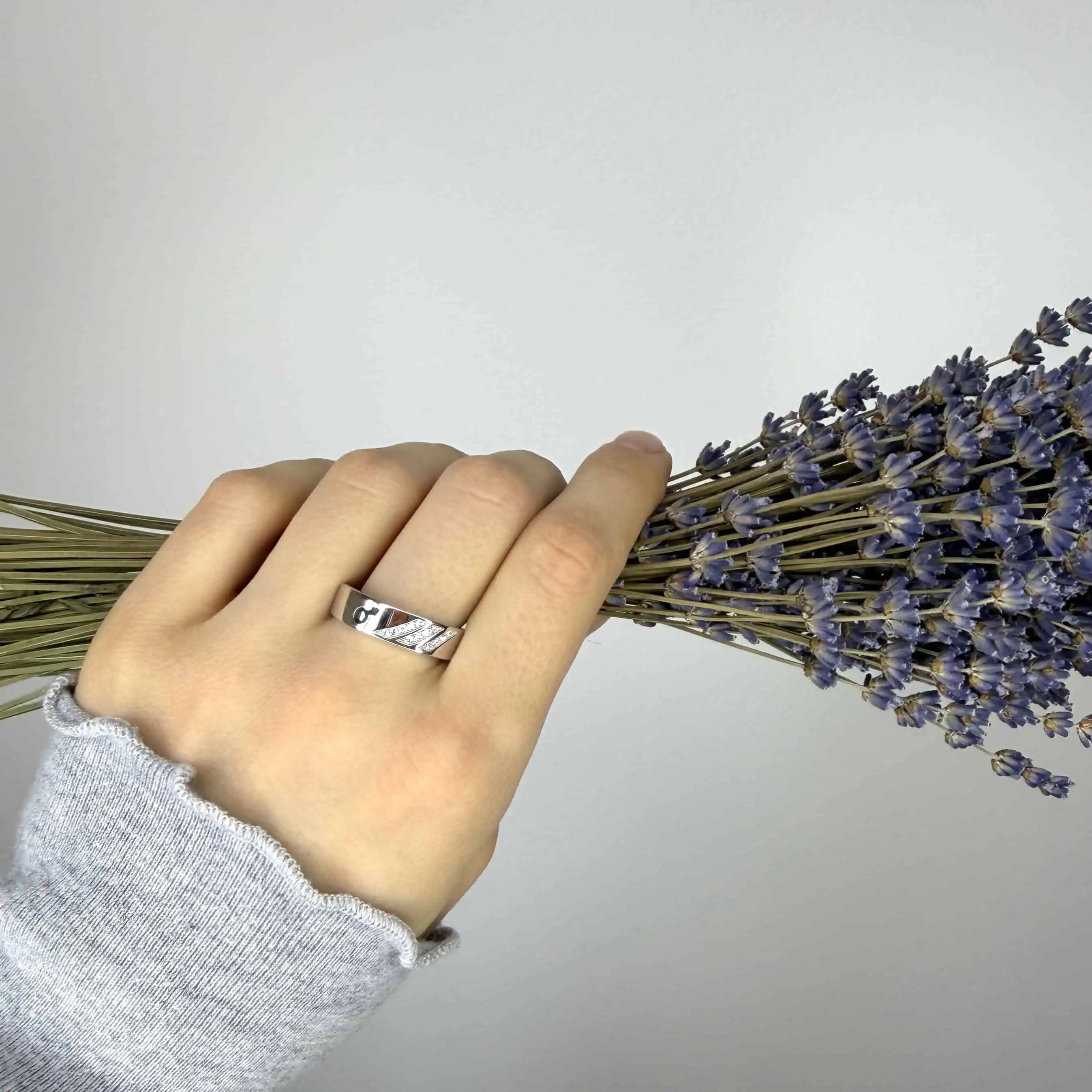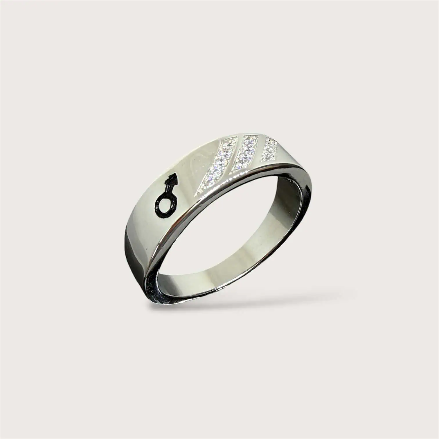 Срібна каблучка "Знак Чоловіка" - це каблучка, виконана в благородному металі, простої форми з акцентним знаком та цирконами. Покрита родієм для блиску і стійкості до зносу.