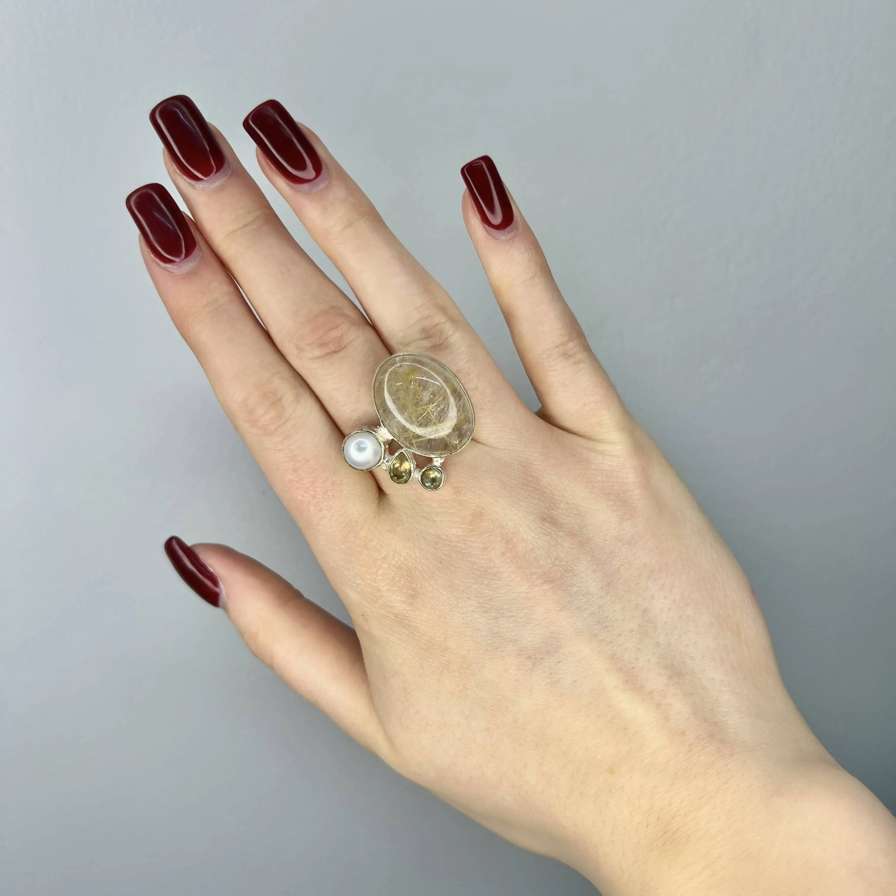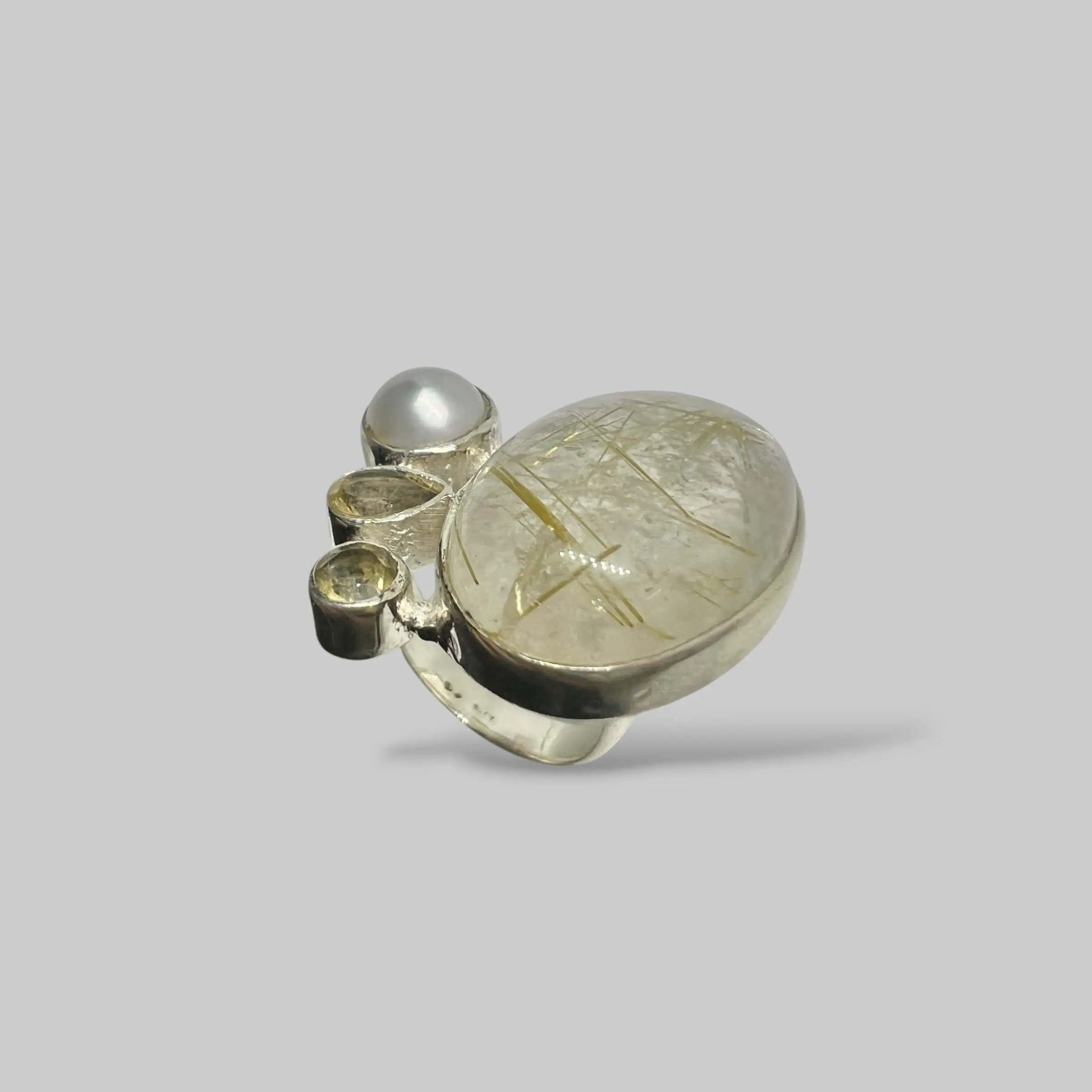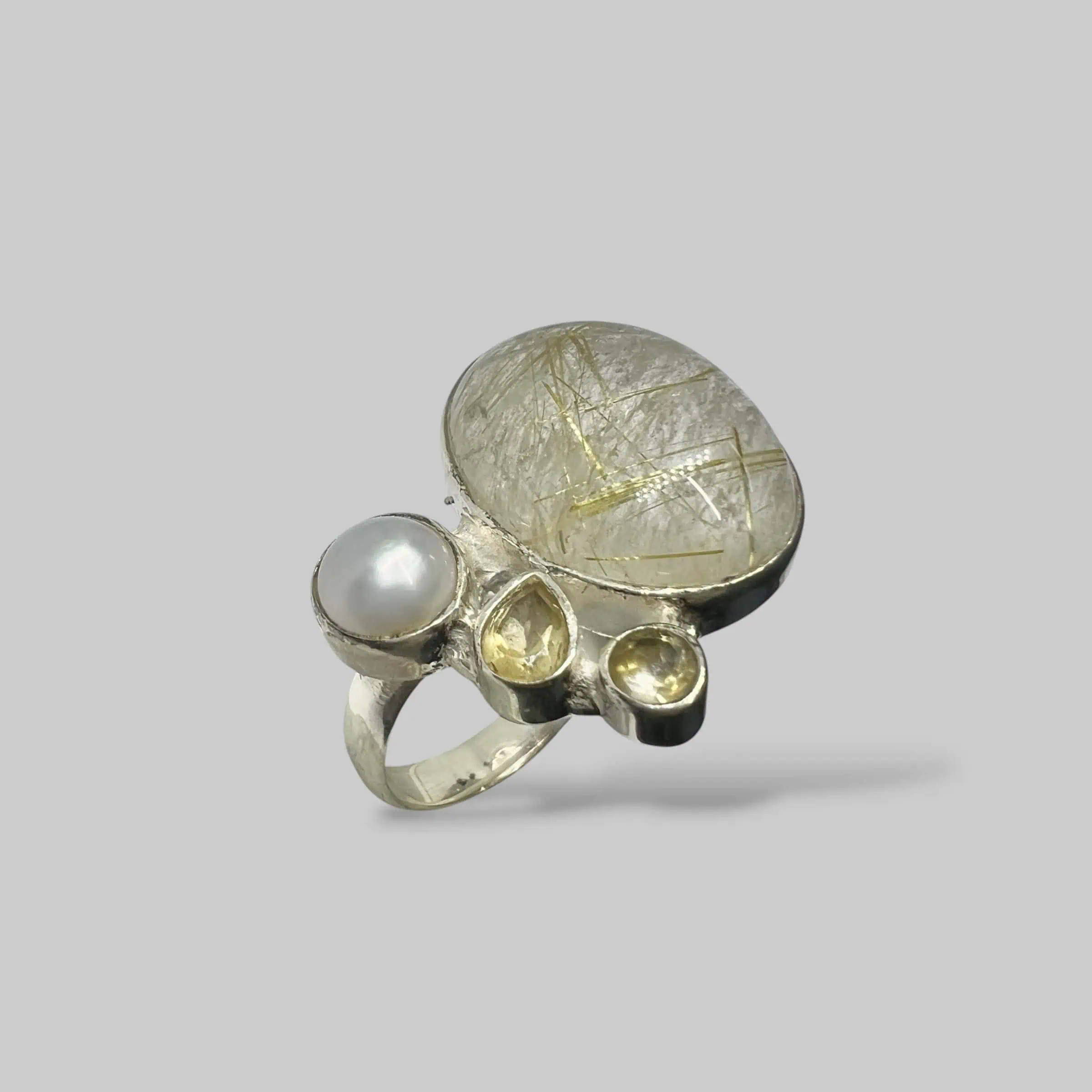 Масивна каблучка в етно-стилі. Головний акцент — кварц із включеннями рутилу. Асиметрична композиція з штучними перлами та цирконами додає виробу шарму.