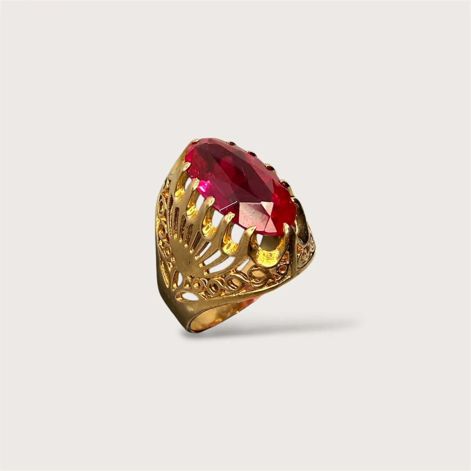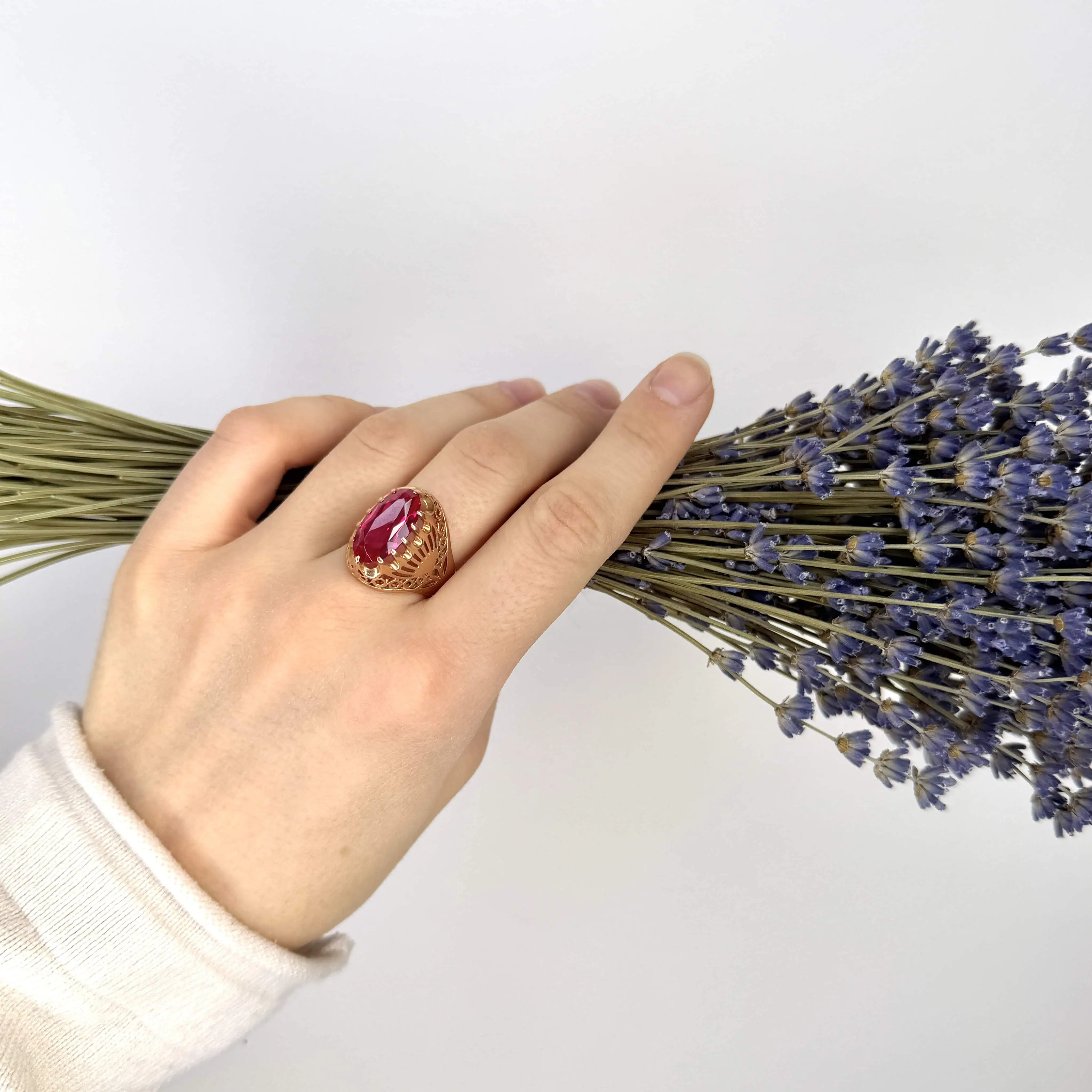 Золота каблучка "Бабусина Шкатулка" - це справжній вінтаж. Центральний камінь яскраво малиновий корунд.