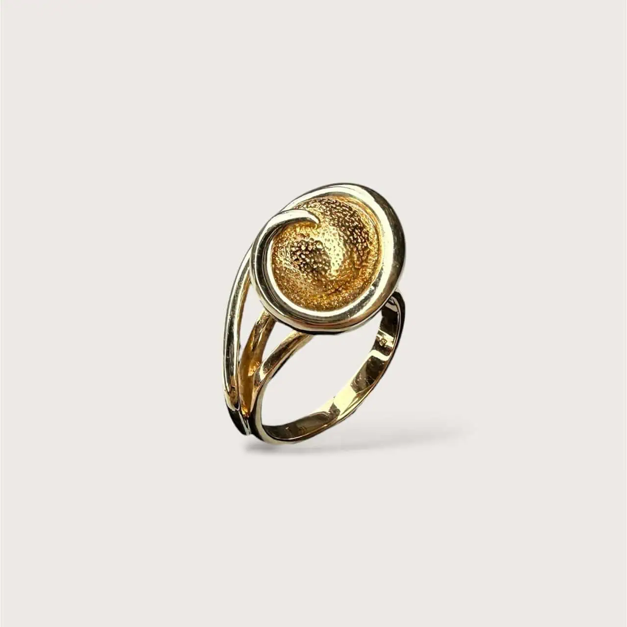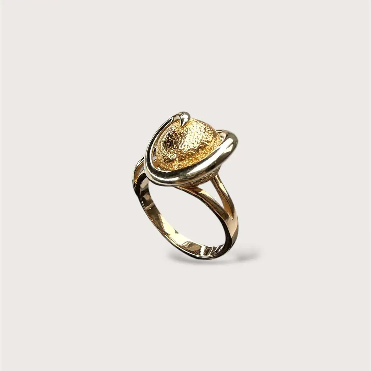 Золота каблучка "Коловорот" - це фактурна золота куля, охоплена плавною лінією що створює відчуття невпинного руху і глибини.