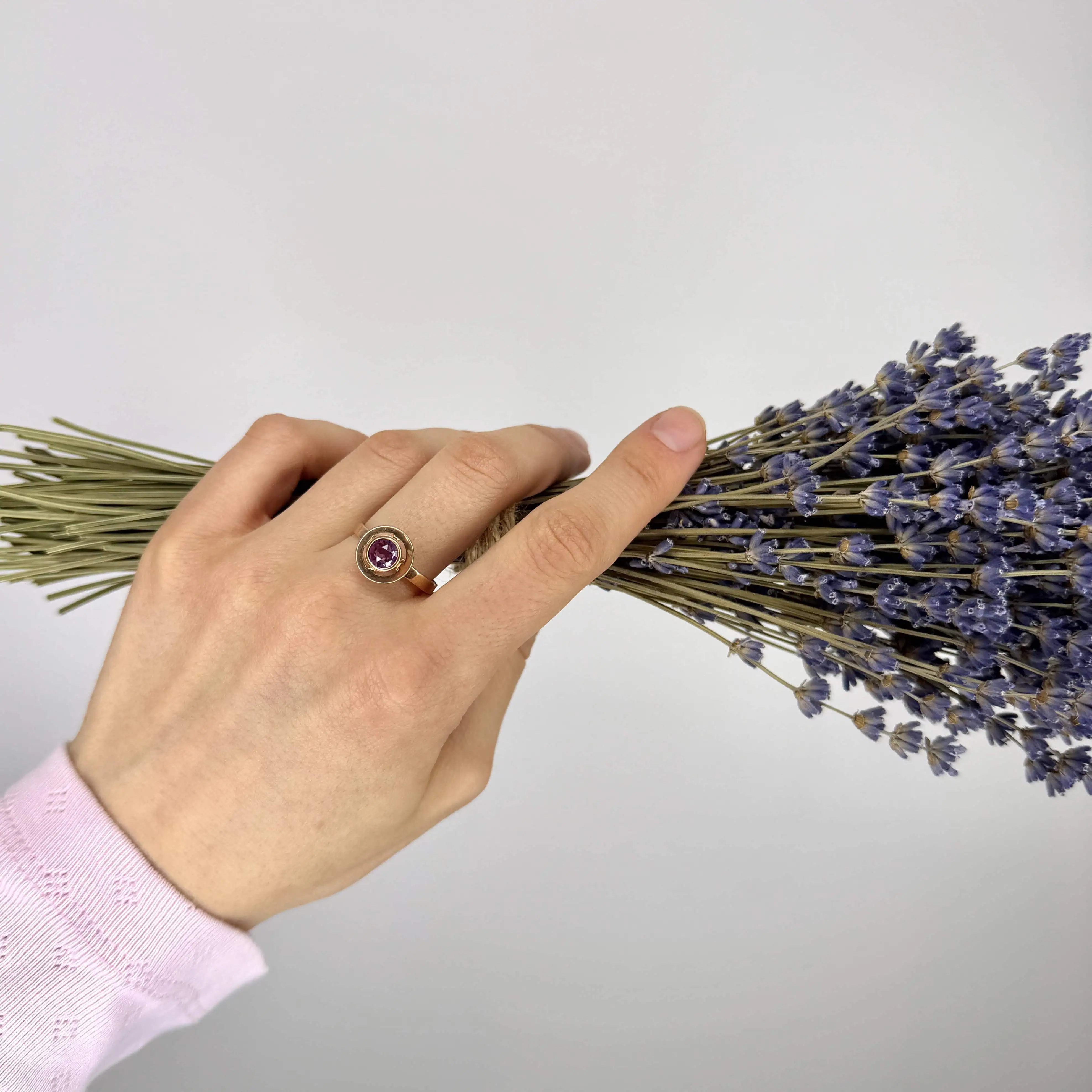Золота каблучка "Орбіта" з яскравим фіолетовим каменем, буде гарним акцентом на вашому пальці.