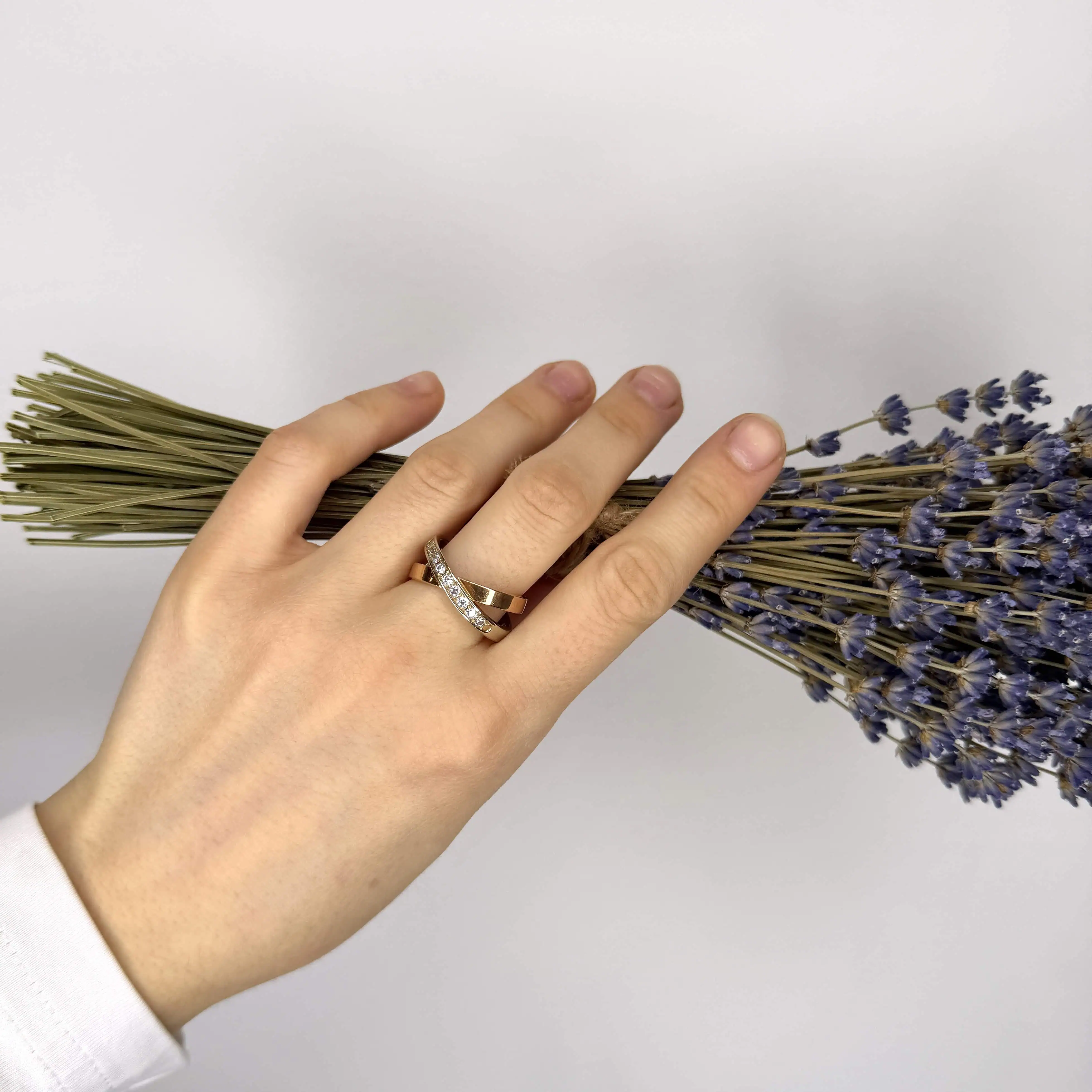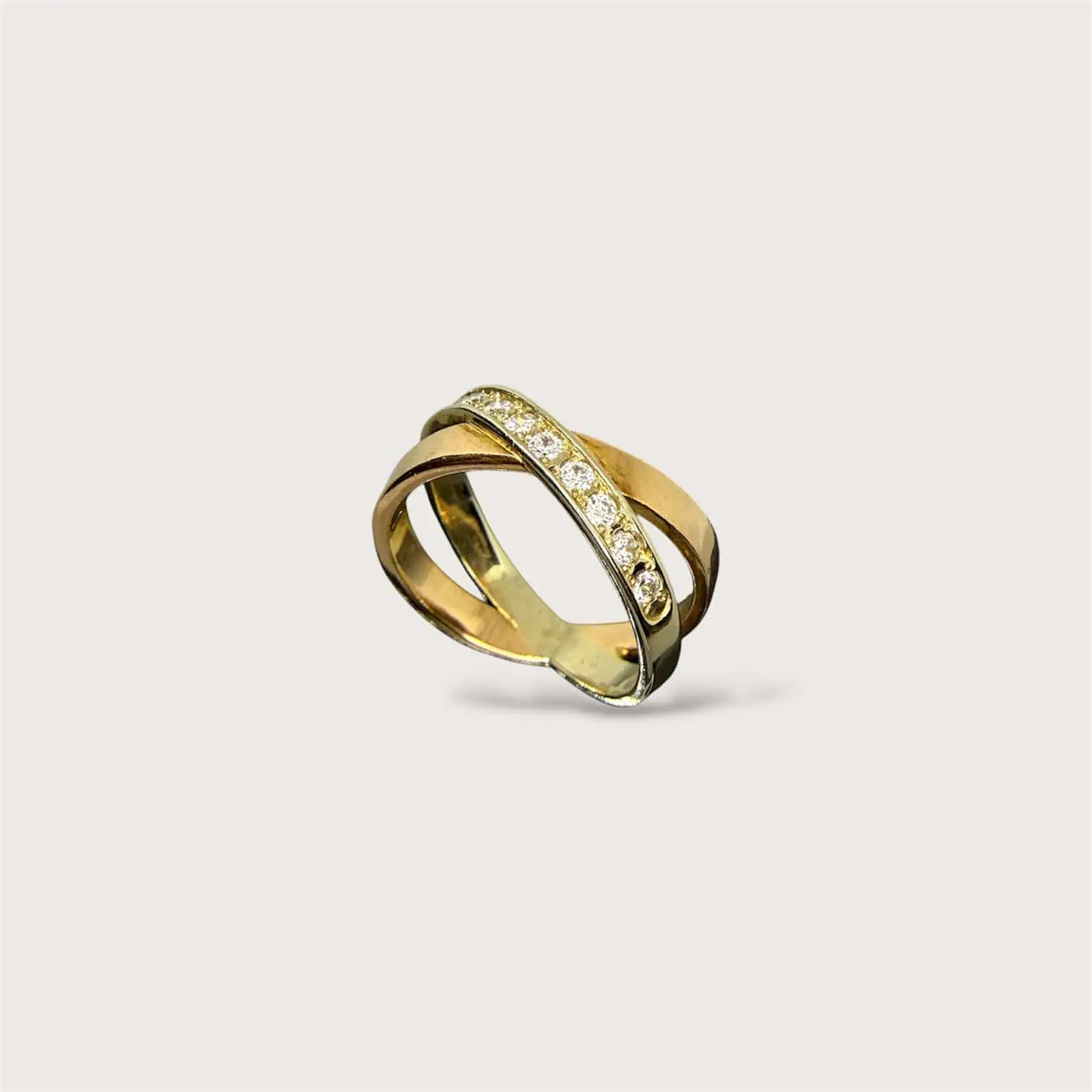 Золота каблучка "Перехрестя" - це прикраса, створена з двох видів золота та всіяна яскравими цирконами.