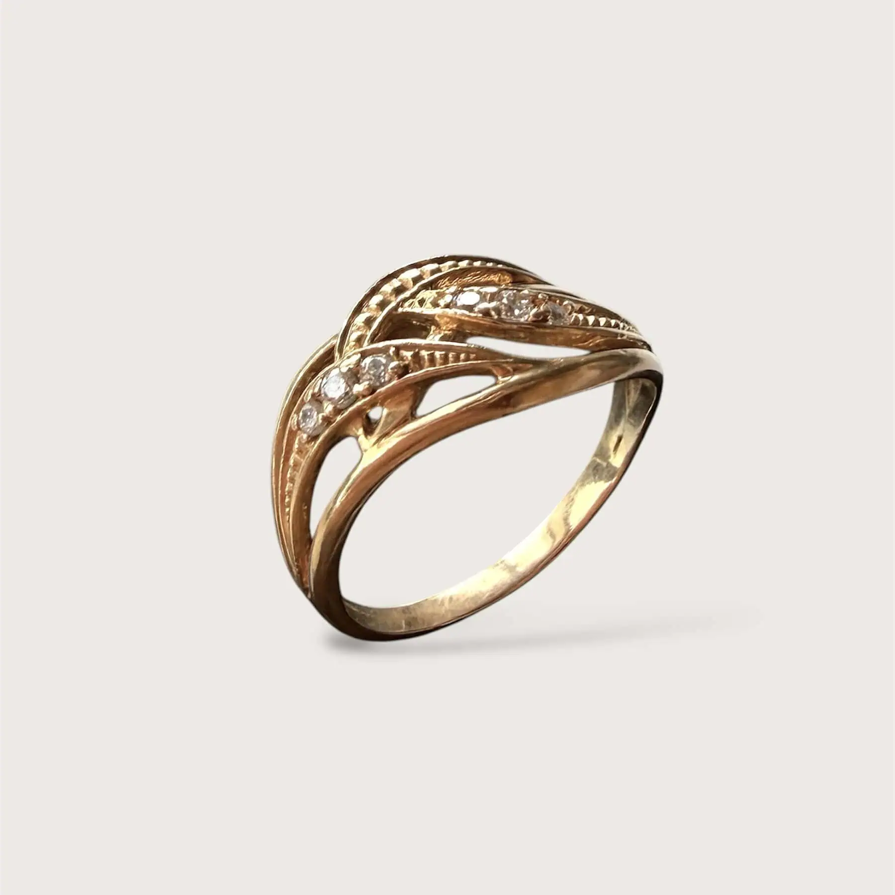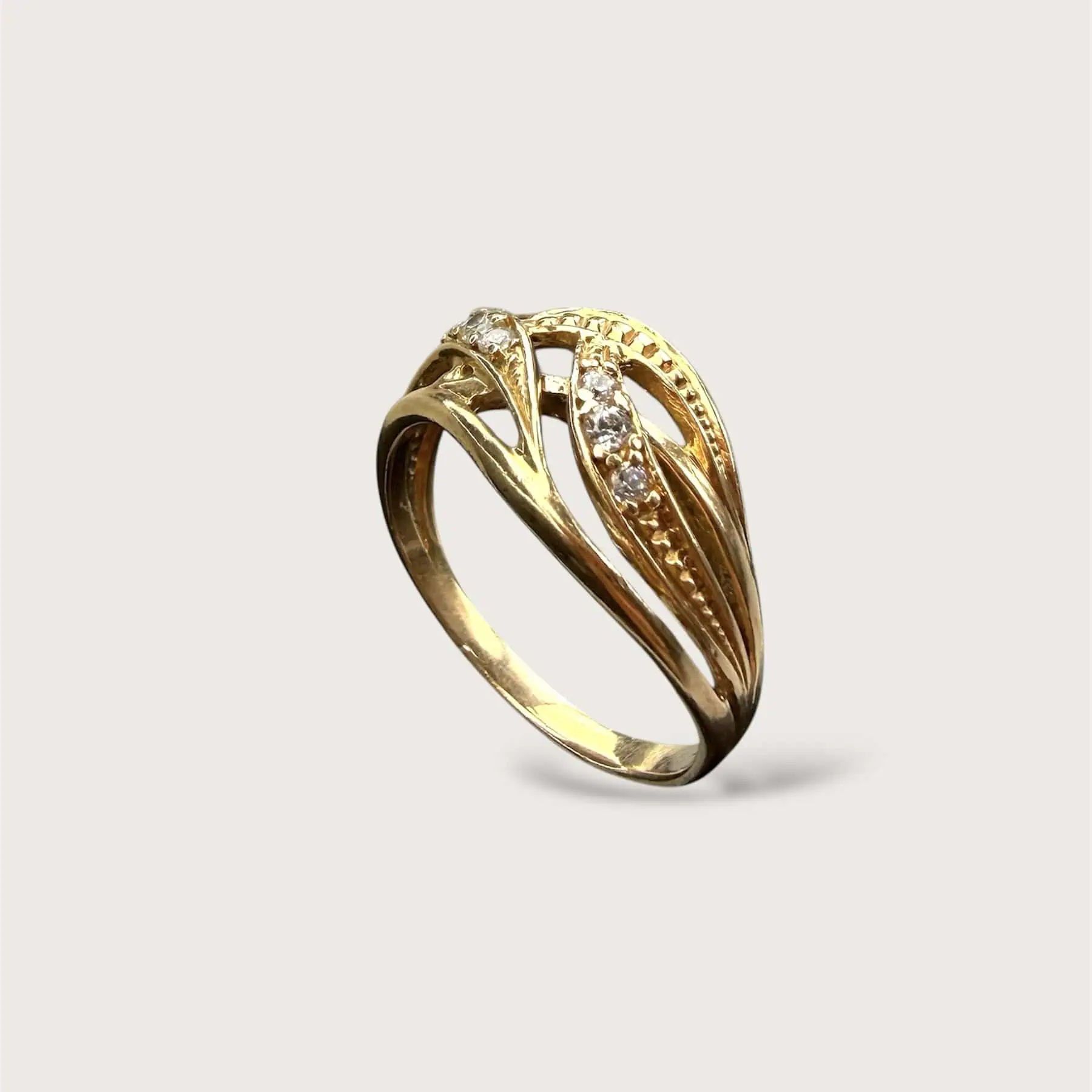 Золота каблучка "Приємні Перепитії" - це переплетення ліній, що інкрустовані сяючими камінцями. Каблучка виглядає ніжно та елегантно.