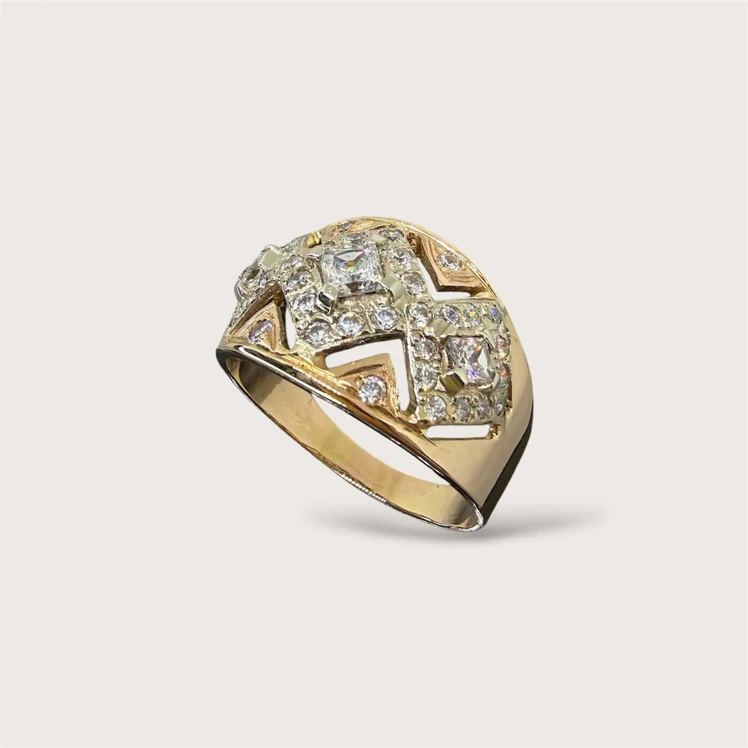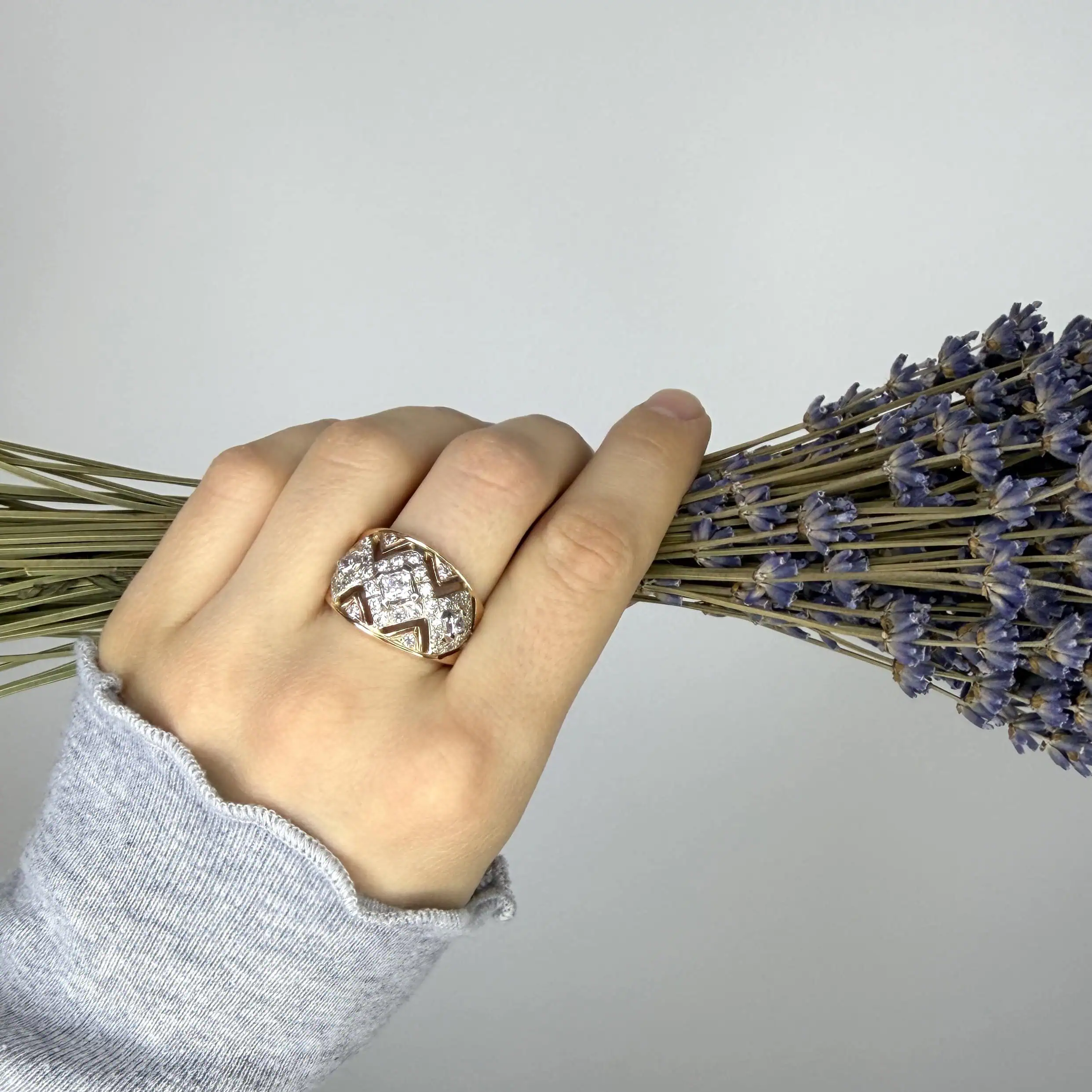 Золота каблучка "Ромб" - це прикраса поєднання двох кольорів золота, червоного та білого, з яскравими цирконами різної форми.