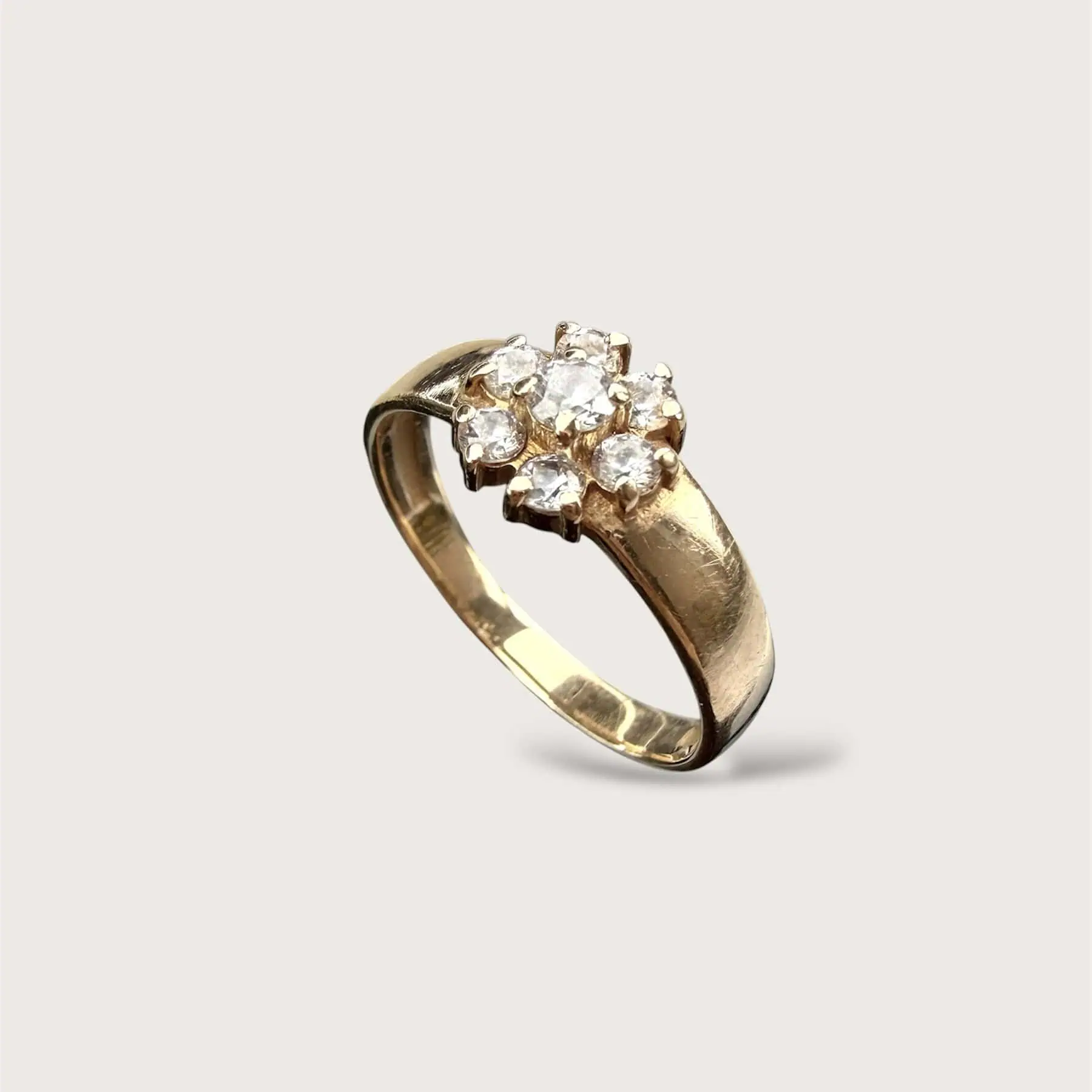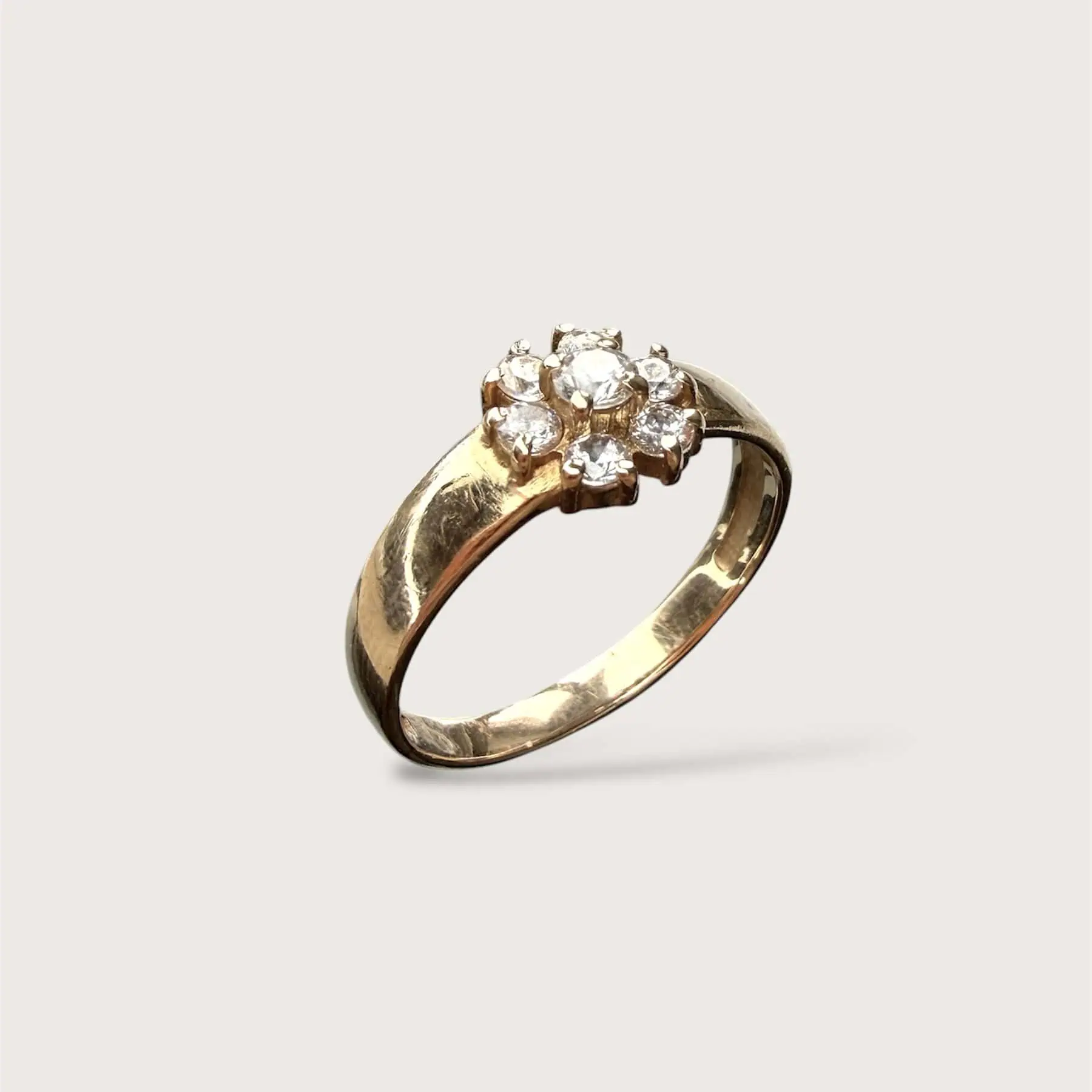 Золота каблучка "Ти квітка" з сяючими цирконами, що викладені у формі квітки. Весняна, легка прикраса, що не перевантажує образ.