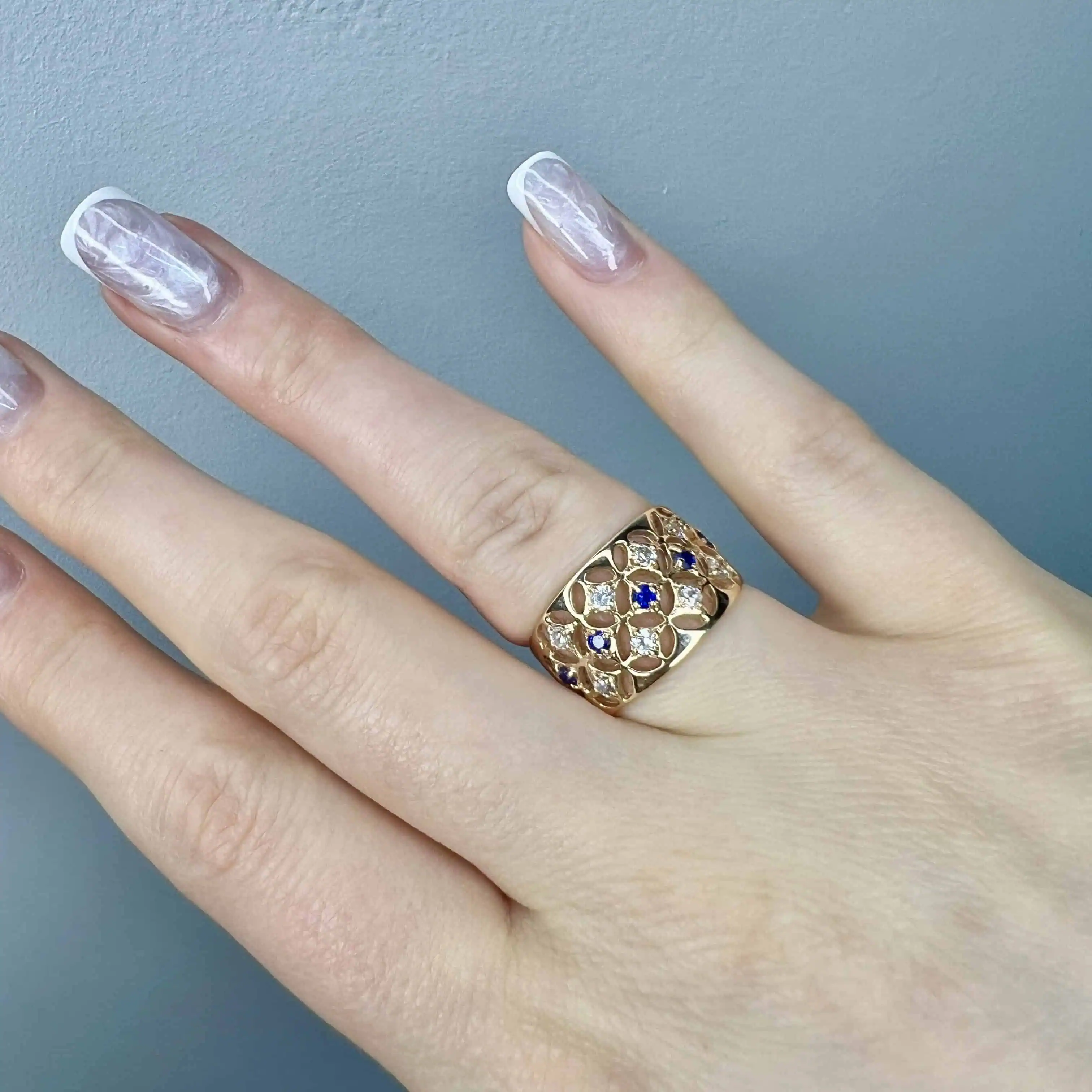 Вишукана срібна каблучка з великим центральним каменем, оточеним сяючим ореолом із дрібних цирконів. Подвійна інкрустована шинка додає прикрасі особливого об'єму та статусності, створюючи розкішний образ.