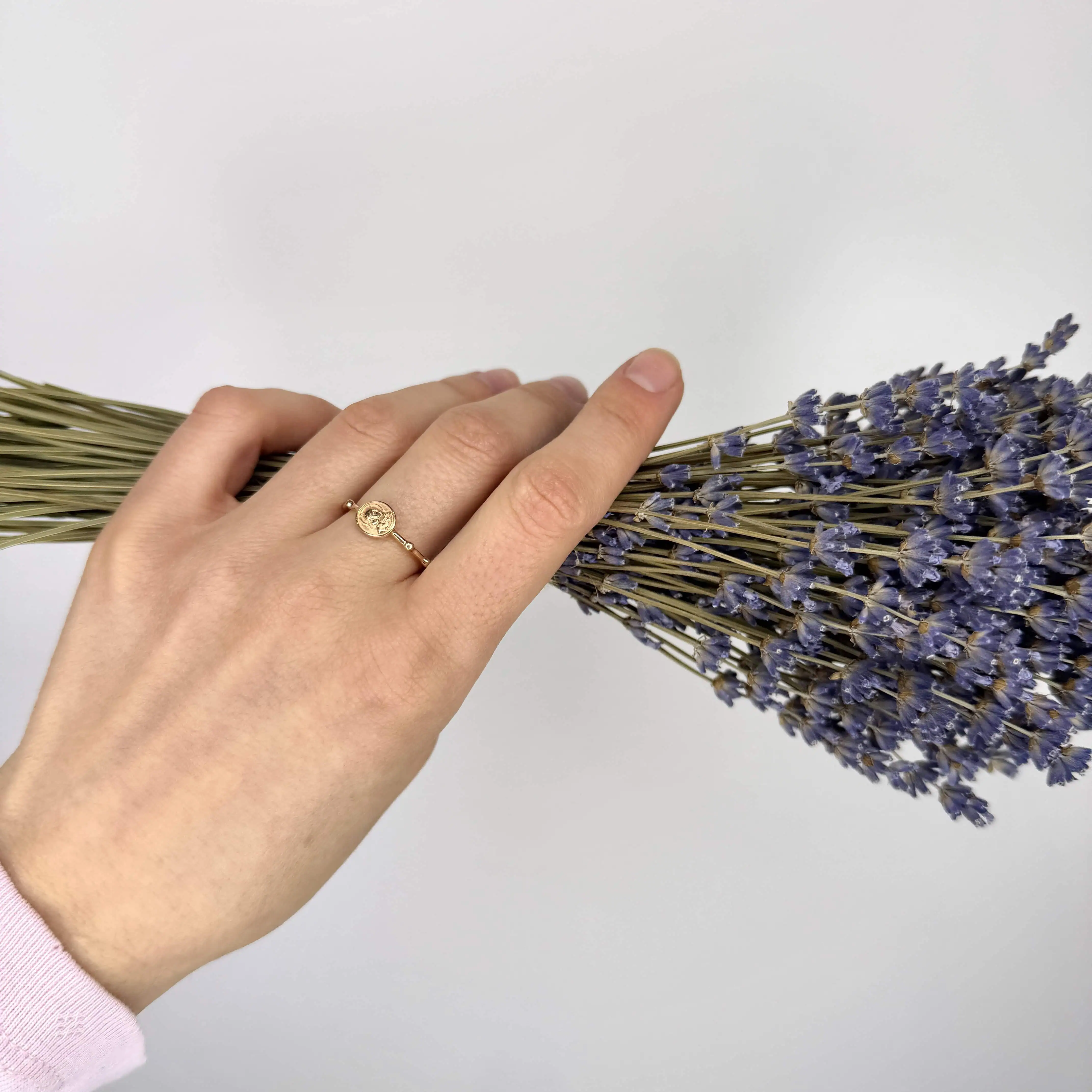 Золота каблучка "Вервечка" з образом Божої Матері виконана в червоному золоті.