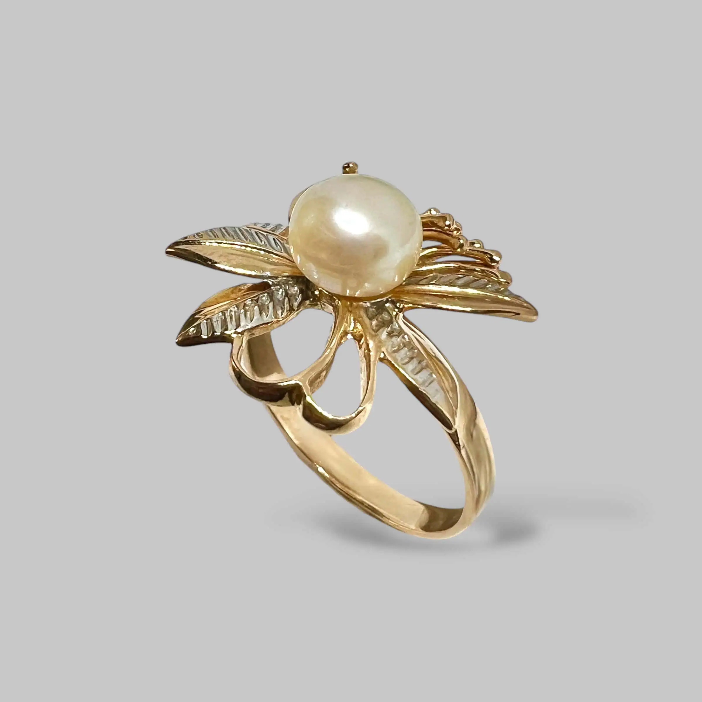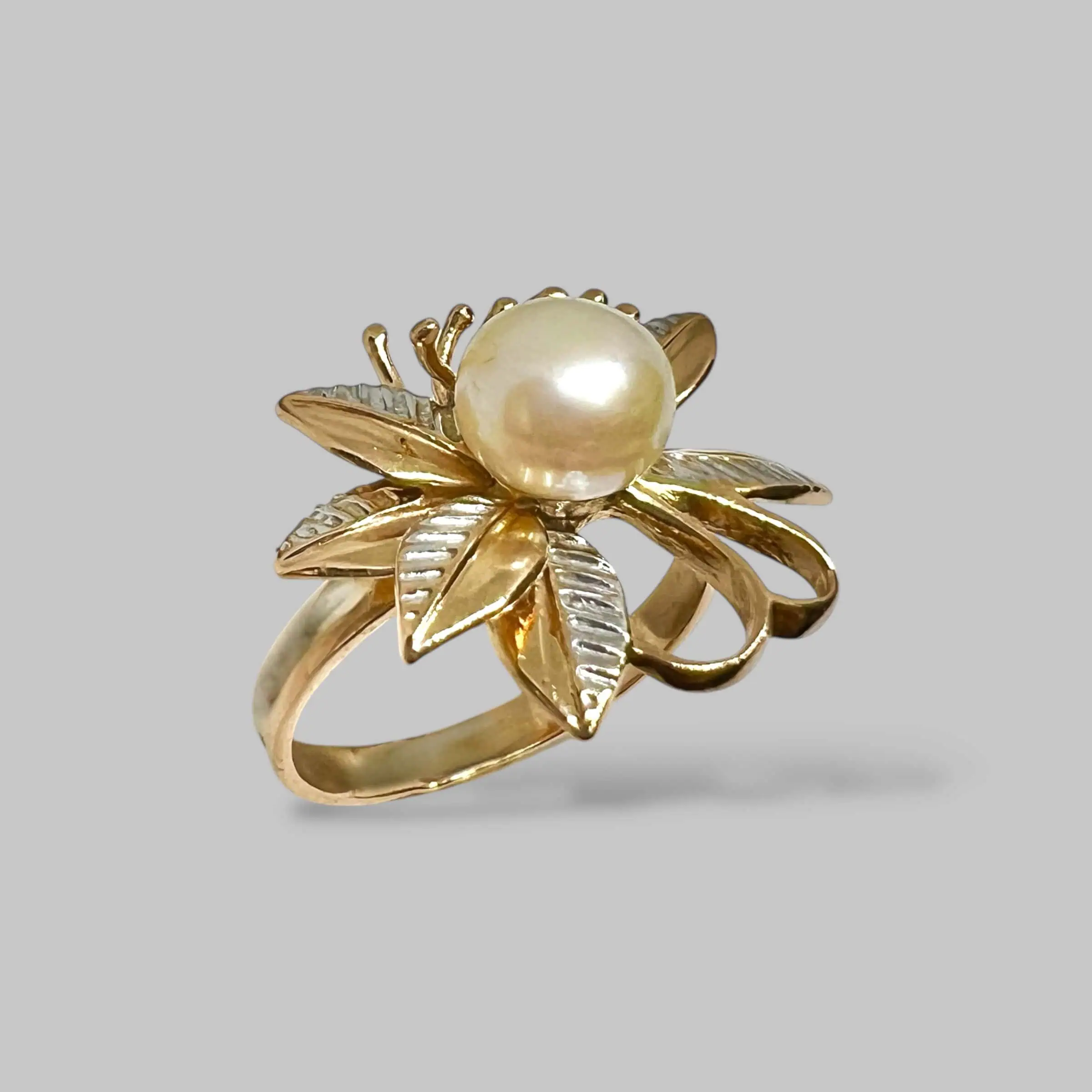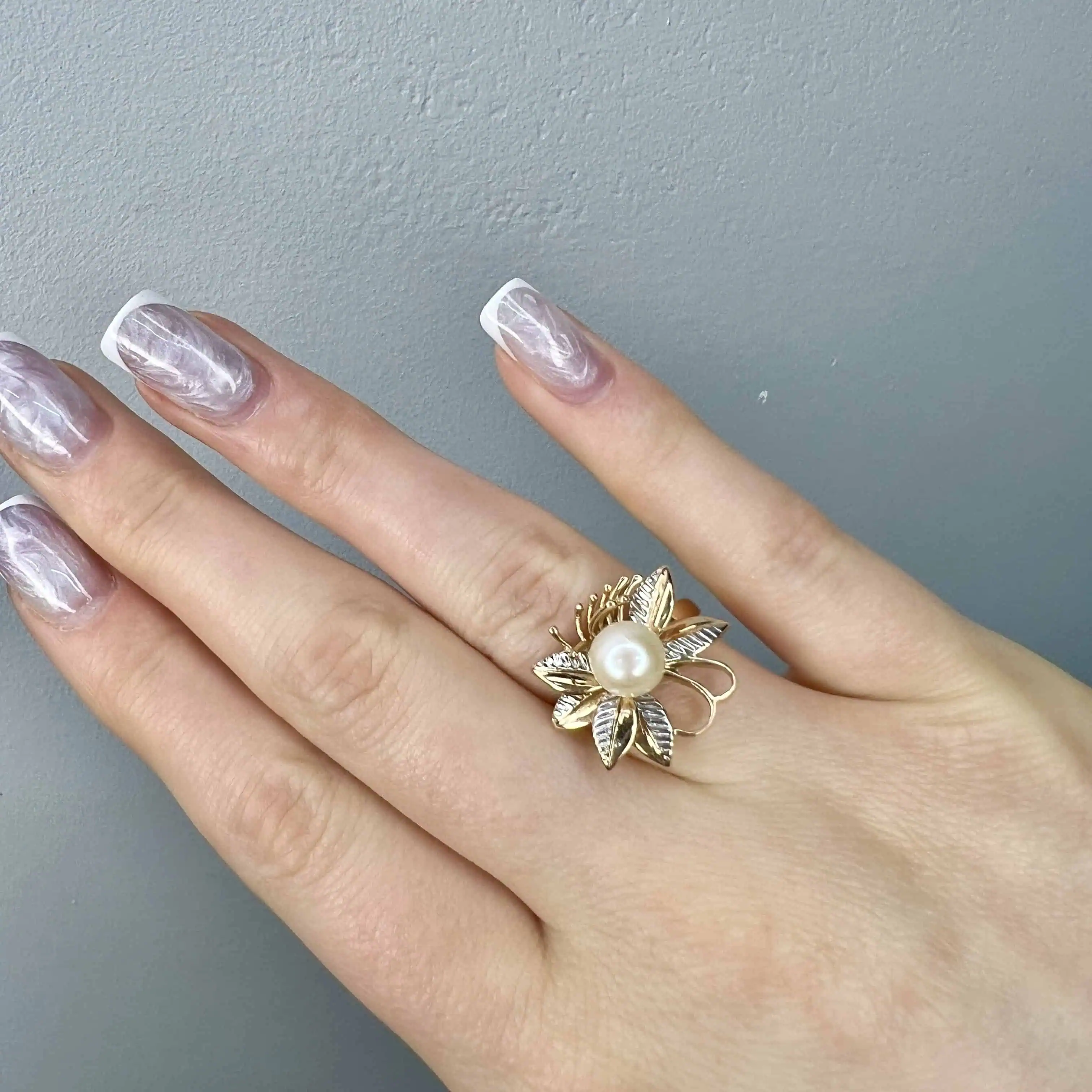 Вишукана золота каблука з великою перлиною в центрі, обрамленою фактурними золотими та срібними листочками. Складний ювелірний дизайн створює ефектний об'ємний образ.