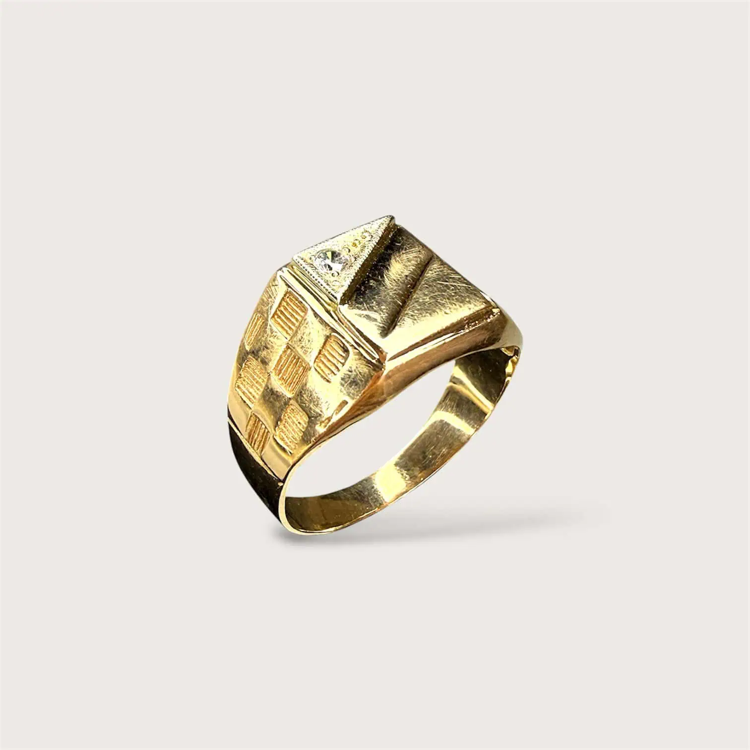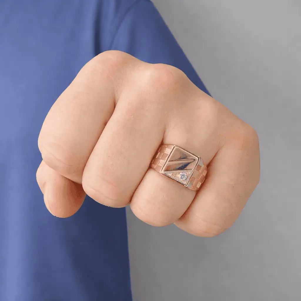 Золота печатка "Шахи" виготовлена з двох видів золота, має стильну форму та акцентний циркон.